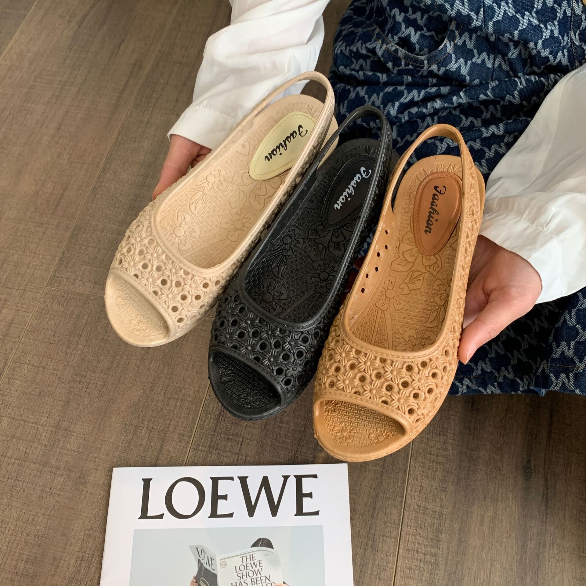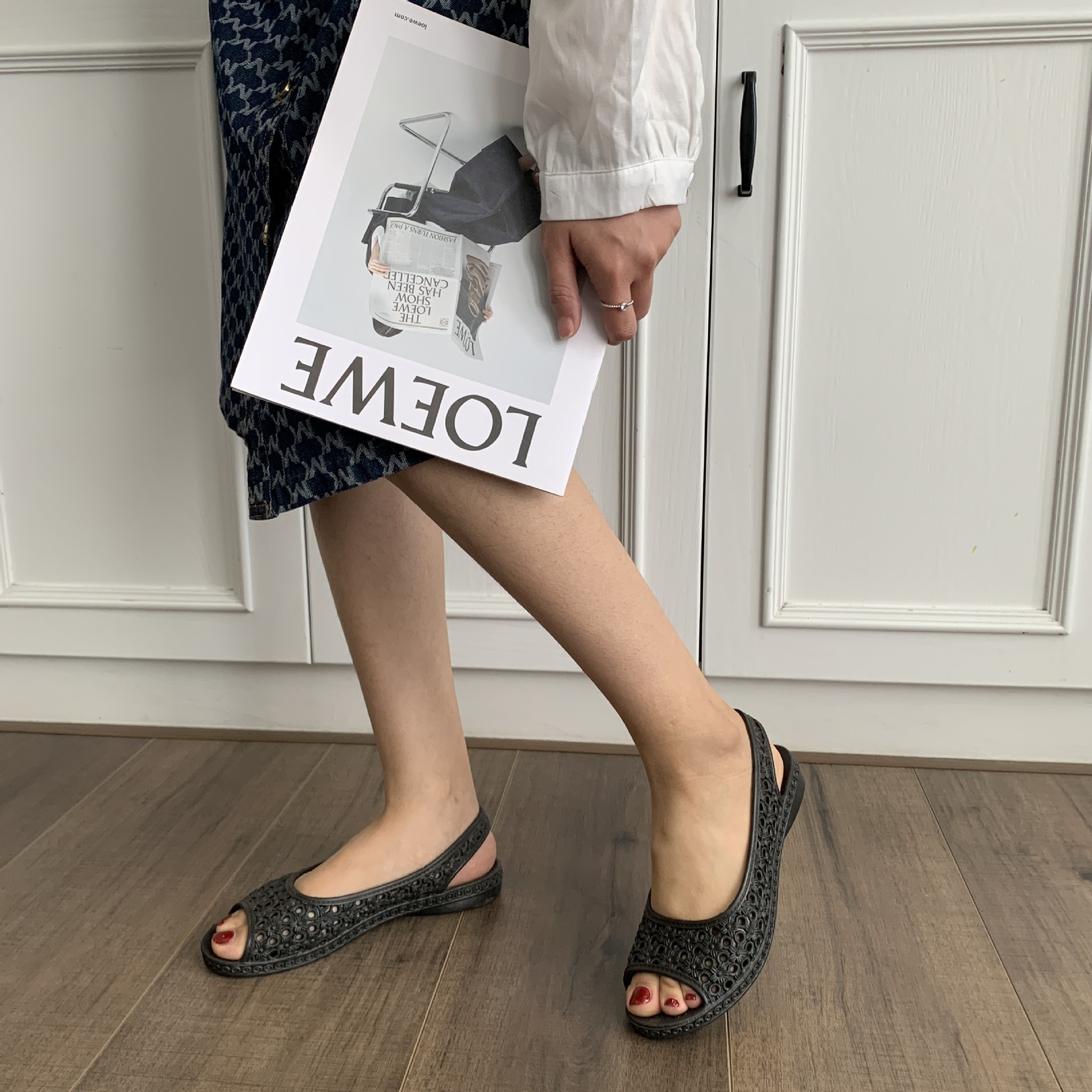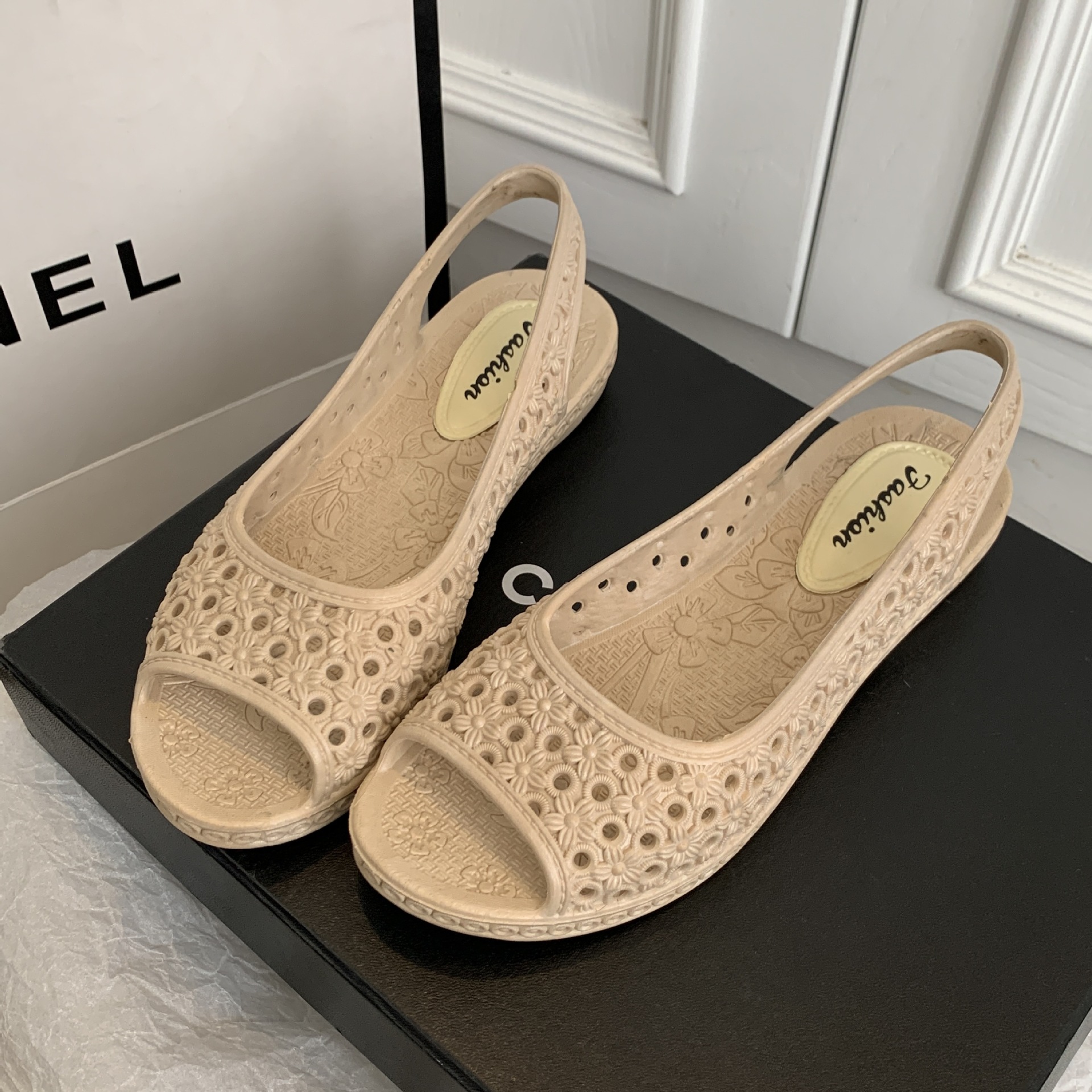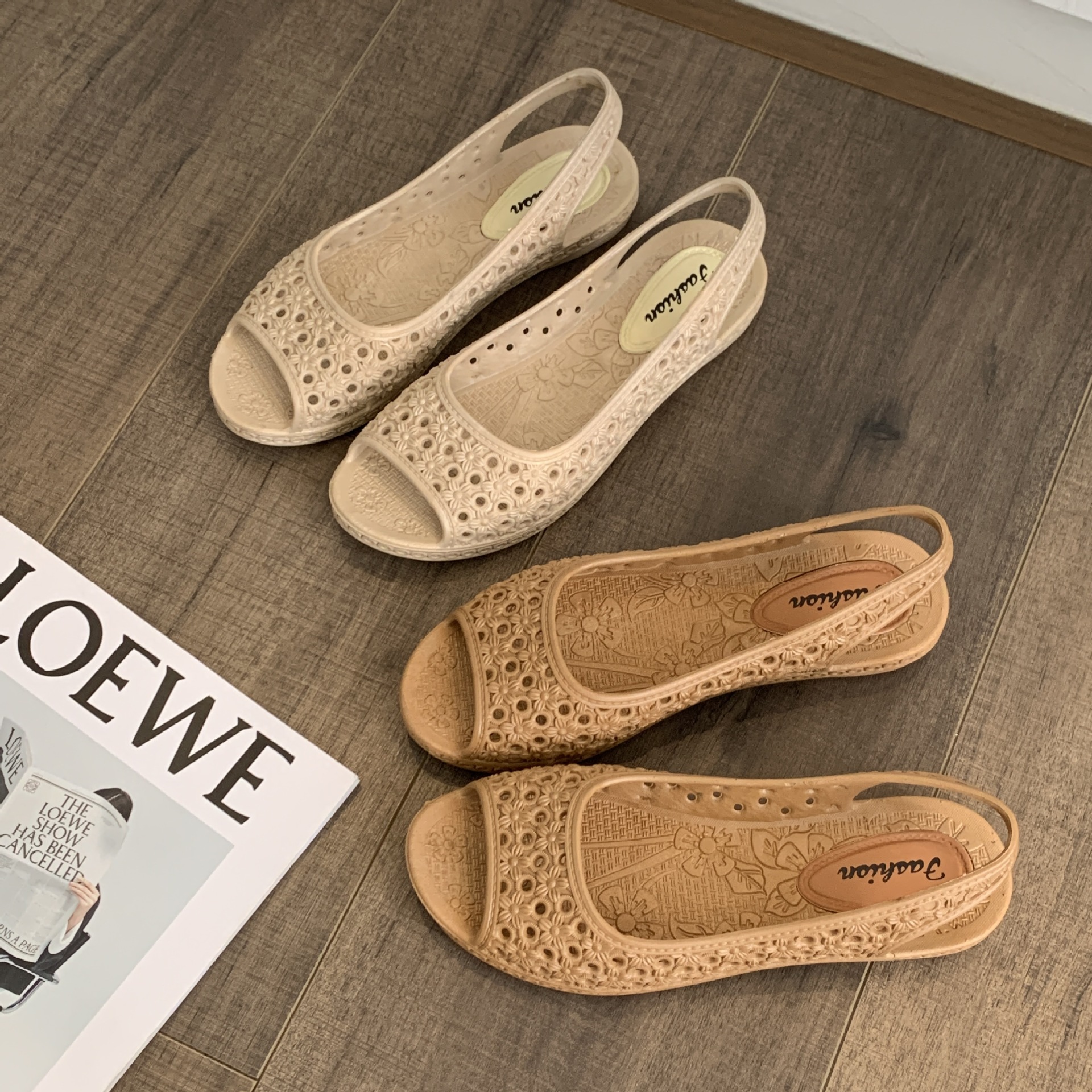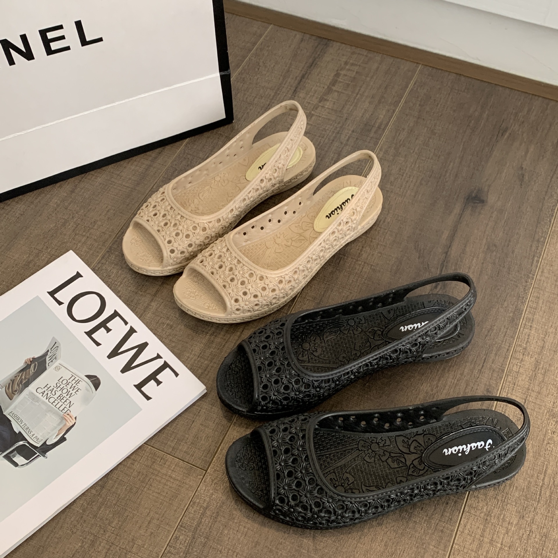 새로운 여름 샌들 솔리드 컬러 캐주얼 아웃웨어 패션 할로우 비치 플랫 리어 쿨 스트랩 여성용 신발스토어 가기