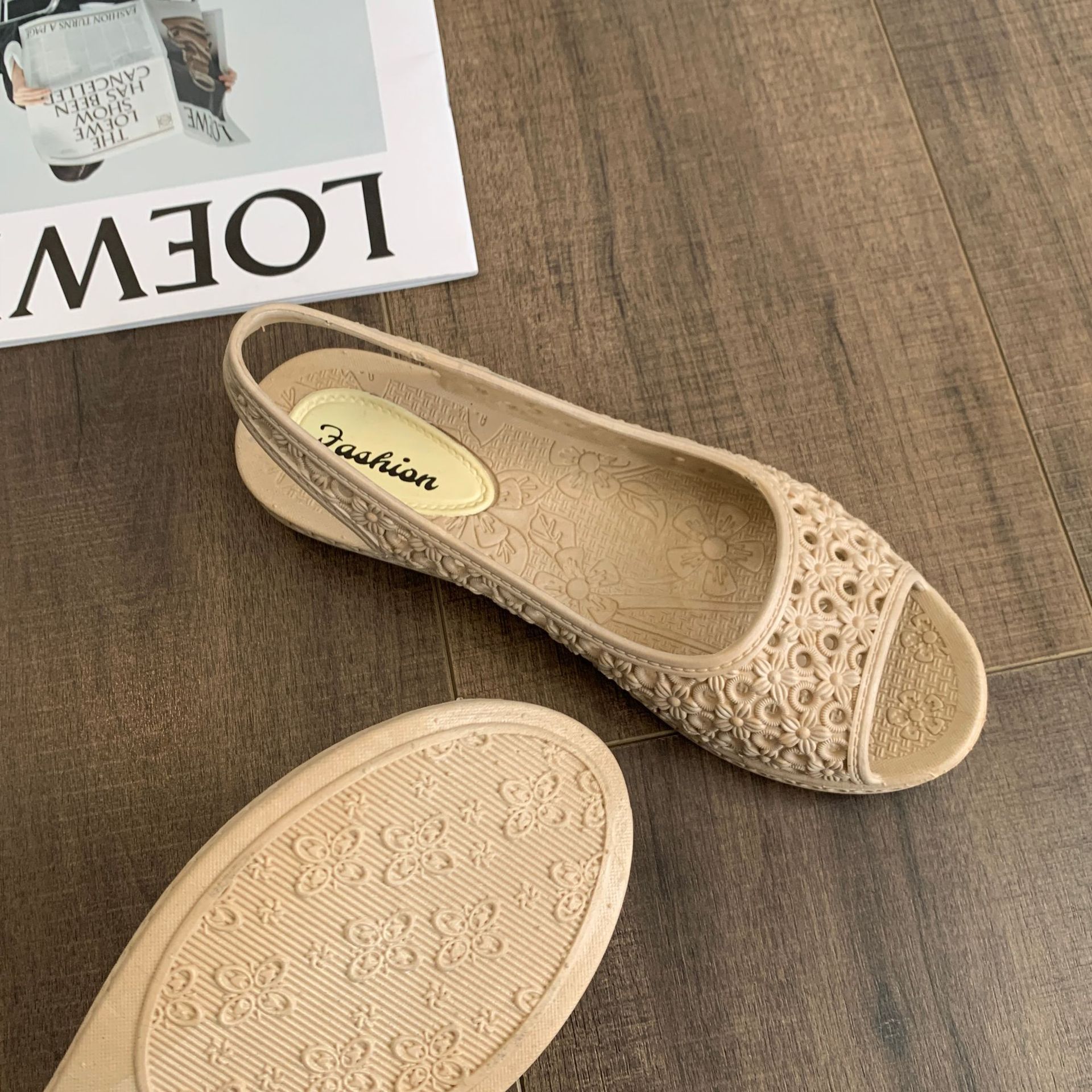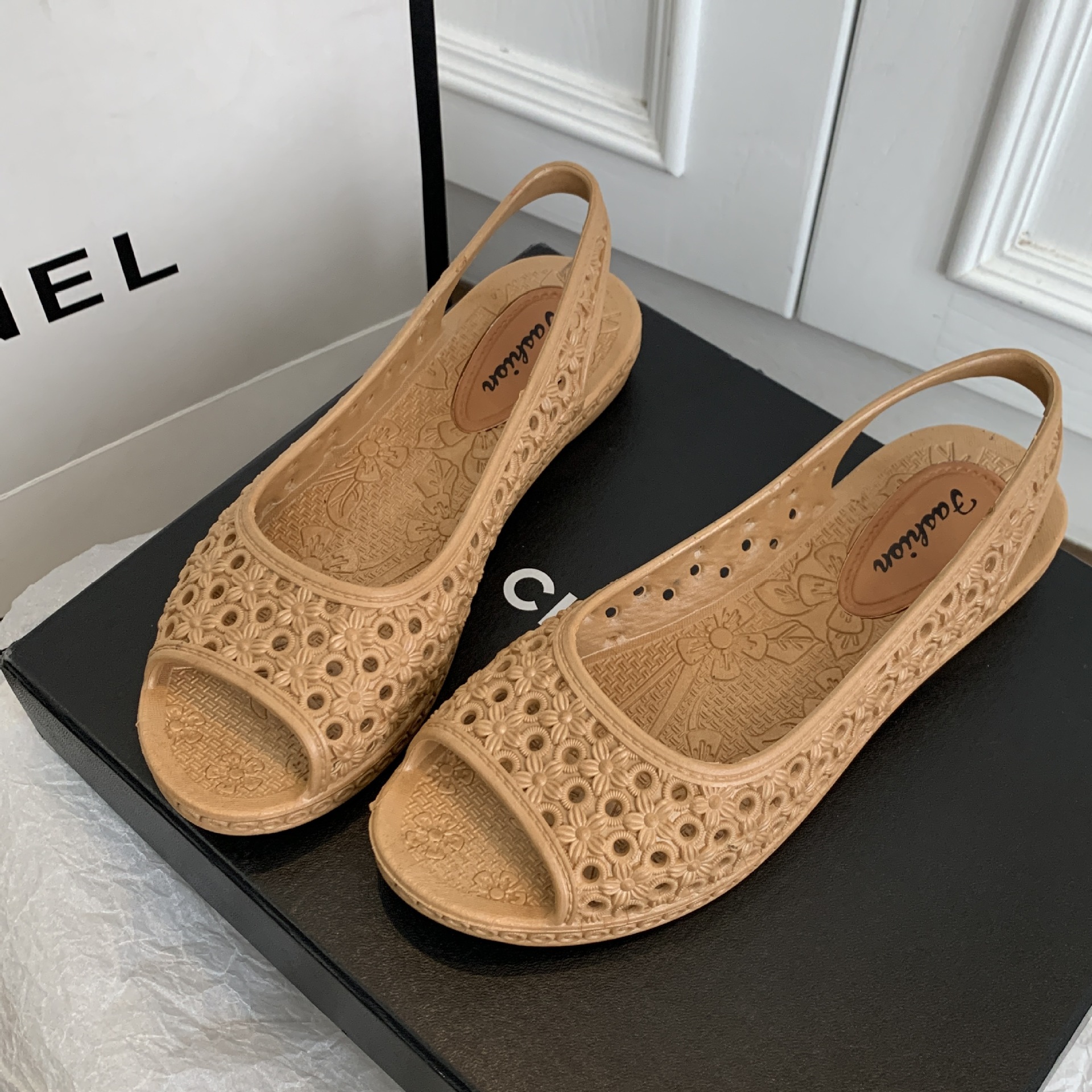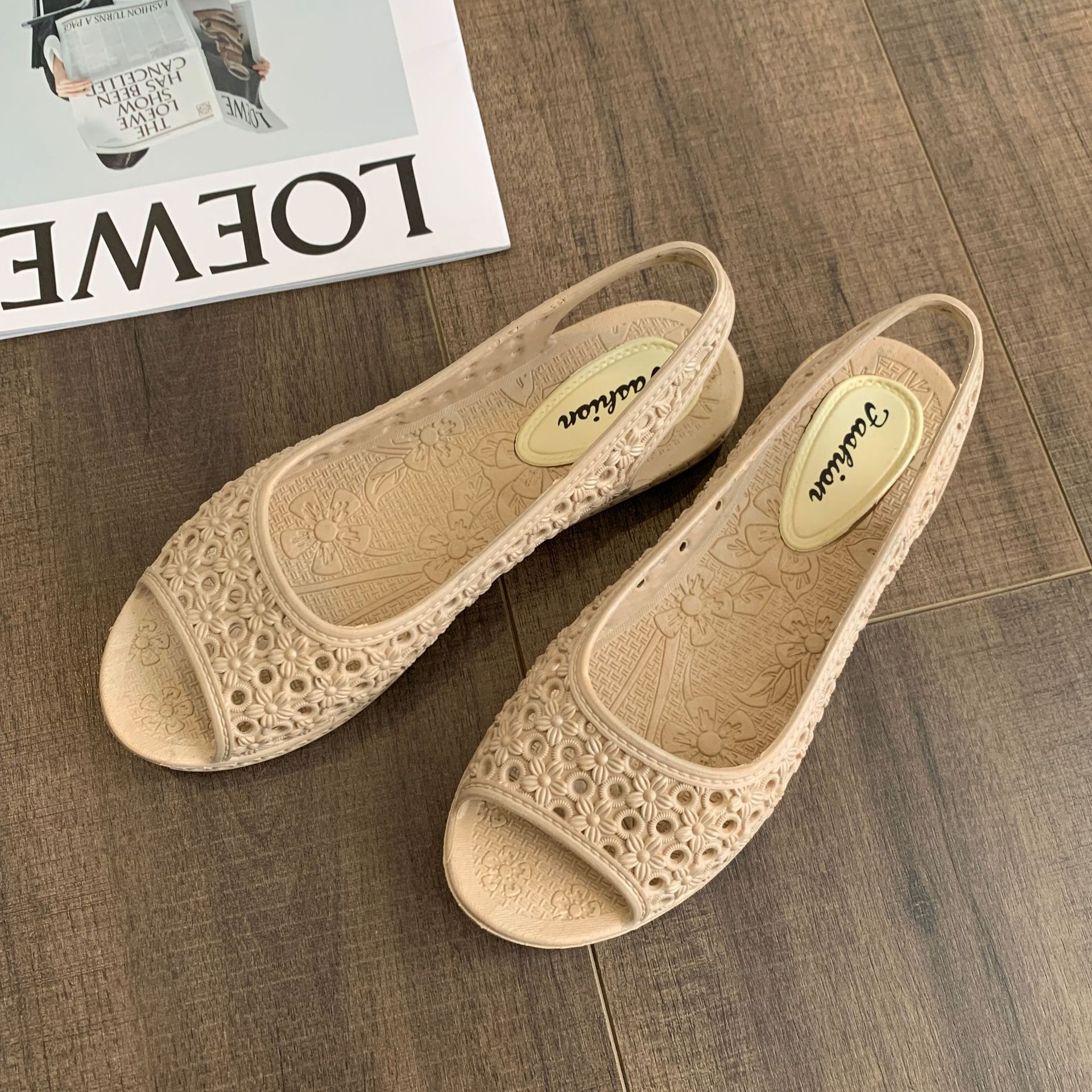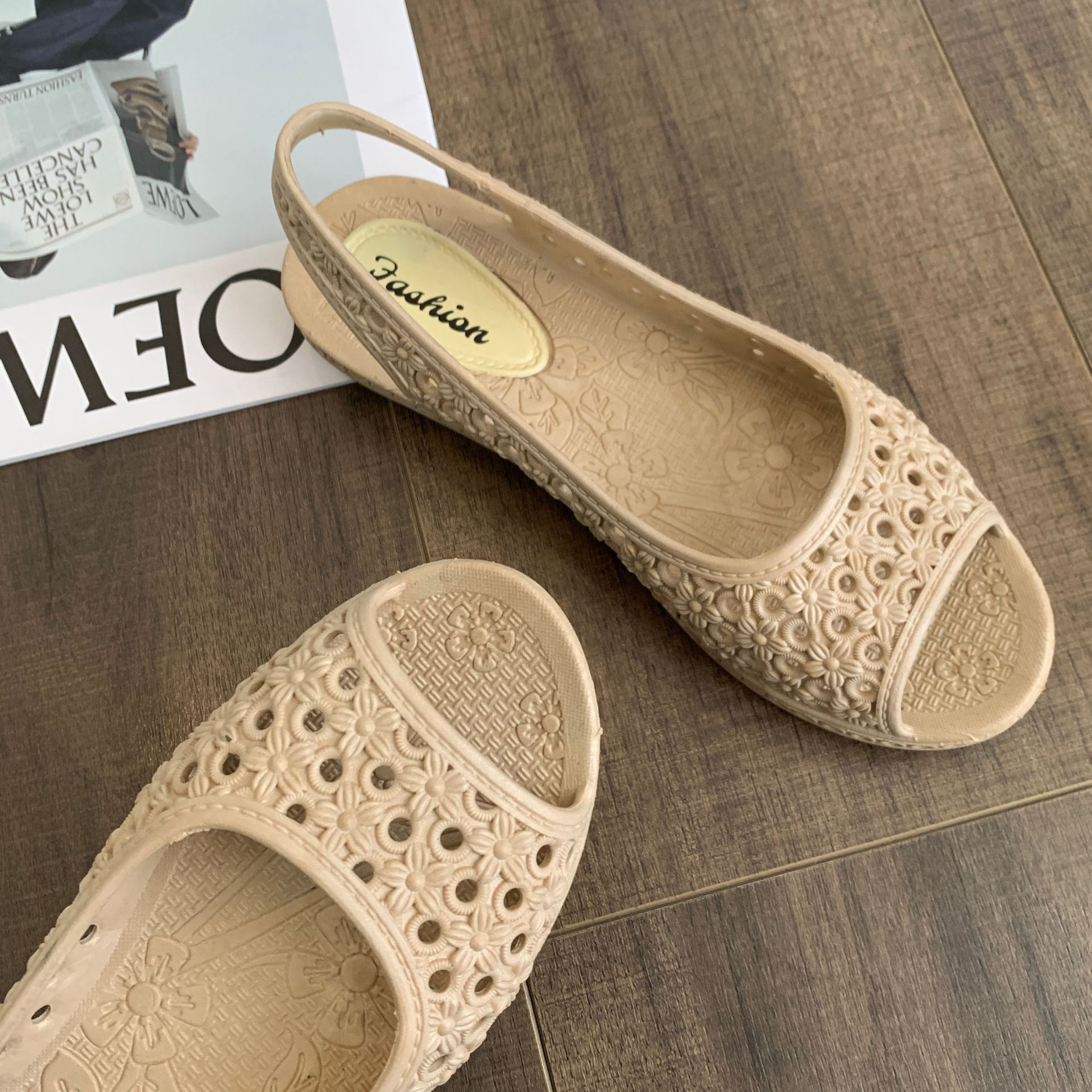 새로운 여름 샌들 솔리드 컬러 캐주얼 아웃웨어 패션 할로우 비치 플랫 리어 쿨 스트랩 여성용 신발스토어 가기