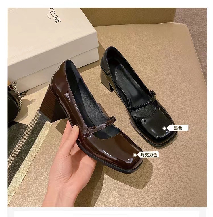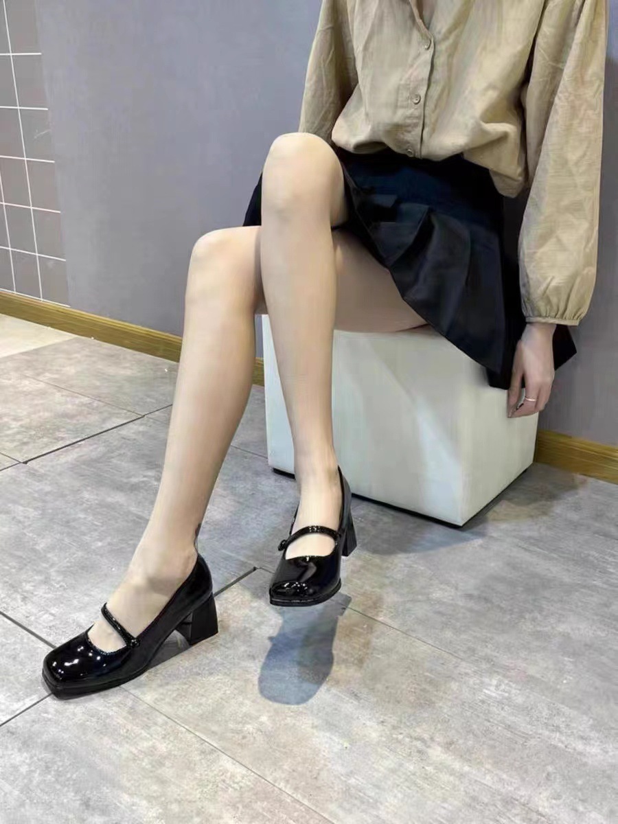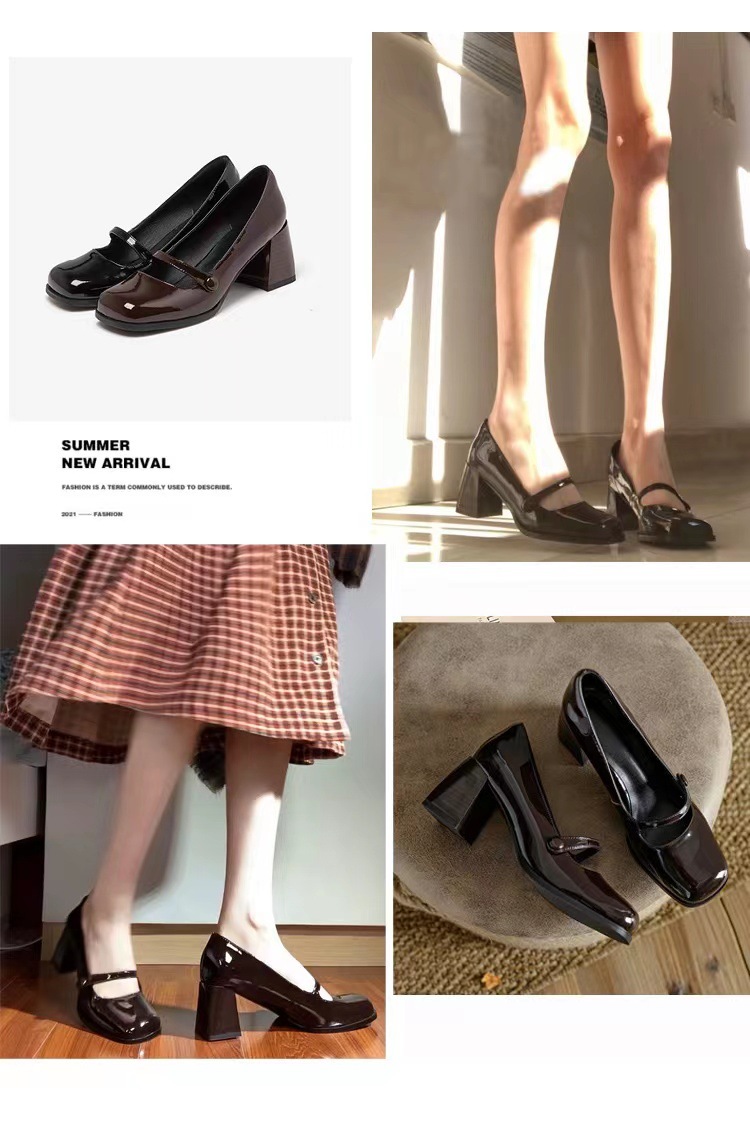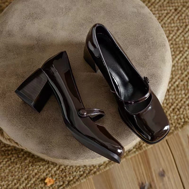 프랑스 하이힐 ~ 메리 제인 신발 스퀘어 헤드 2024 새로운 복고풍 중간 두꺼운 힐 작은 가죽 신발 jk 단일 신발스토어 가기