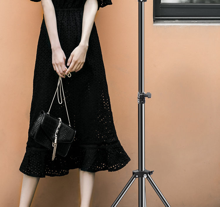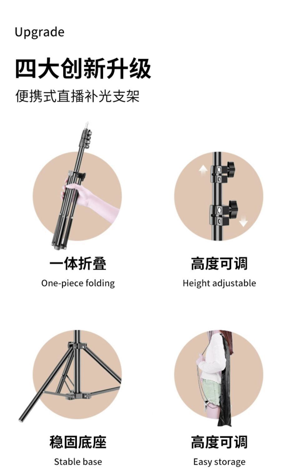 • 1.9m 삼각대 + 듀얼 카메라 거치대 + 수납 가방 + 촬영 리모컨 + 26cm 조명
