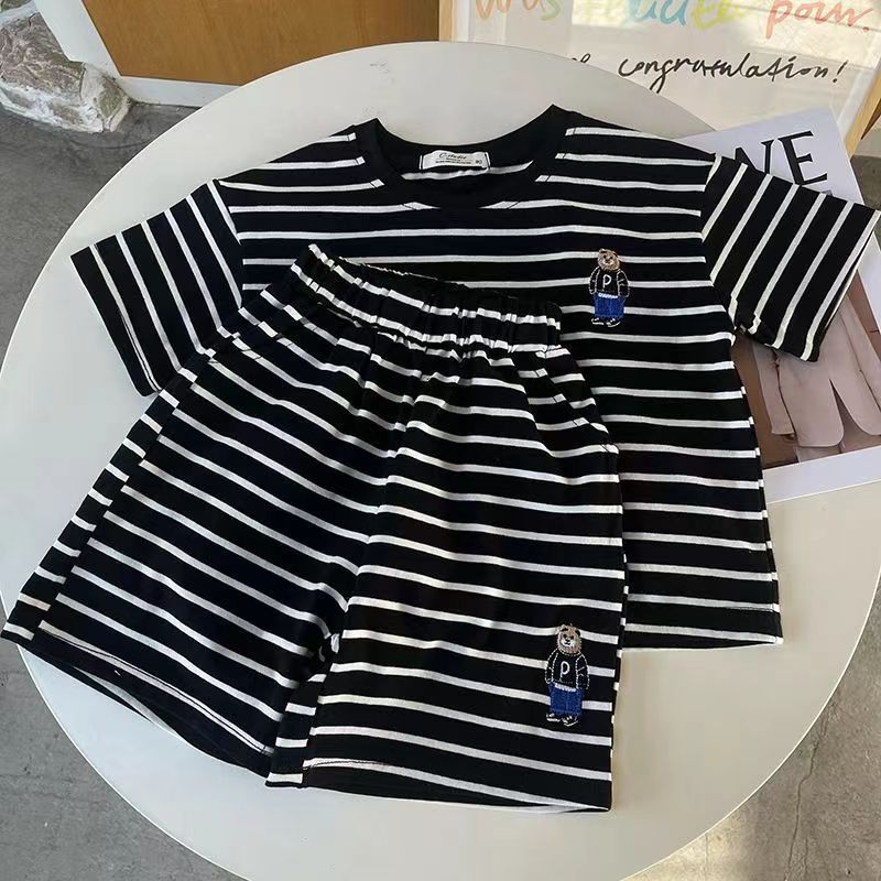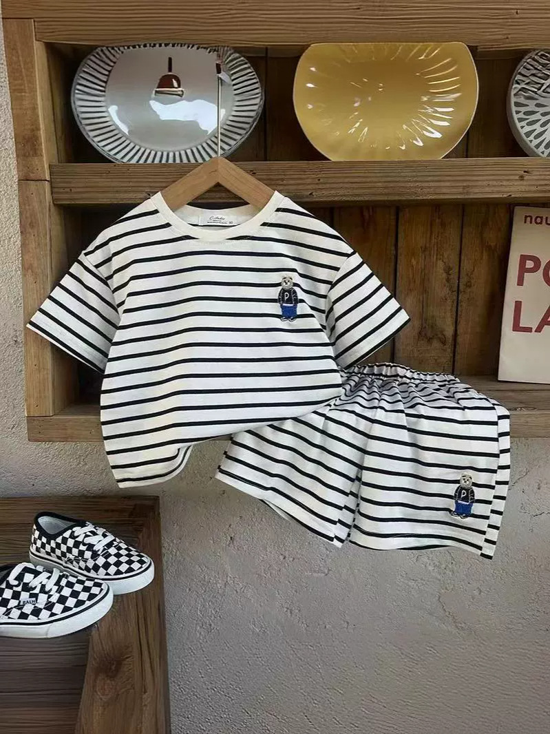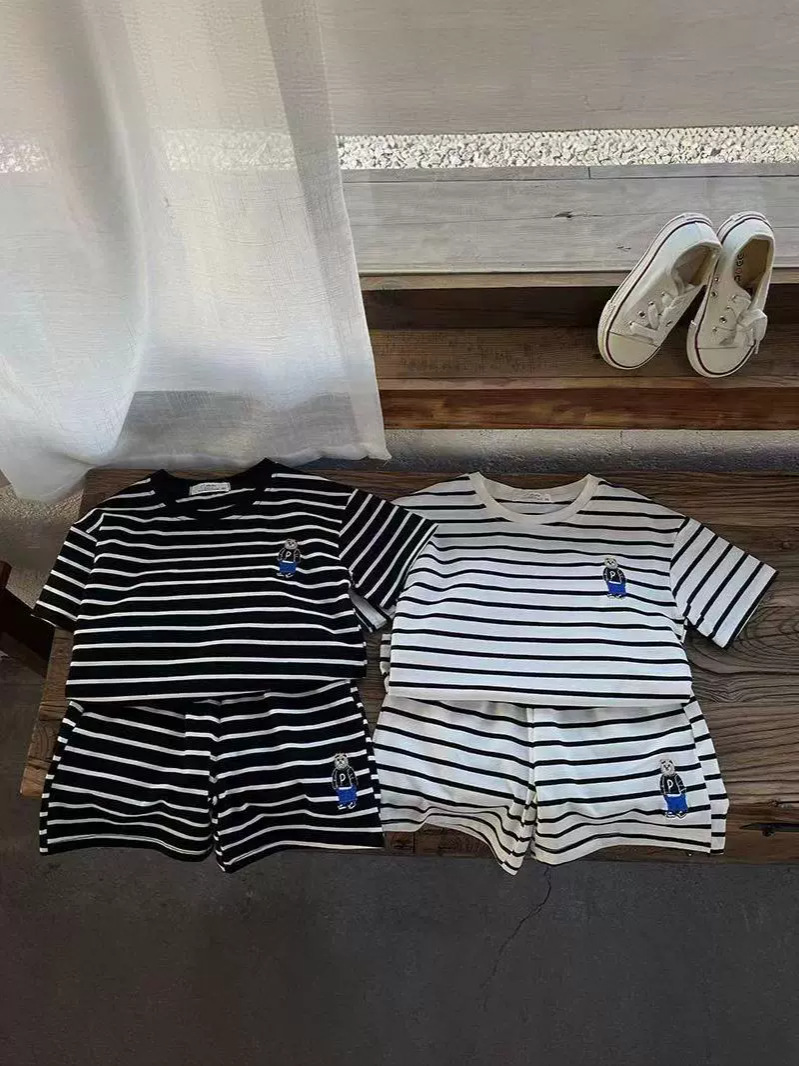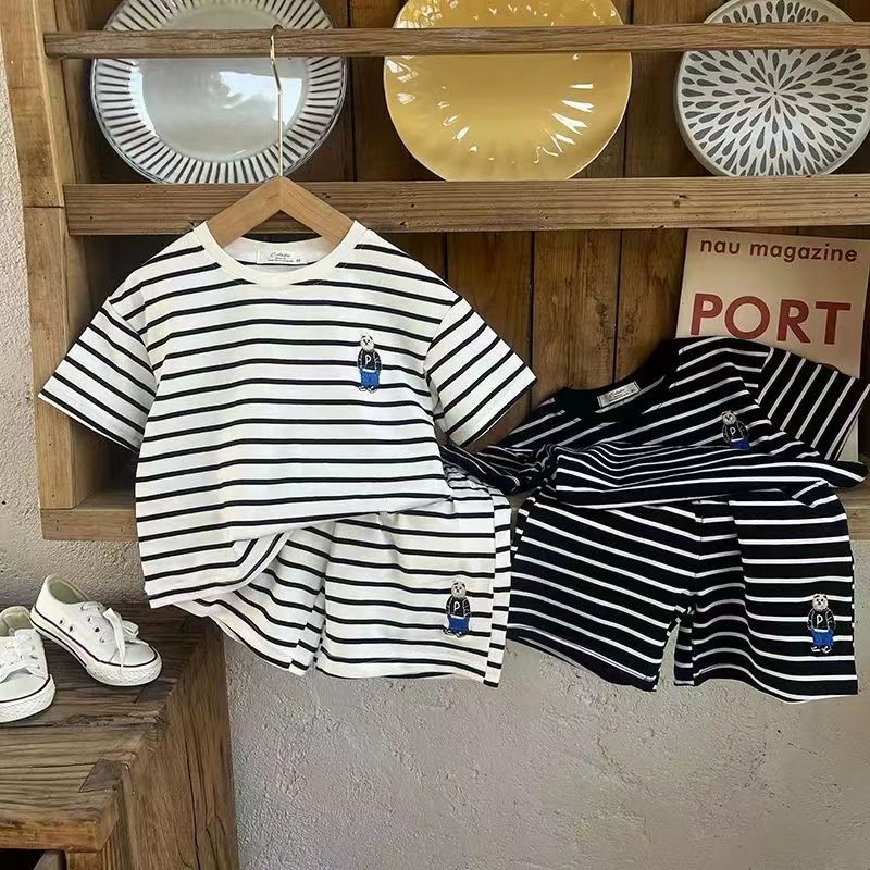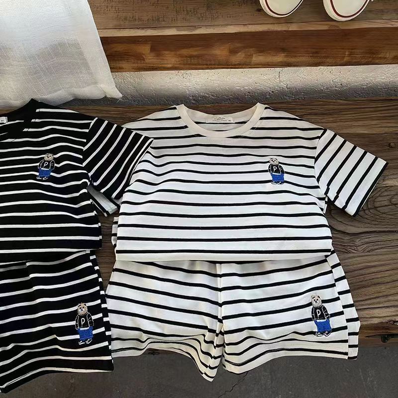 보이즈 코튼 스트라이프 티셔츠 반팔 세트 새로운 어린이 반바지 곰 자수 여름 투피스 세트