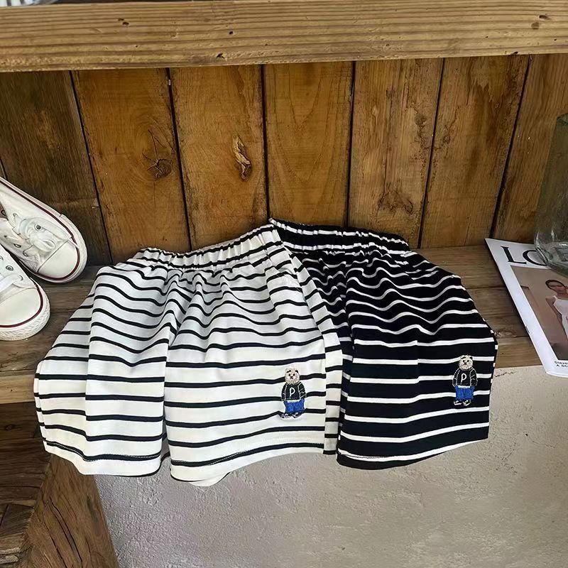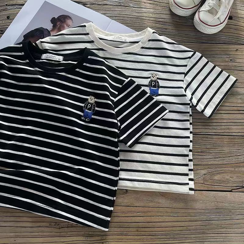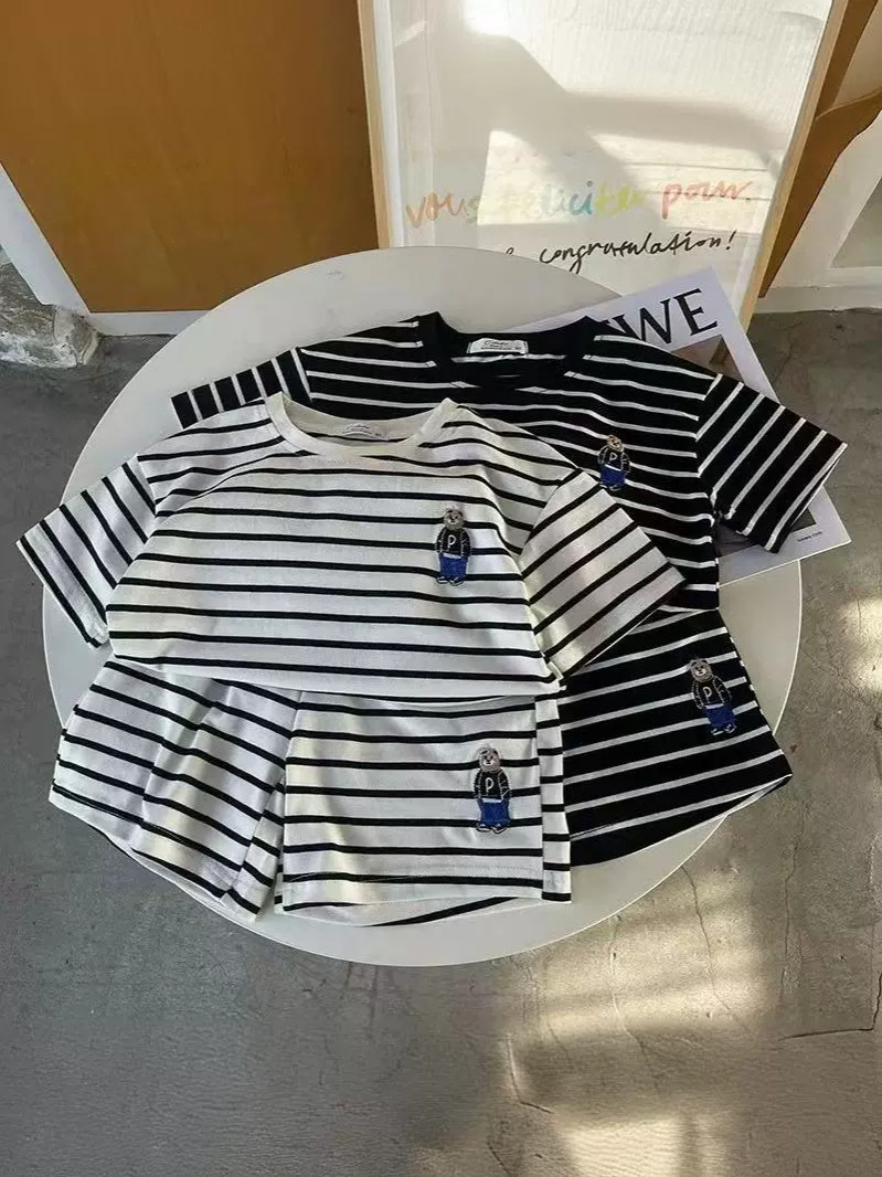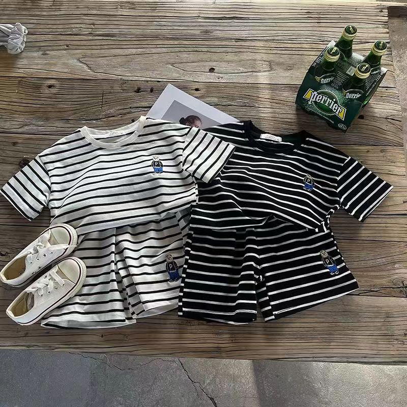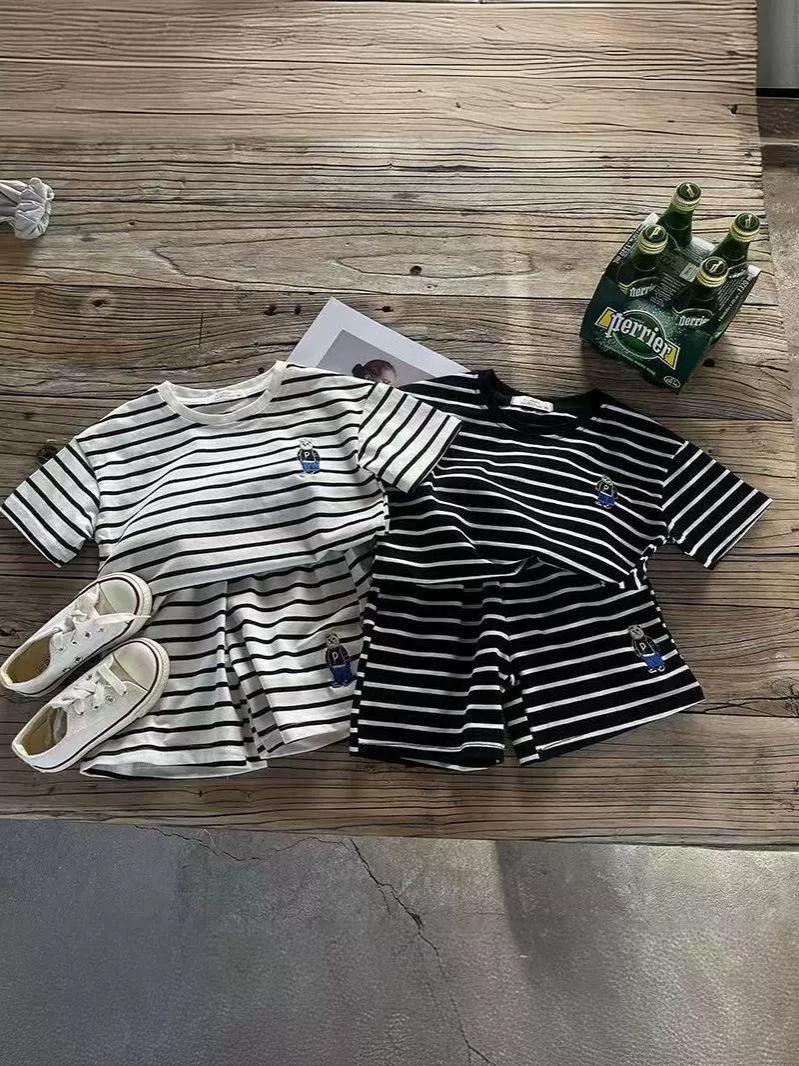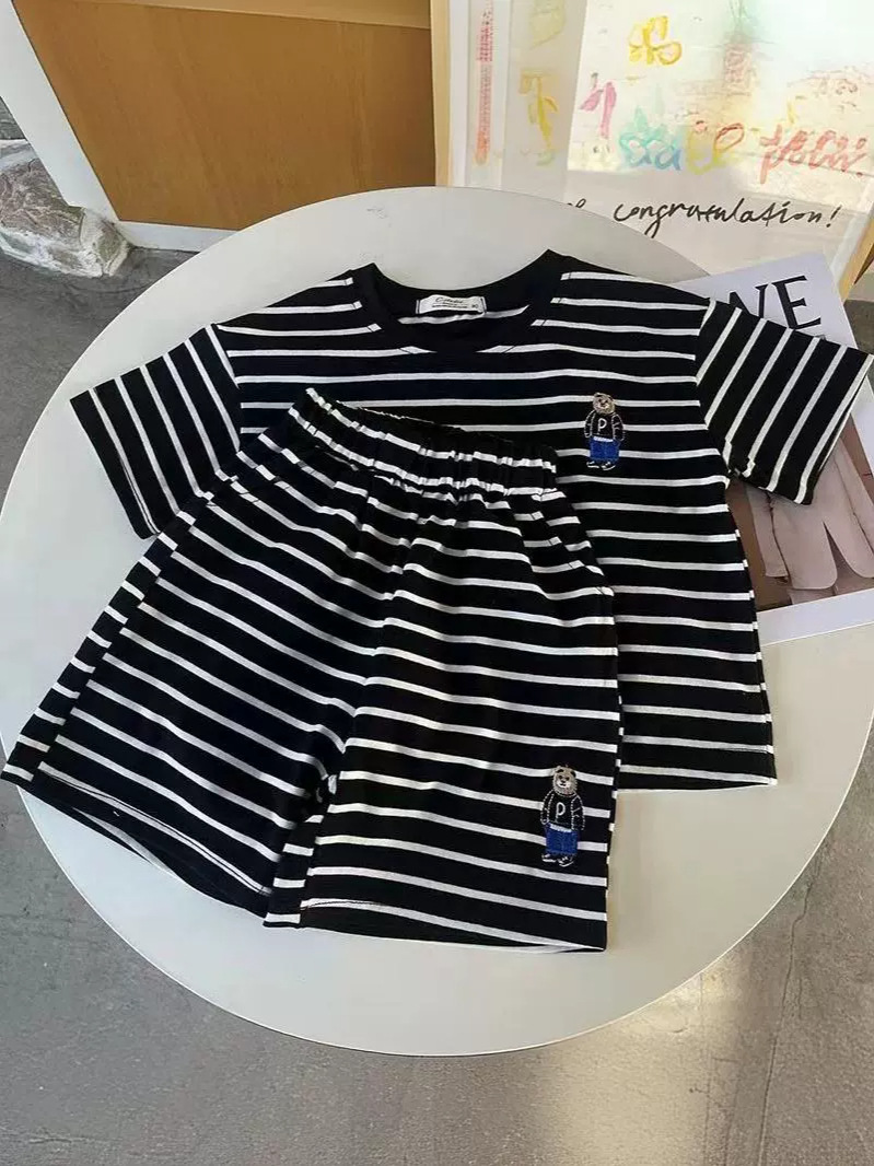 보이즈 코튼 스트라이프 티셔츠 반팔 세트 새로운 어린이 반바지 곰 자수 여름 투피스 세트