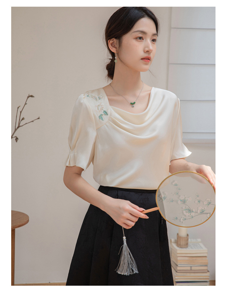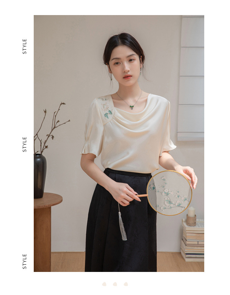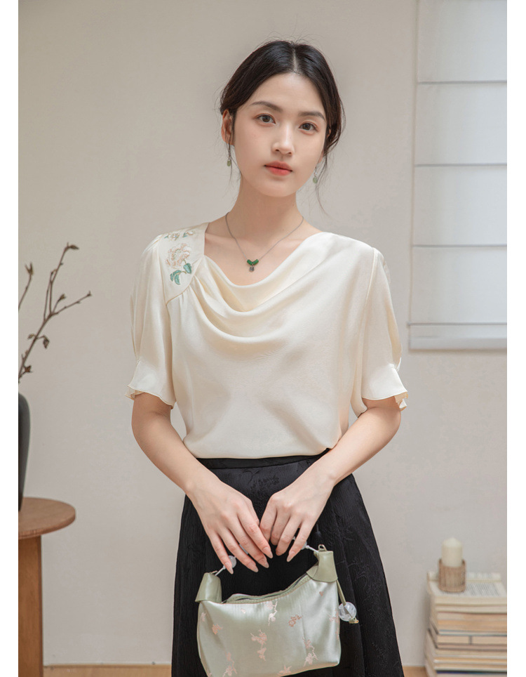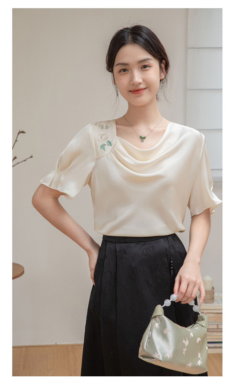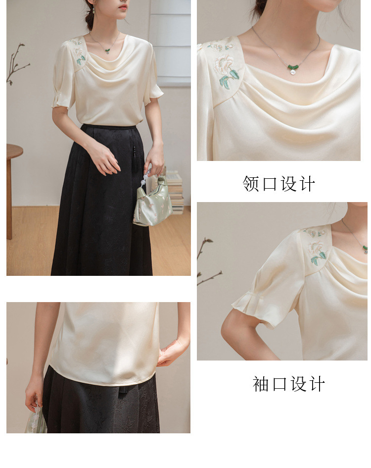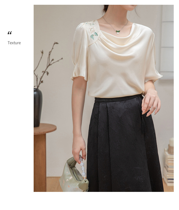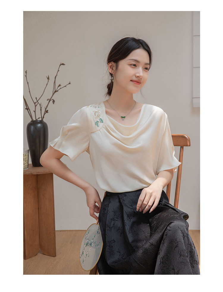 살구색 고급 프랑스 짧은 셔츠 여성의 여름 새로운 스퀘어 칼라 주름 자수 전문 통근 셔츠 도매스토어 가기