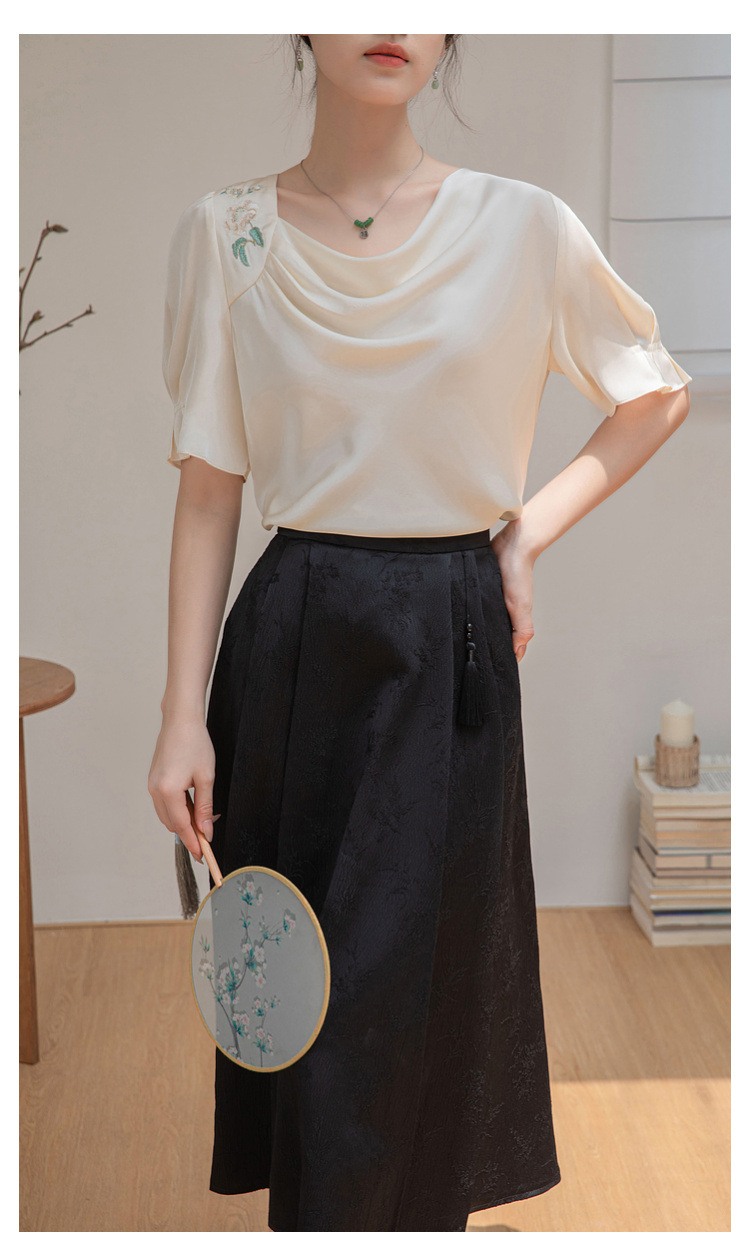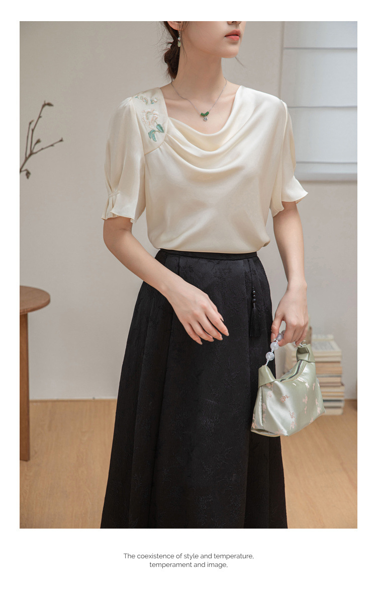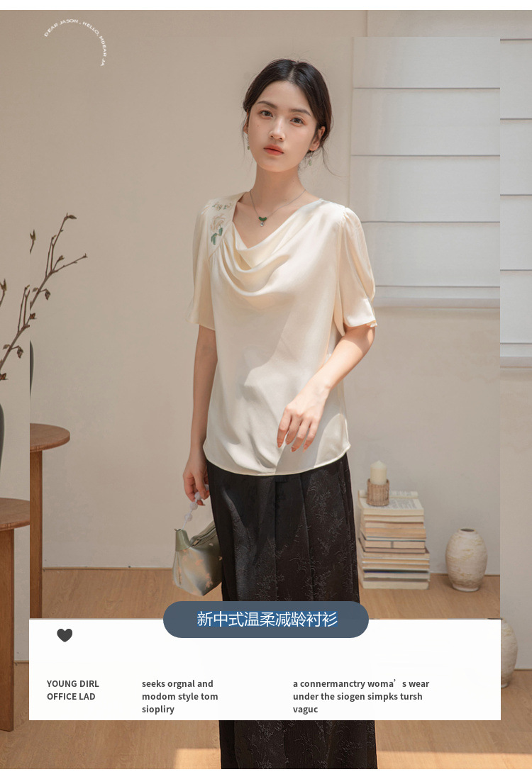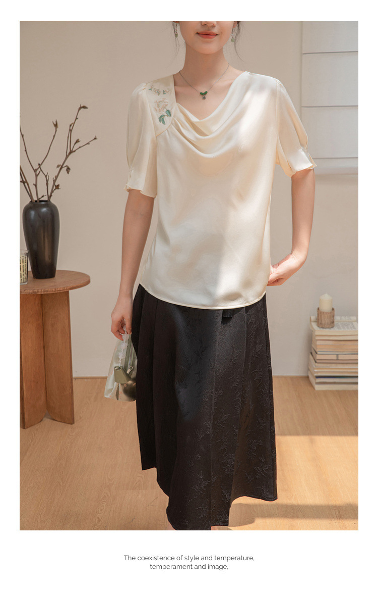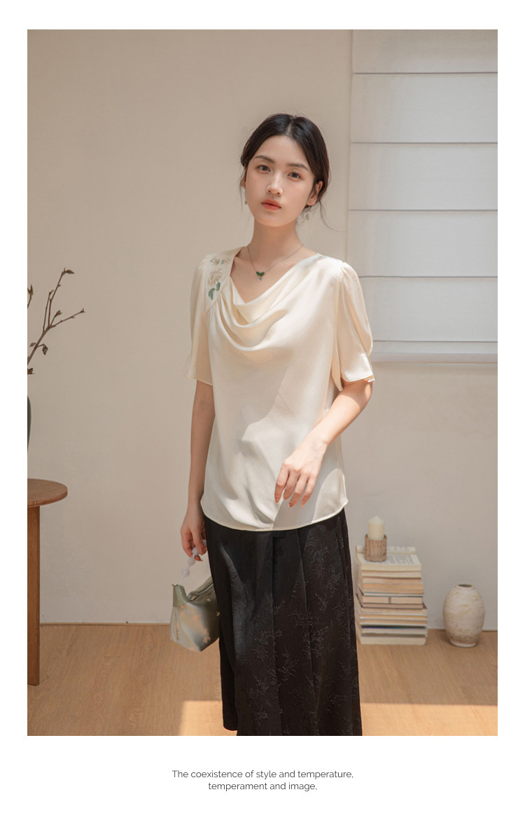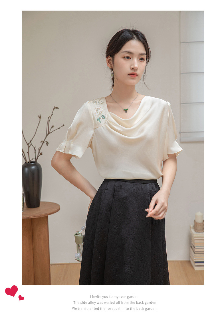 살구색 고급 프랑스 짧은 셔츠 여성의 여름 새로운 스퀘어 칼라 주름 자수 전문 통근 셔츠 도매스토어 가기