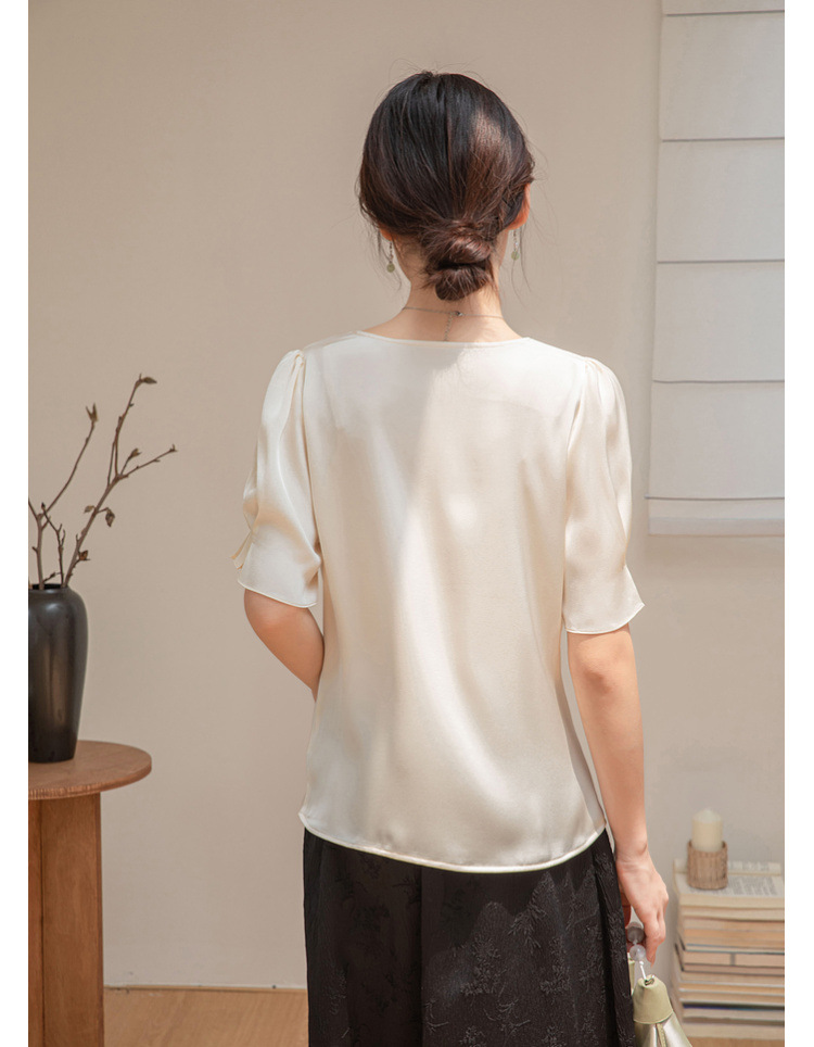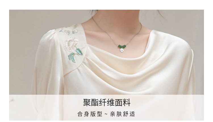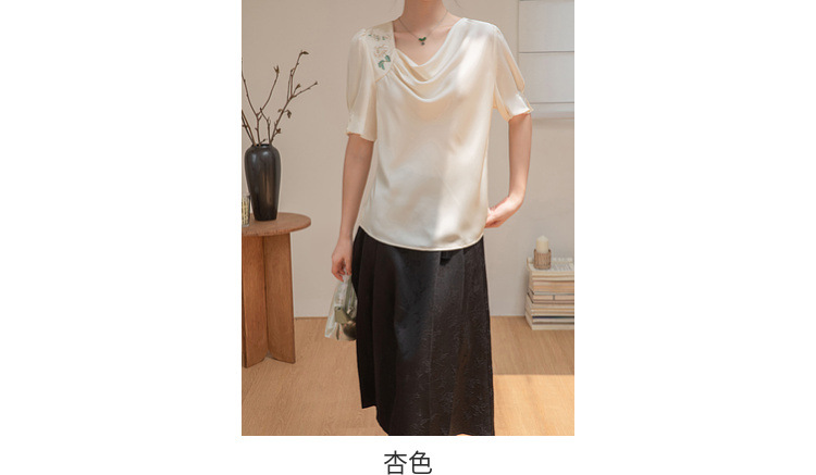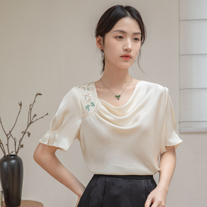 살구색 고급 프랑스 짧은 셔츠 여성의 여름 새로운 스퀘어 칼라 주름 자수 전문 통근 셔츠 도매