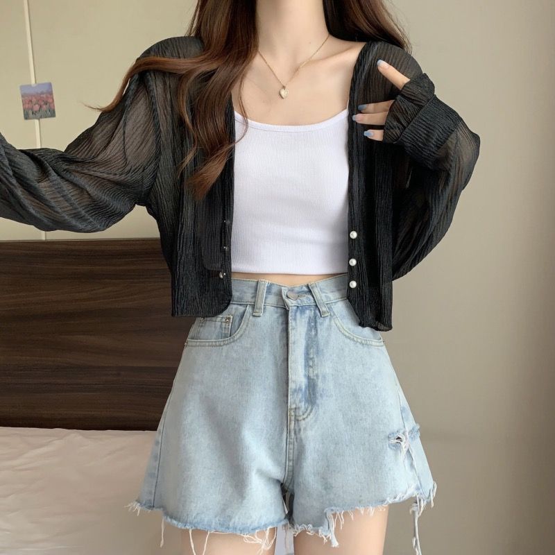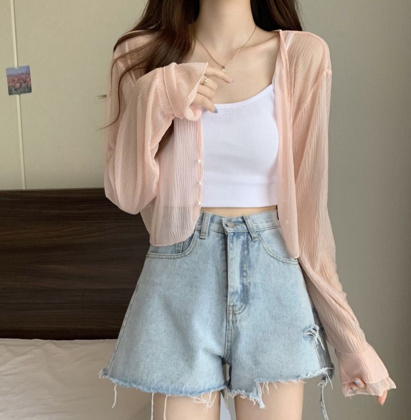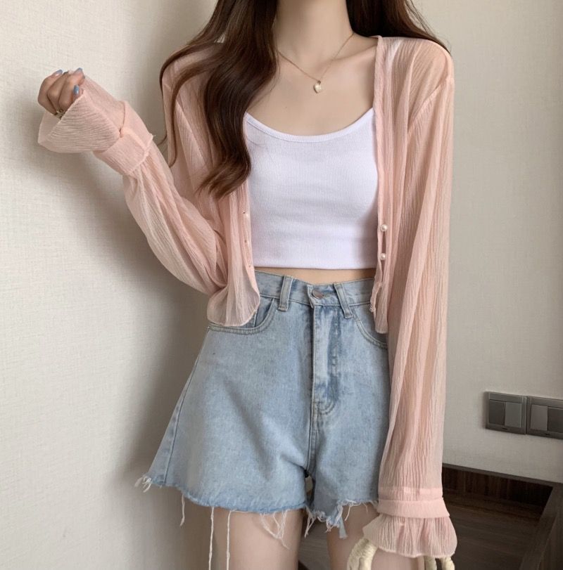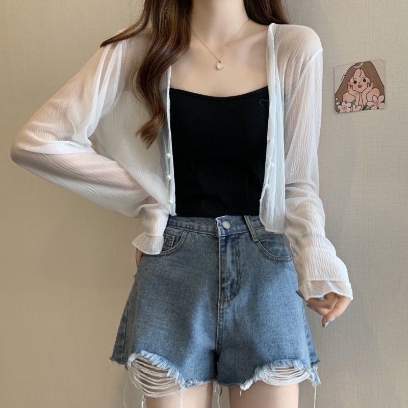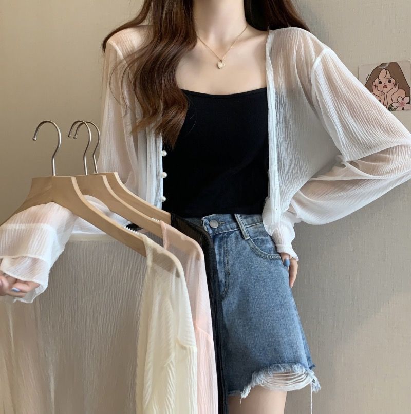아이스 실크 쉬폰 선 스크린 코트 여성용 여름 슬링 스커트와 얇은 긴팔 셔츠 작은 목도리 빈 트렌드스토어 가기