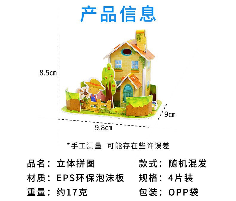 感谢您选择我们的随机款房子立体拼图!在此想特别向您说明:由于产品生产批次不同,每批所含的重复图案种类及出现概率都会有所差异,这是随机款产品的正常情况。
