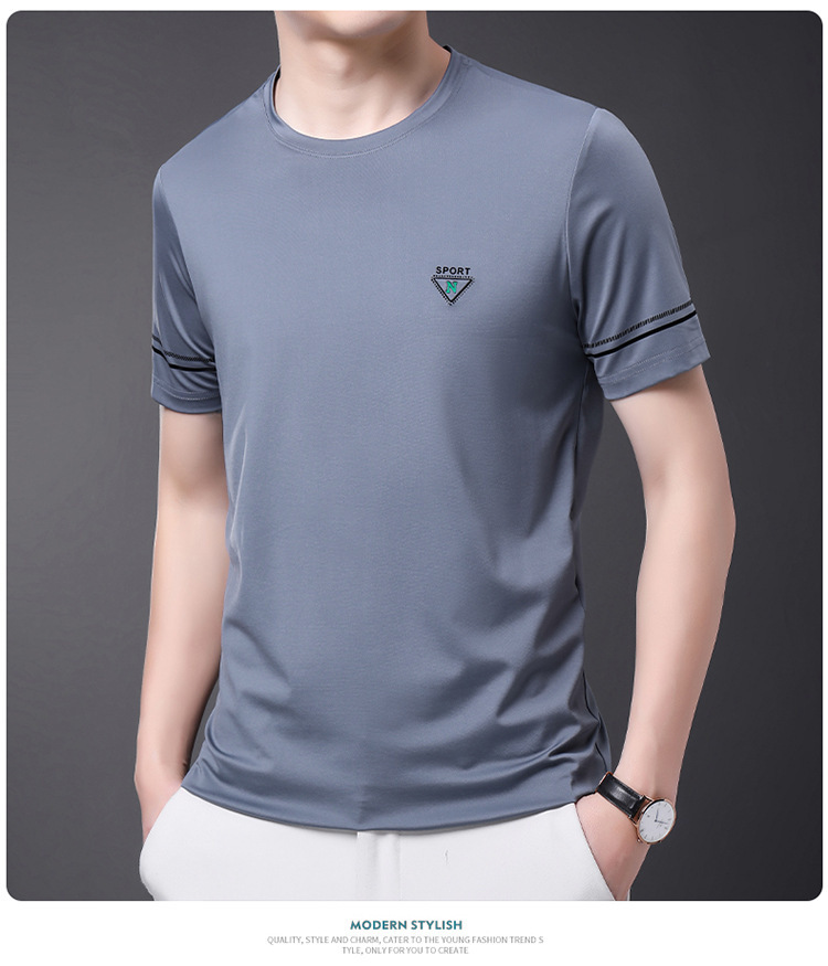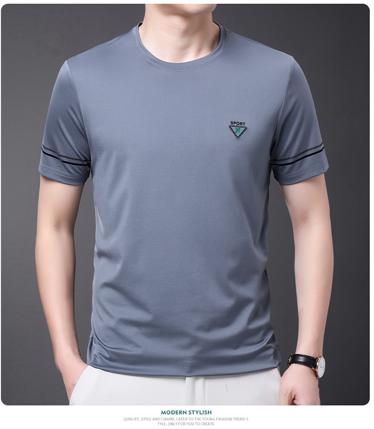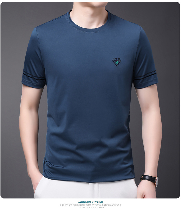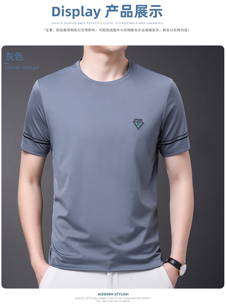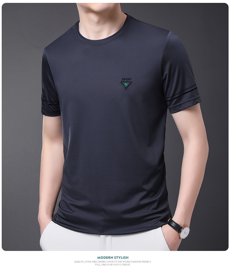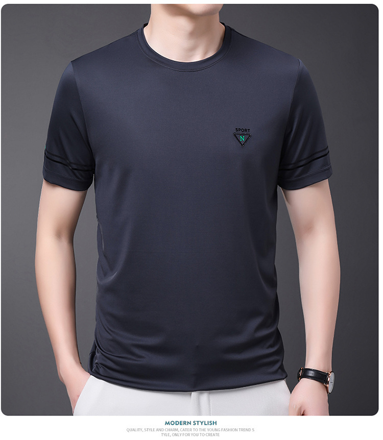 남자 티셔츠 2024 여름 새로운 하이 엔드 라운드 넥 중년 남성 비 다림질 캐주얼 남성 멀 베리 실크 탑