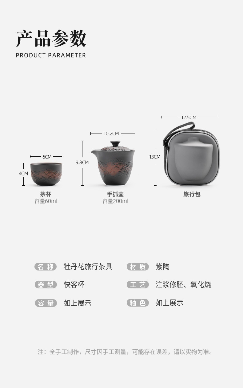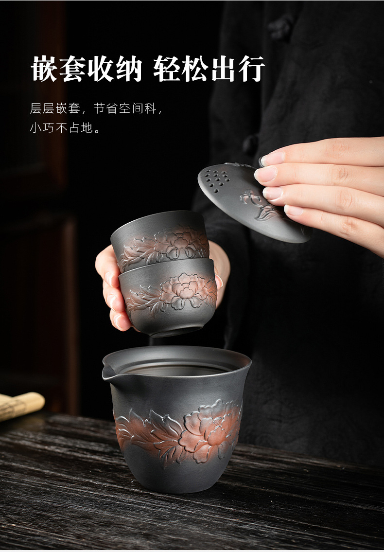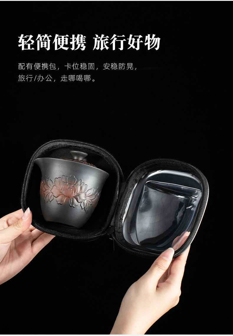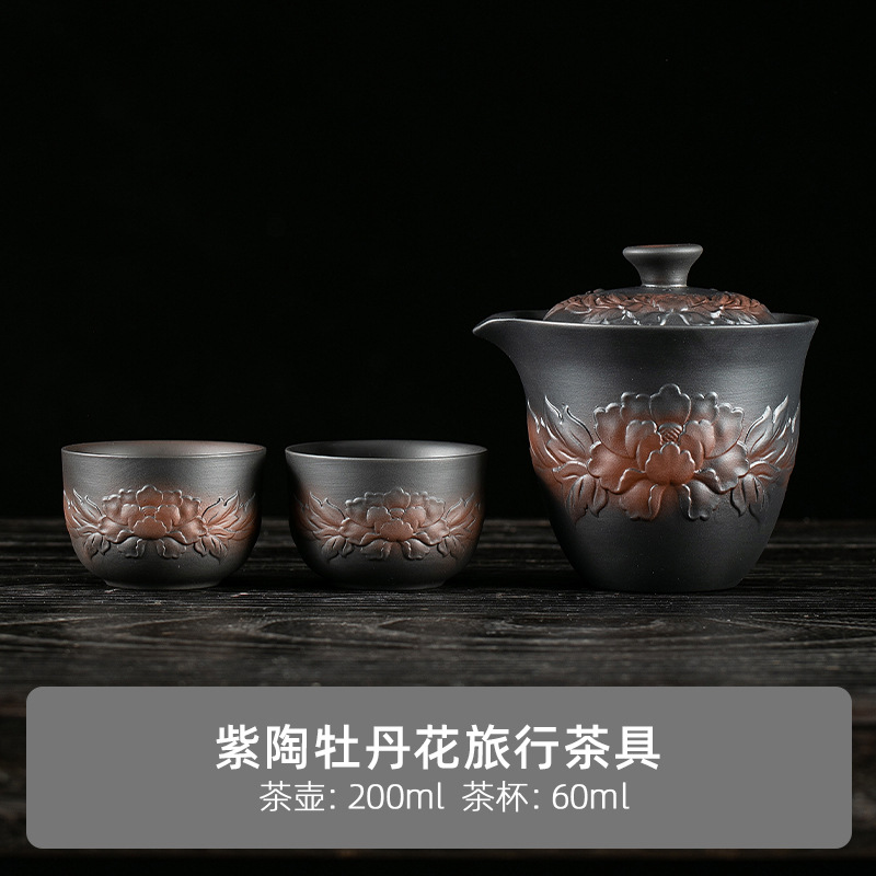 • 보라색 도자기 모란 휴대용 가방 2 컵 냄비