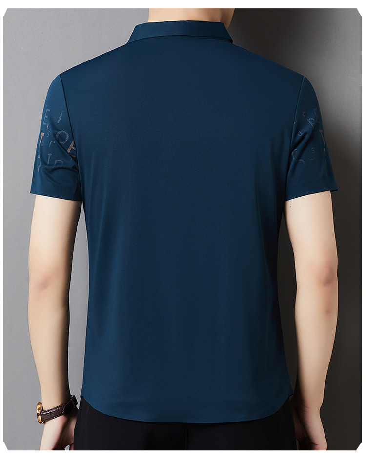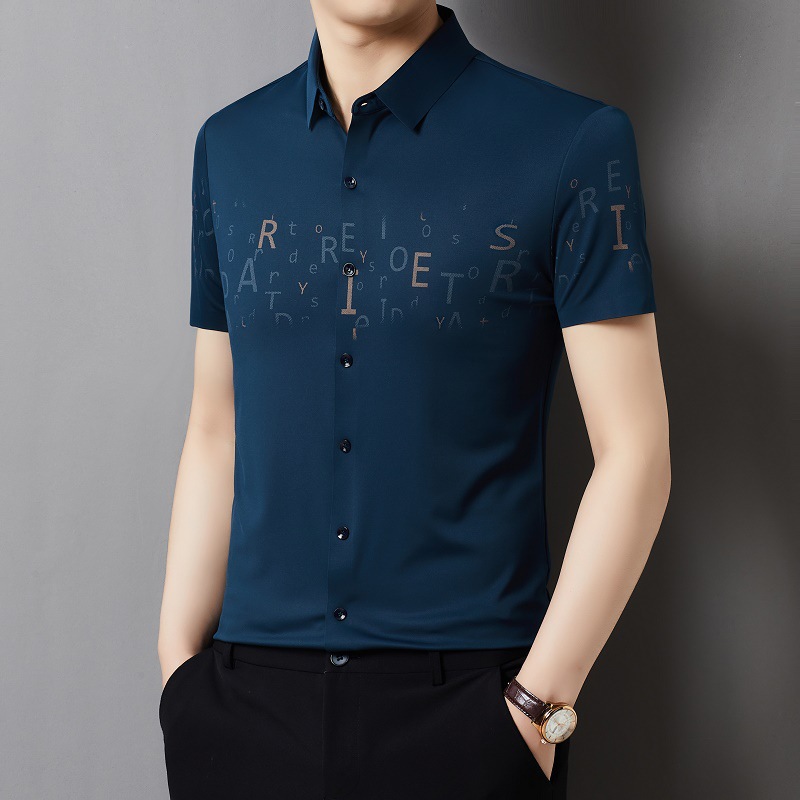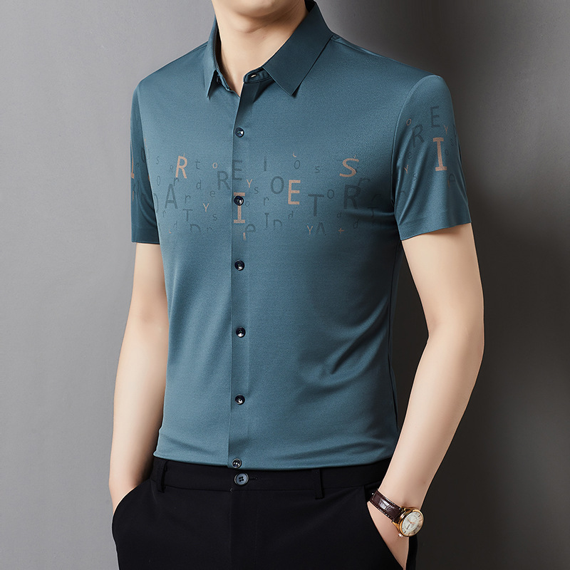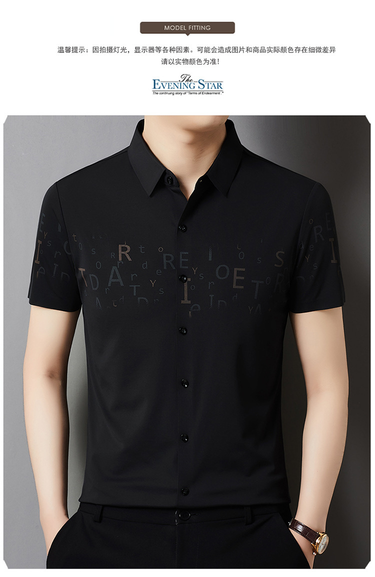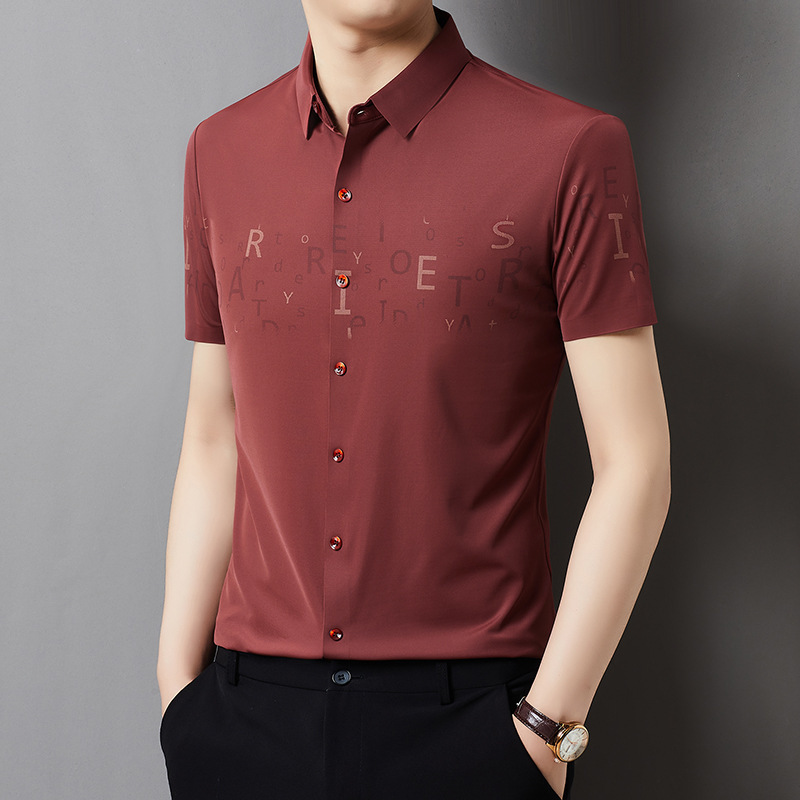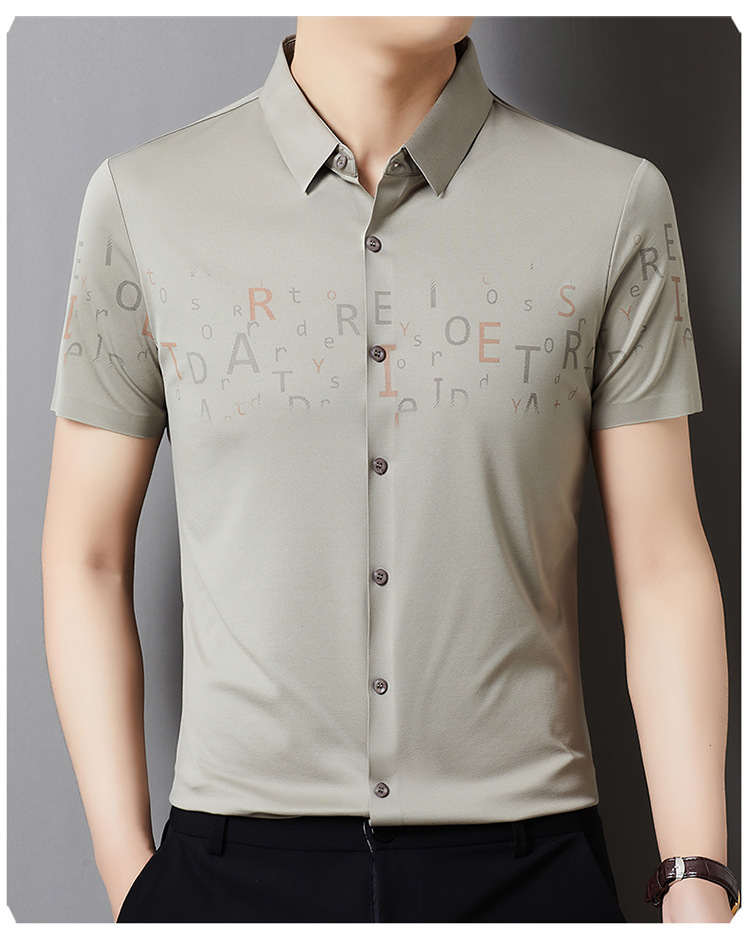 夏季新款桑蚕丝短袖衬衫男青年休闲时尚无痕翻领提花冰丝衬衣男装