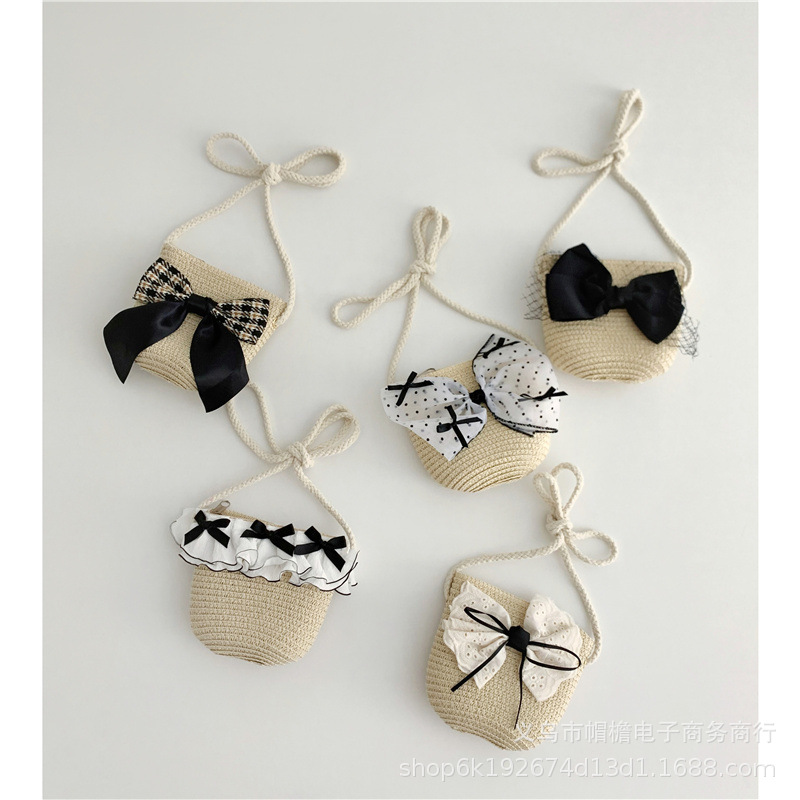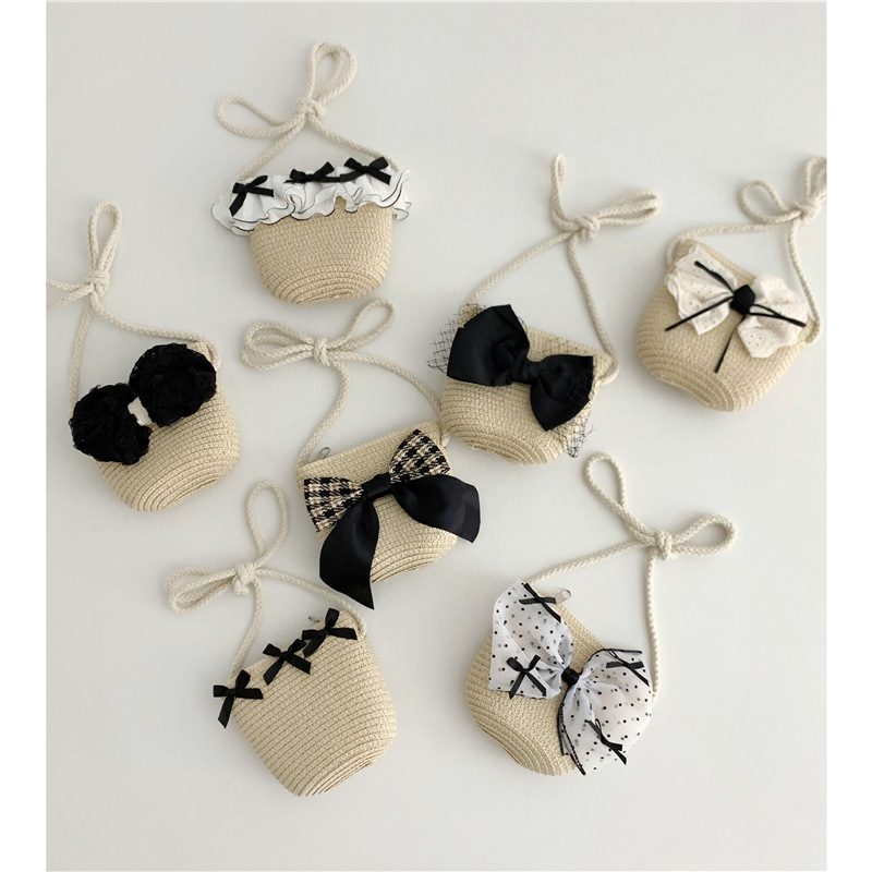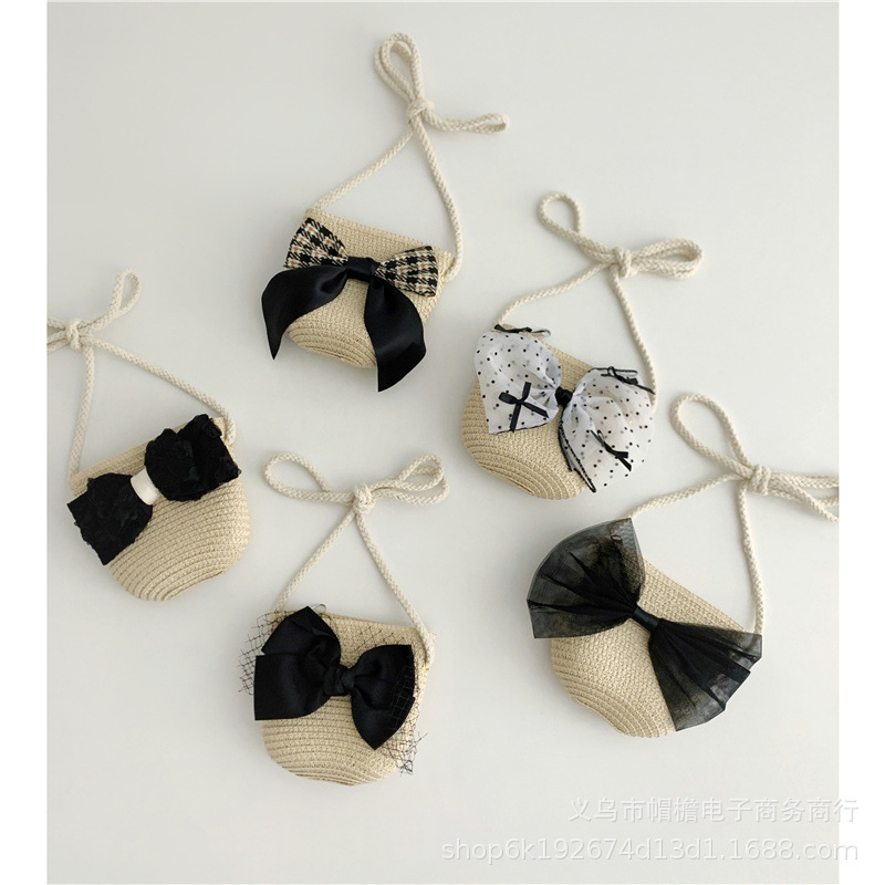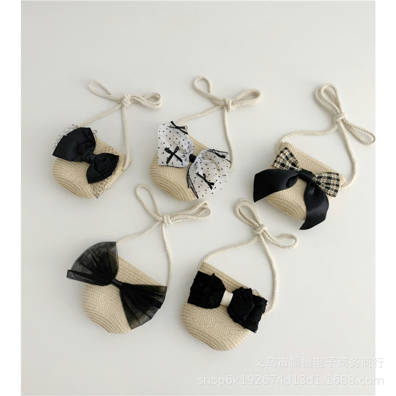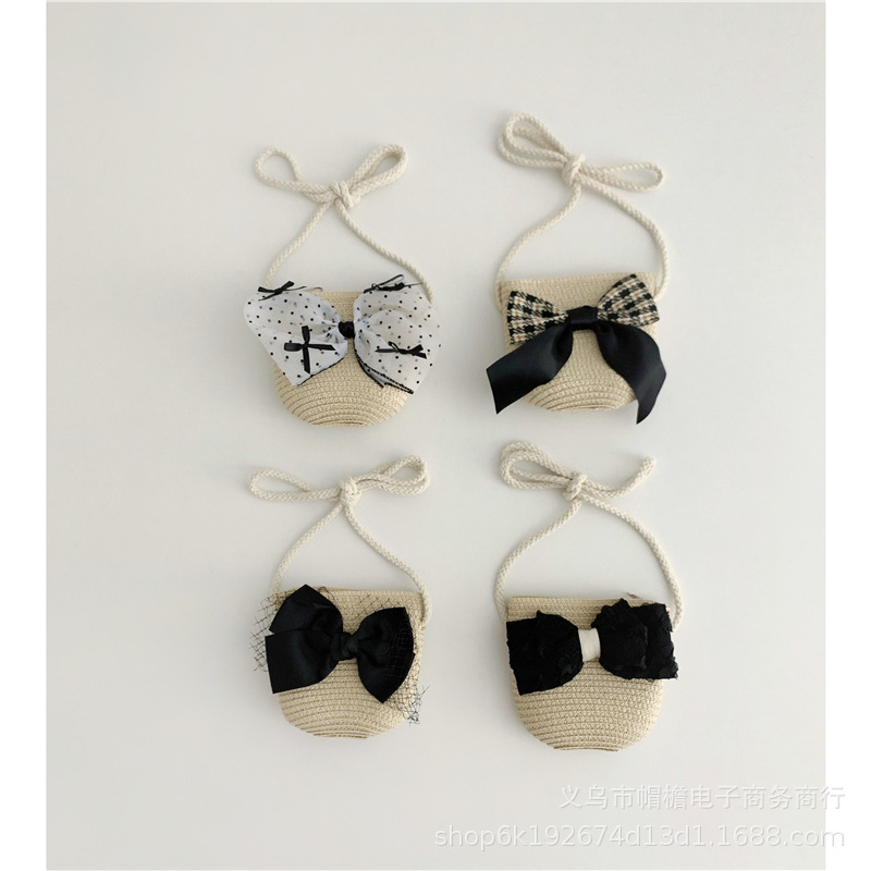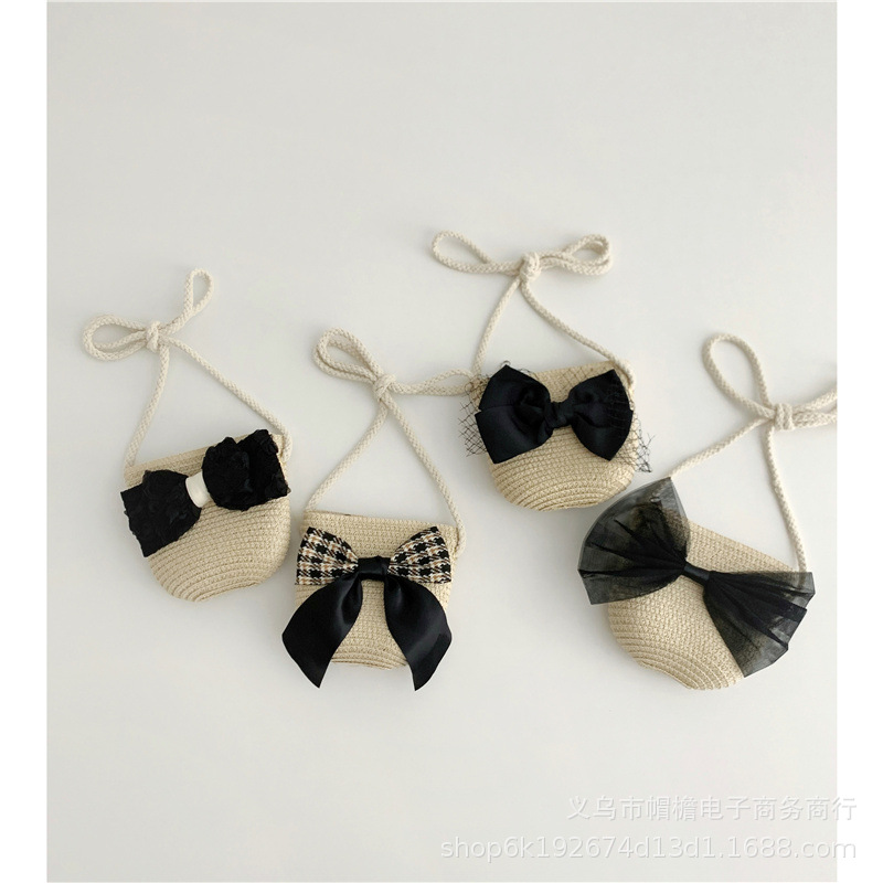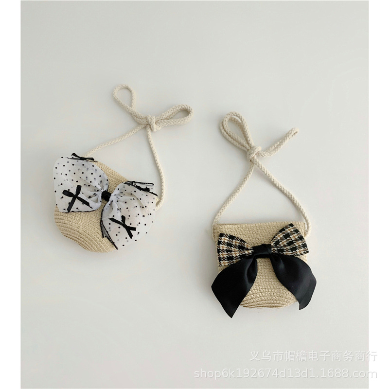 검은 활 크로스 바디 지퍼 가방 동전 지갑을 입고 어린이 여름 밀짚 가방 소녀 스타일리스트