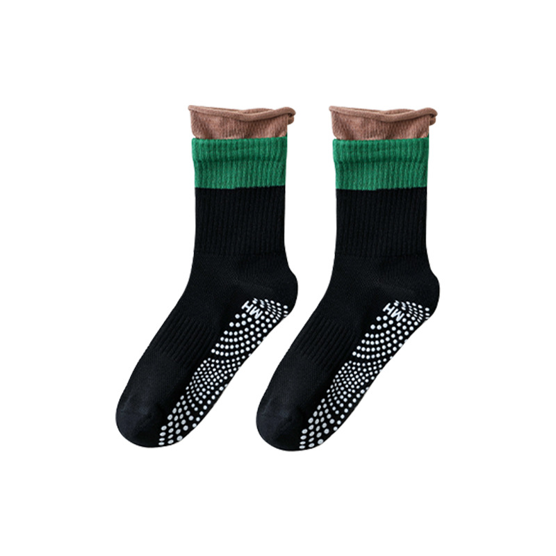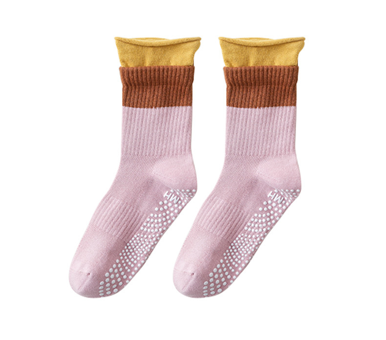 여름 새로운 대비 컬러 플랜지 요가 양말 여성 실리콘 미끄럼 방지 스포츠 유행 유행 중간 길이 양말 얇은 통기성