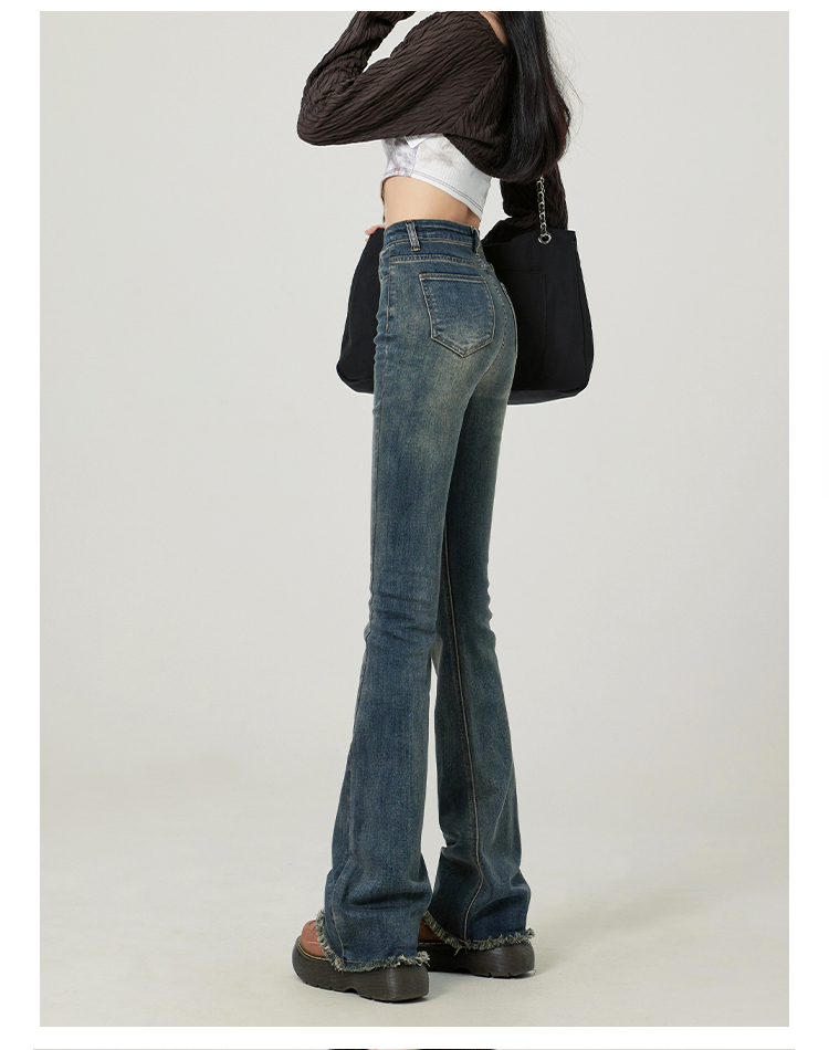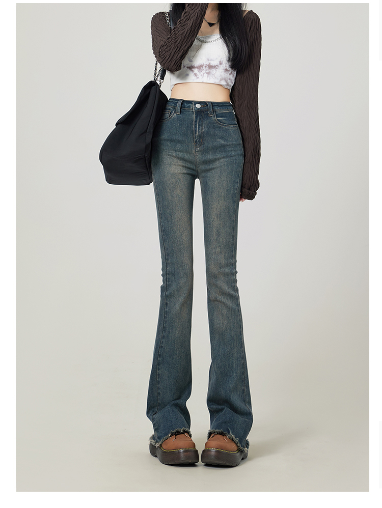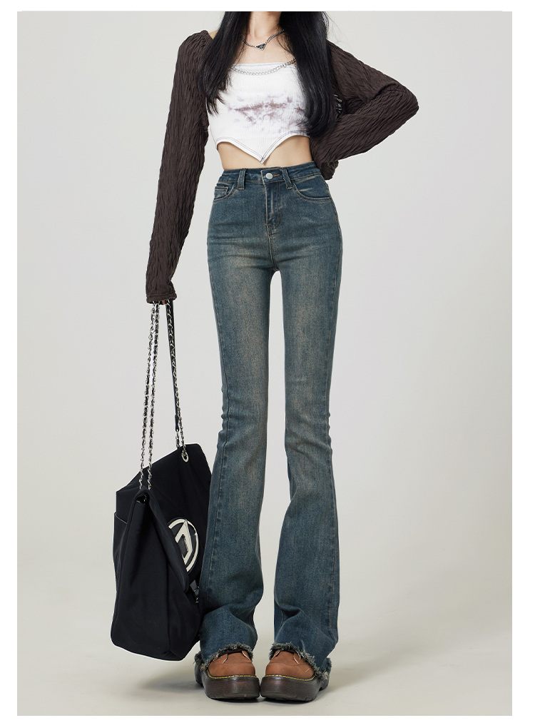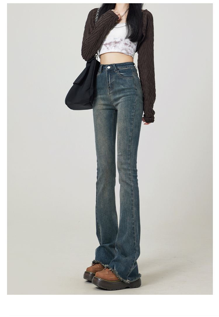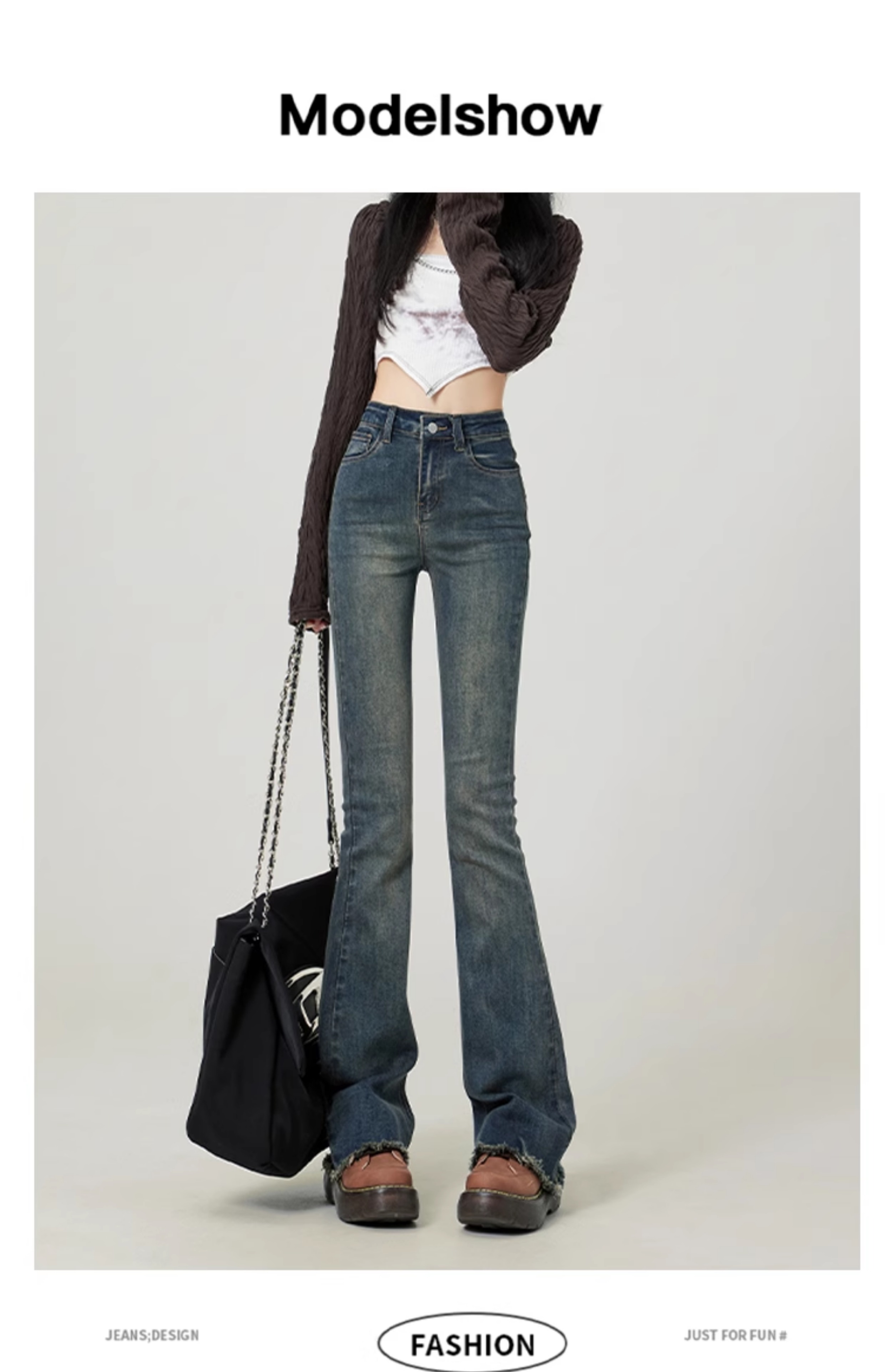 높은 허리 플라 드 청바지 여성의 2024 년 여름 새로운 시멘트 그레이 슬림 핏 슬림 말굽 바지 박차