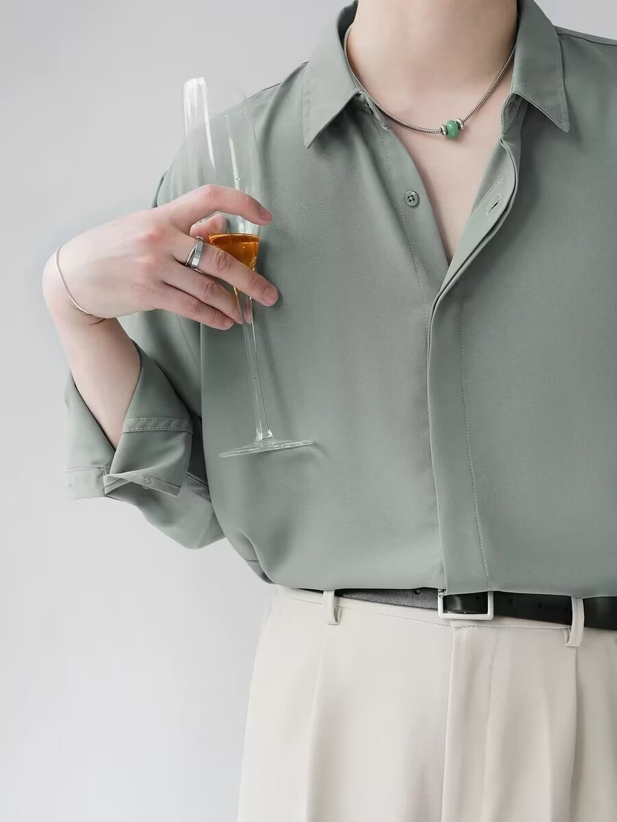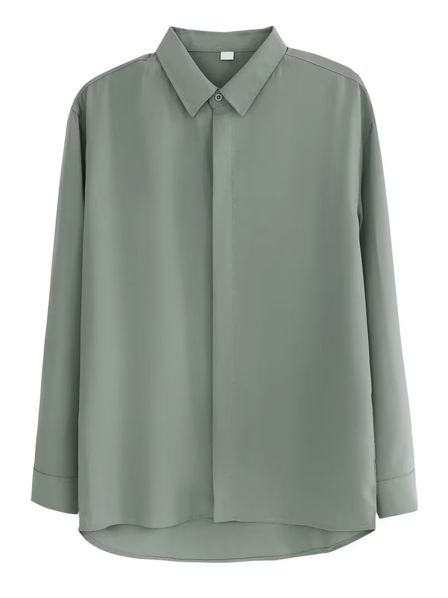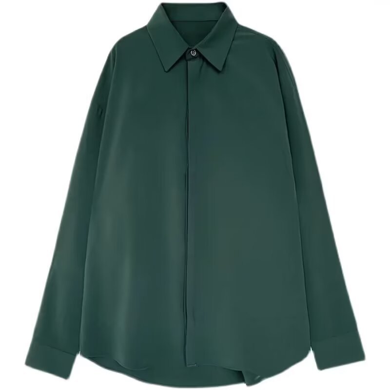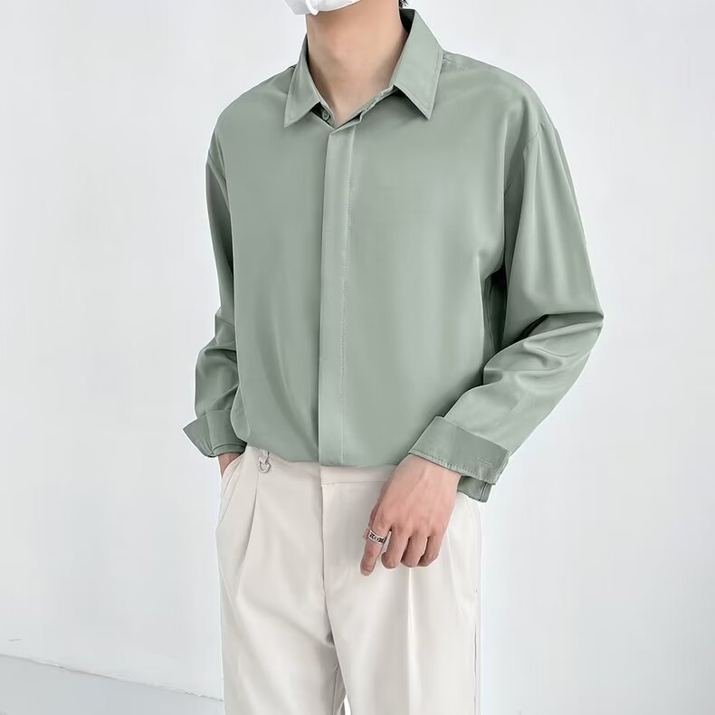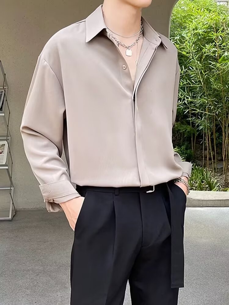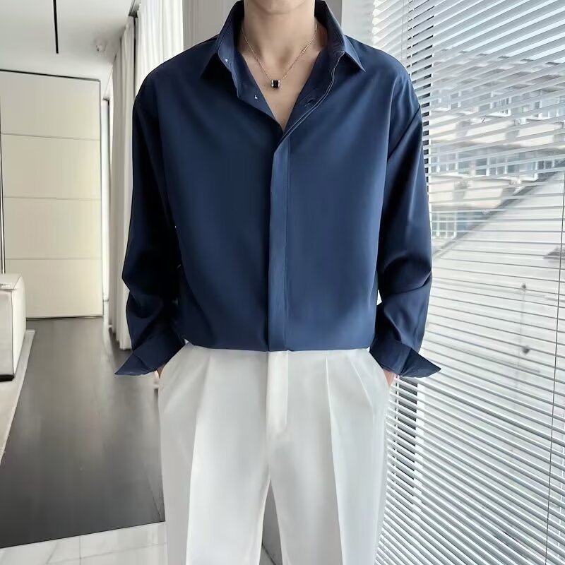 고급 다림질없는 드롭 느낌의 부드러운 단색 흑백 셔츠 남성용 긴팔 느슨한 패셔너블 행 아이스 실크 가볍게 성숙한 탑