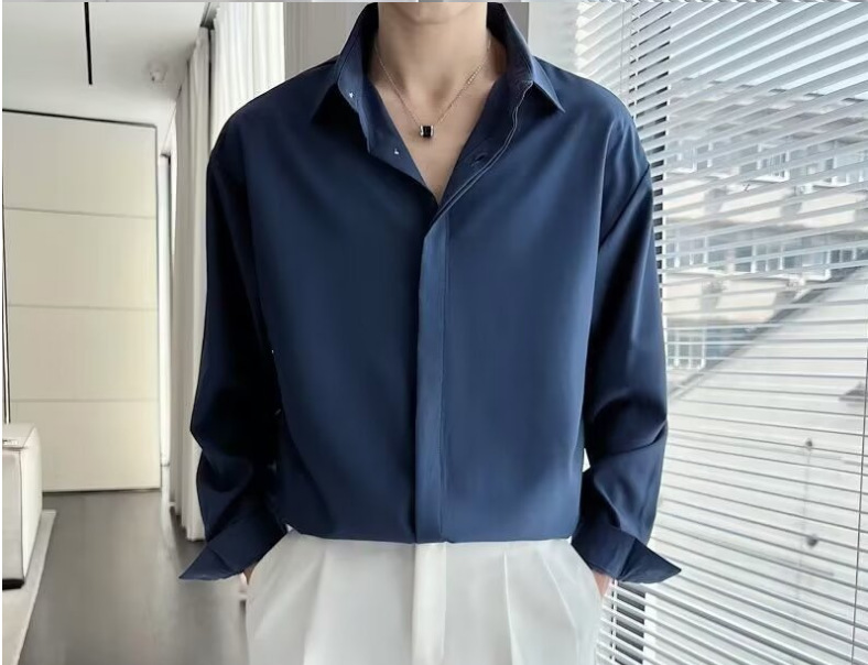 고급 다림질없는 드롭 느낌의 부드러운 단색 흑백 셔츠 남성용 긴팔 느슨한 패셔너블 행 아이스 실크 가볍게 성숙한 탑스토어 가기