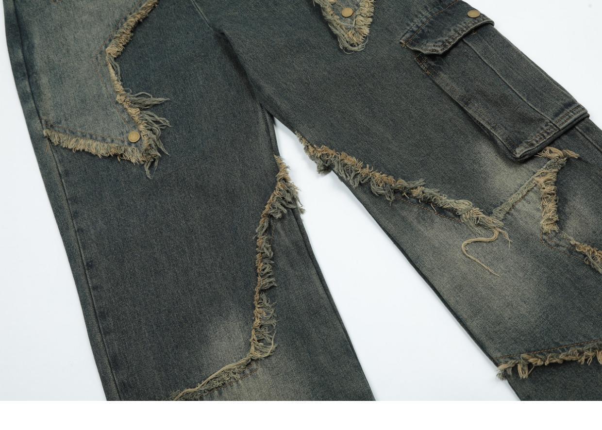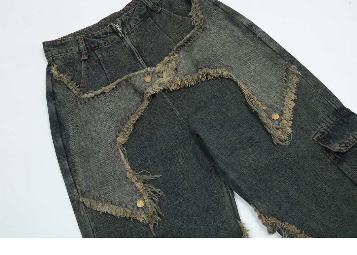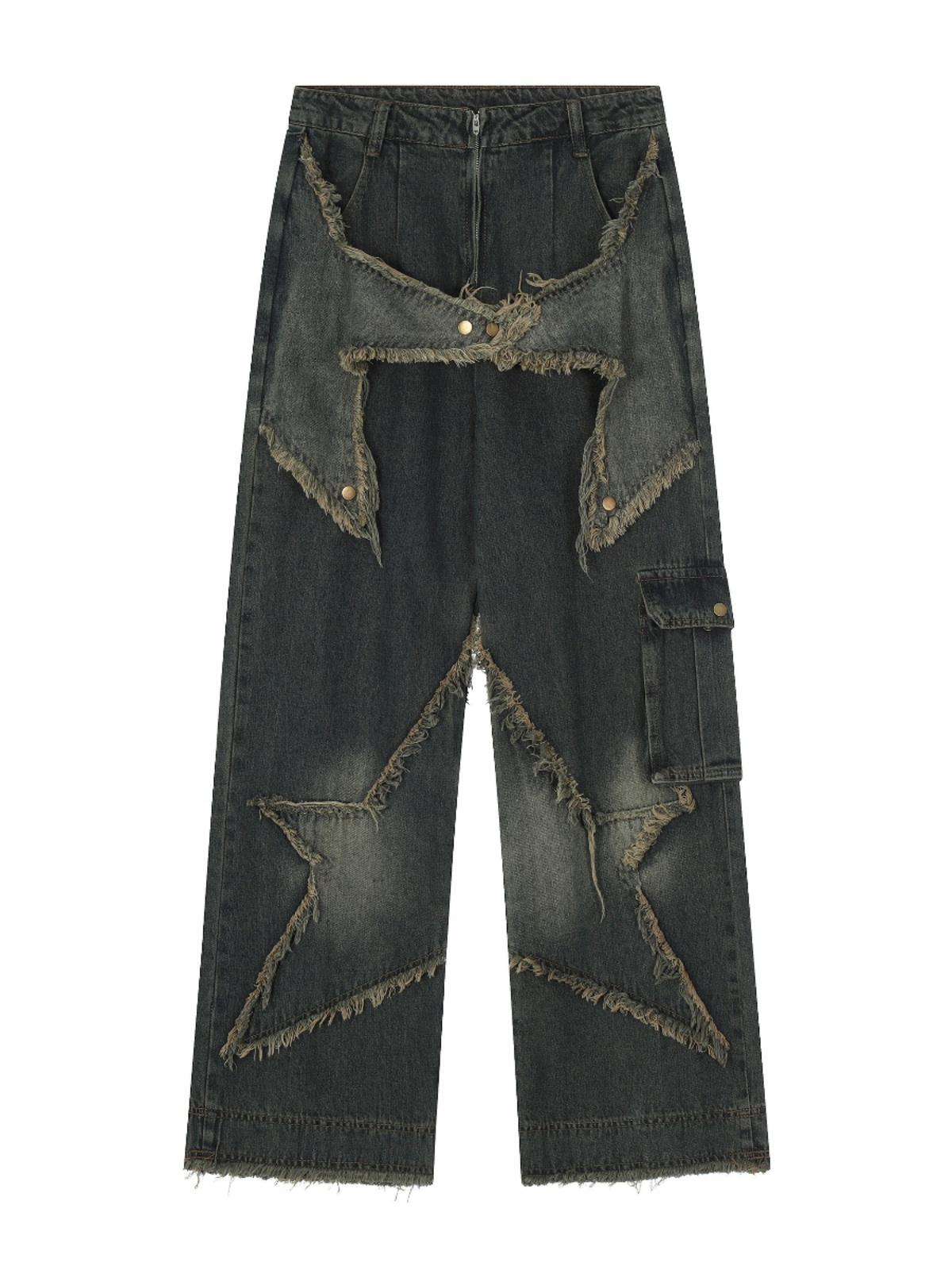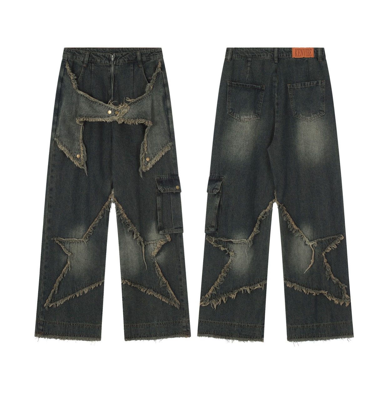美式复古多口袋星星毛边牛仔裤男女款潮牌宽松水洗做旧阔腿裤子夏