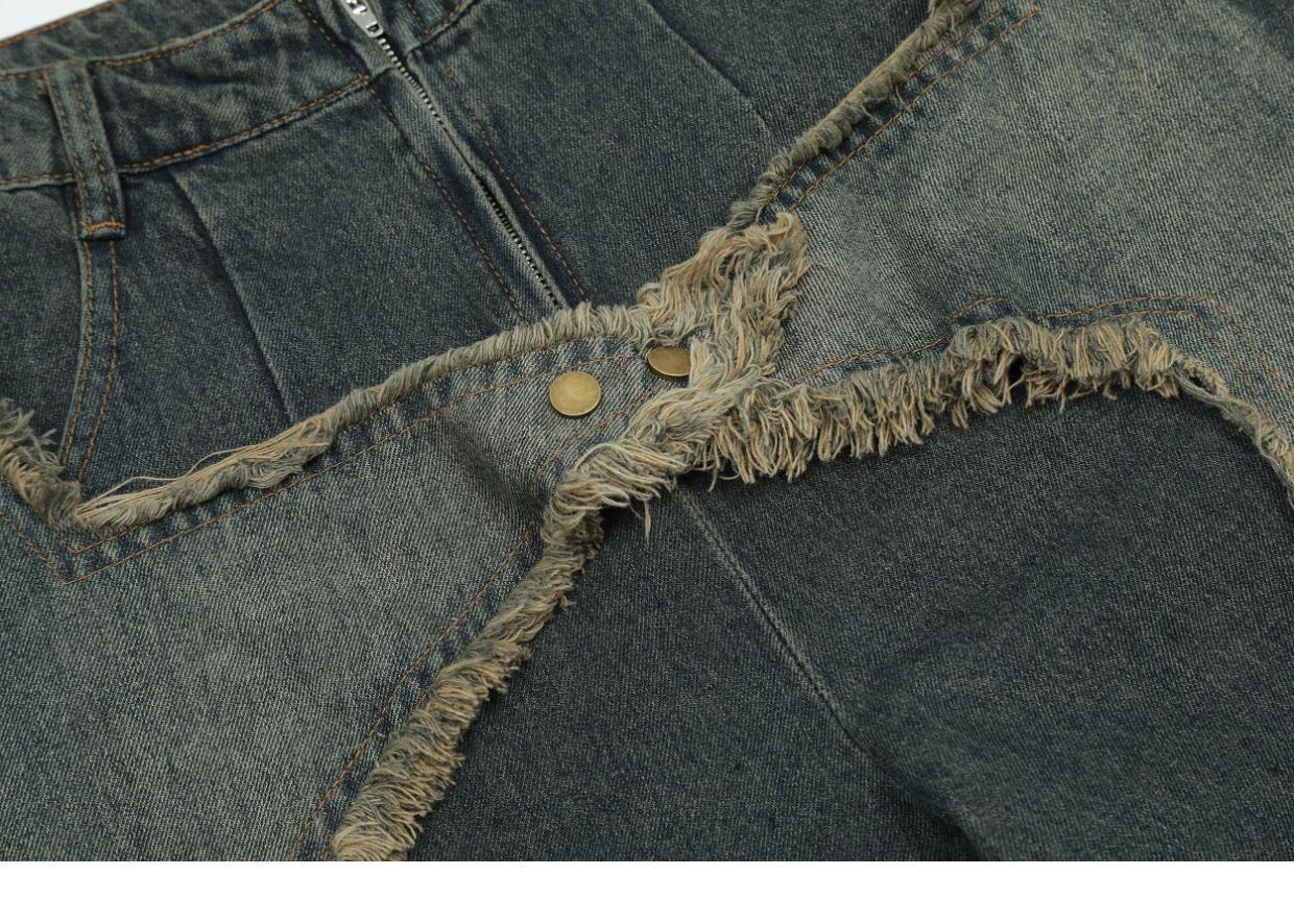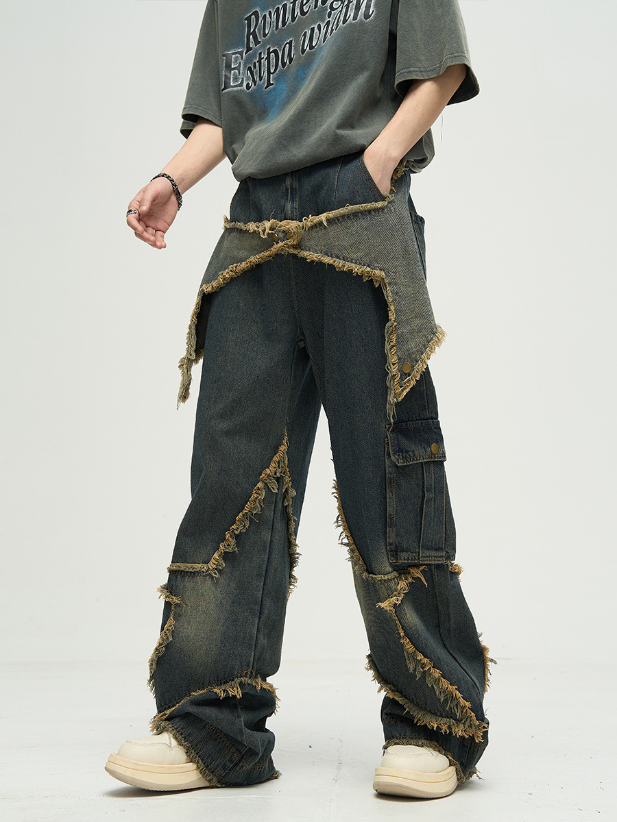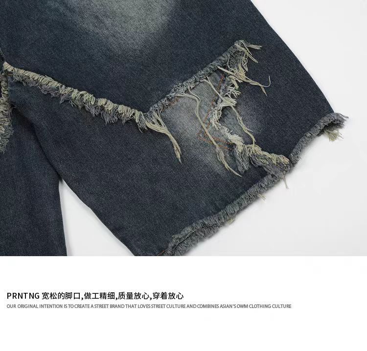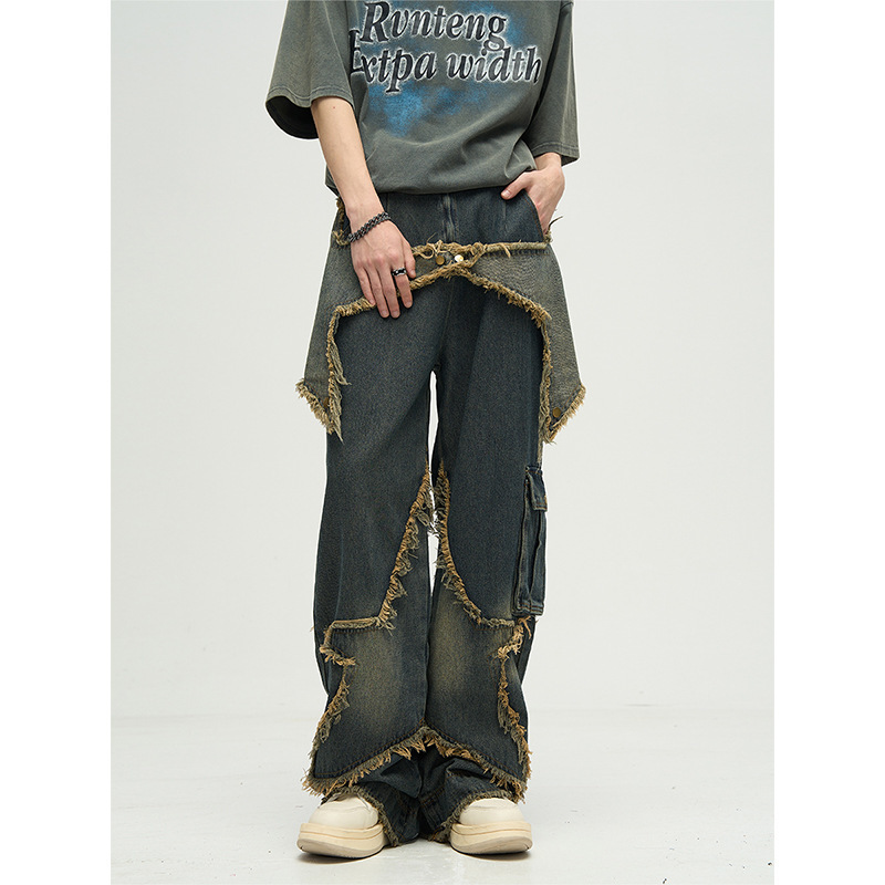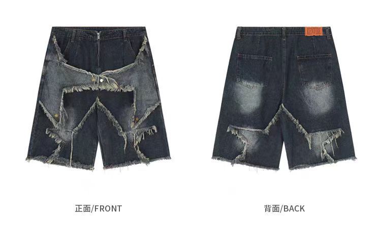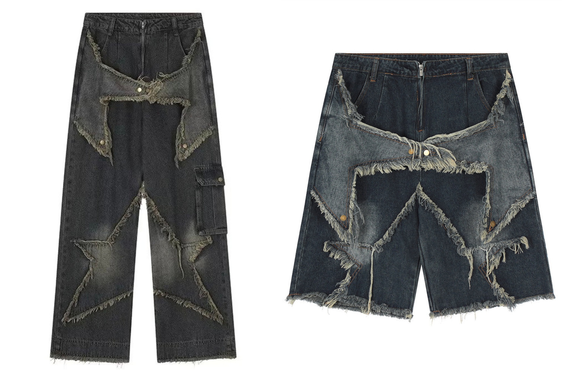 美式复古多口袋星星毛边牛仔裤男女款潮牌宽松水洗做旧阔腿裤子夏