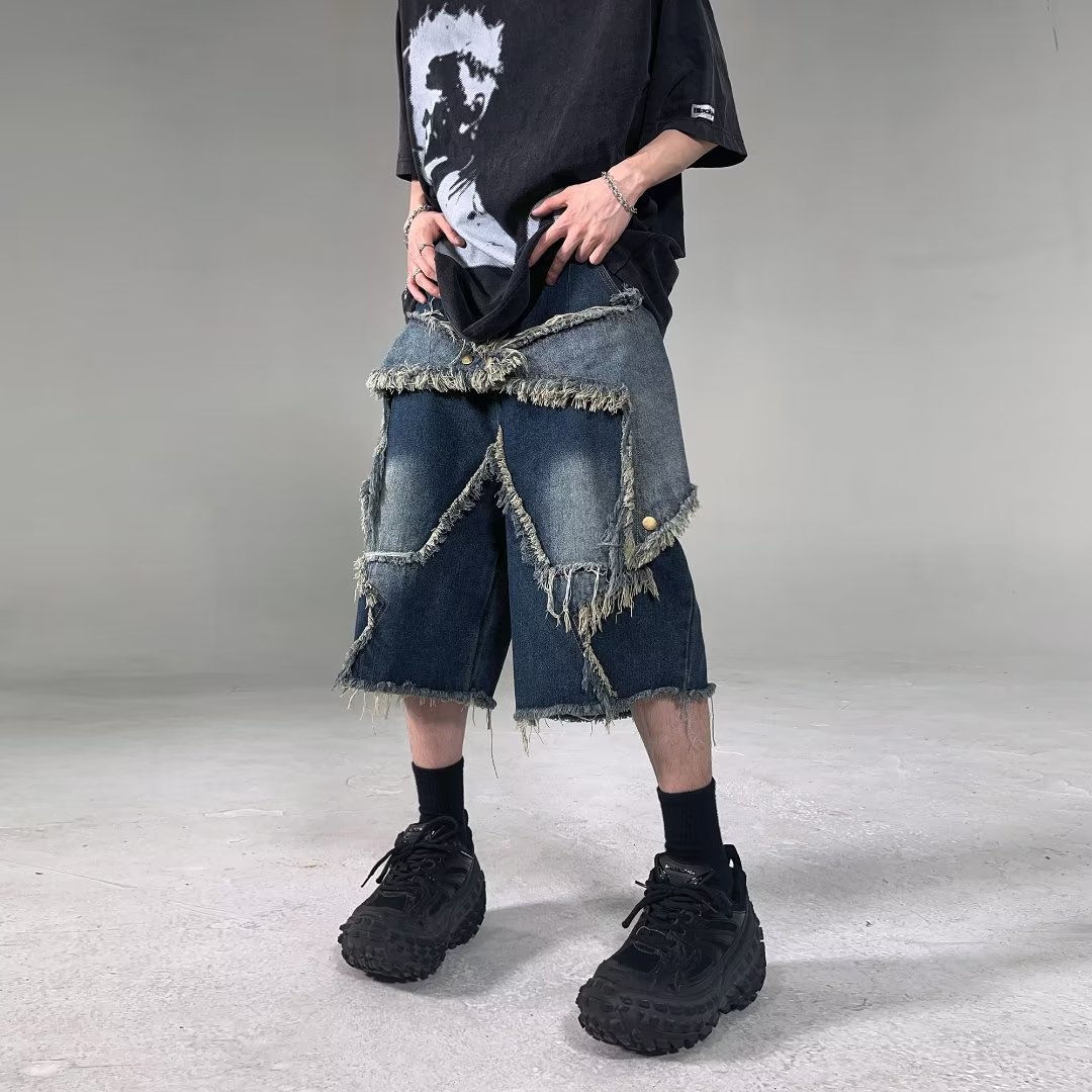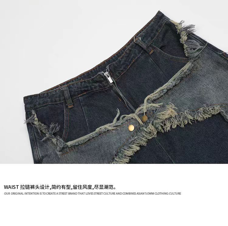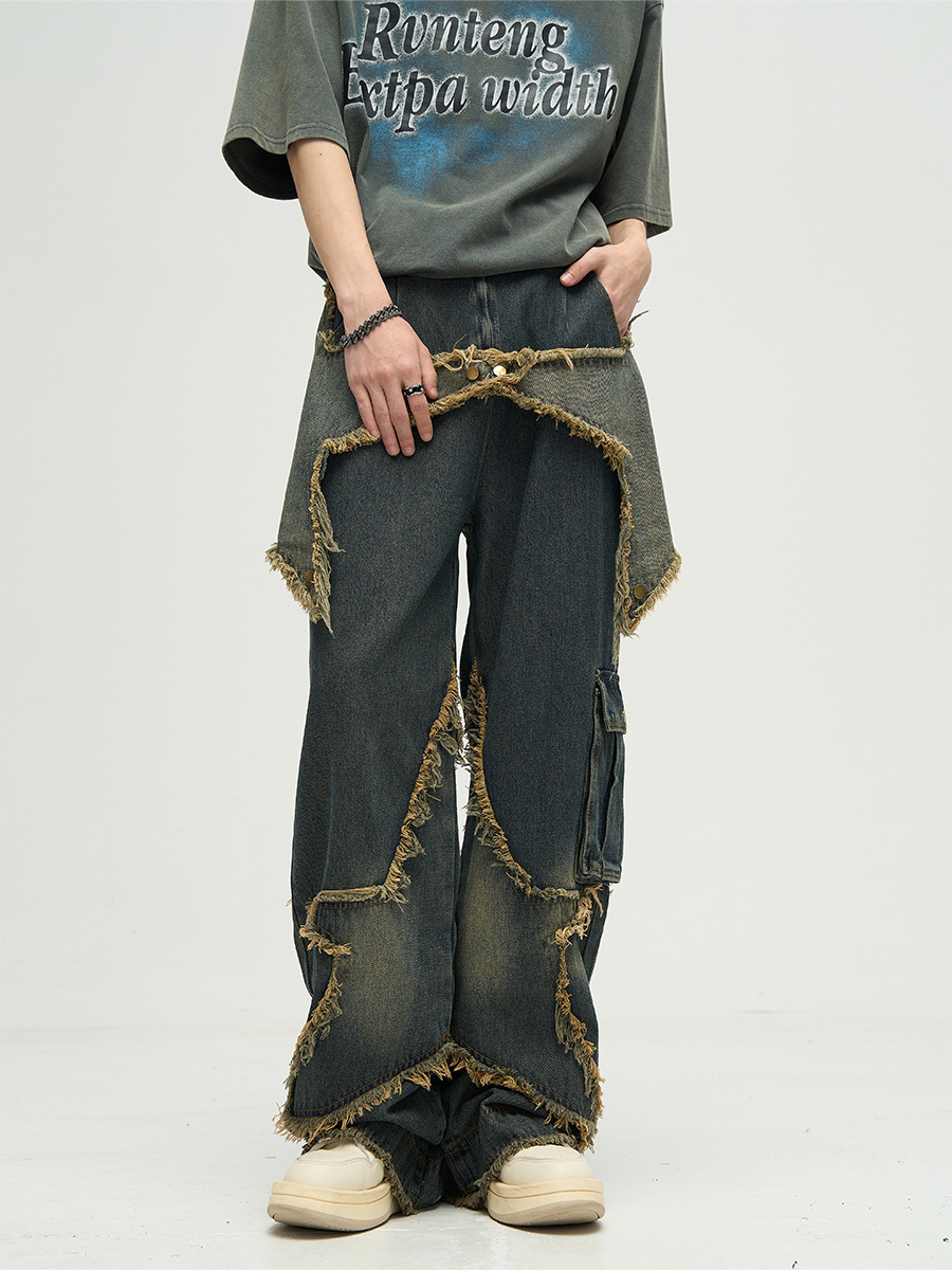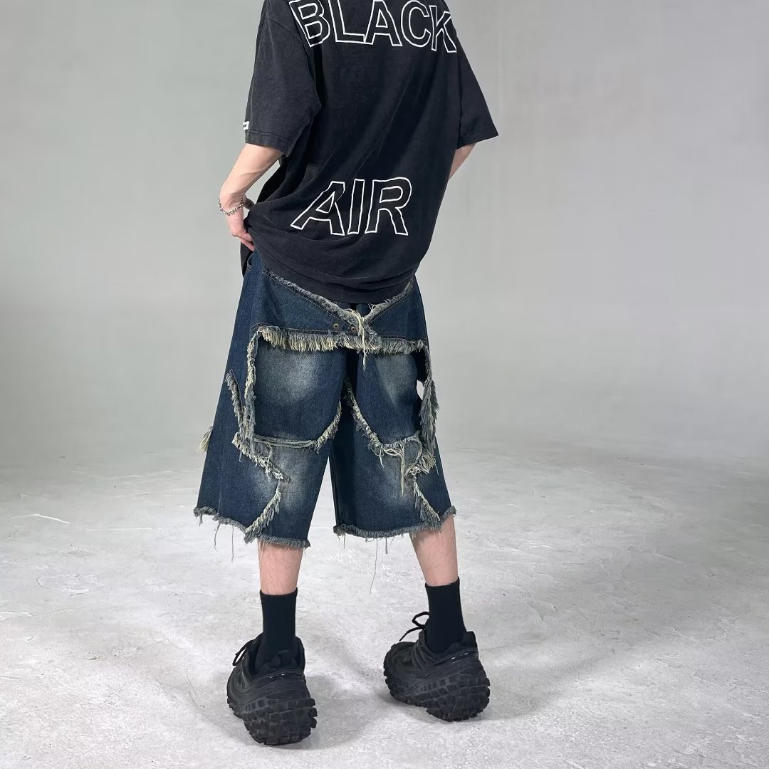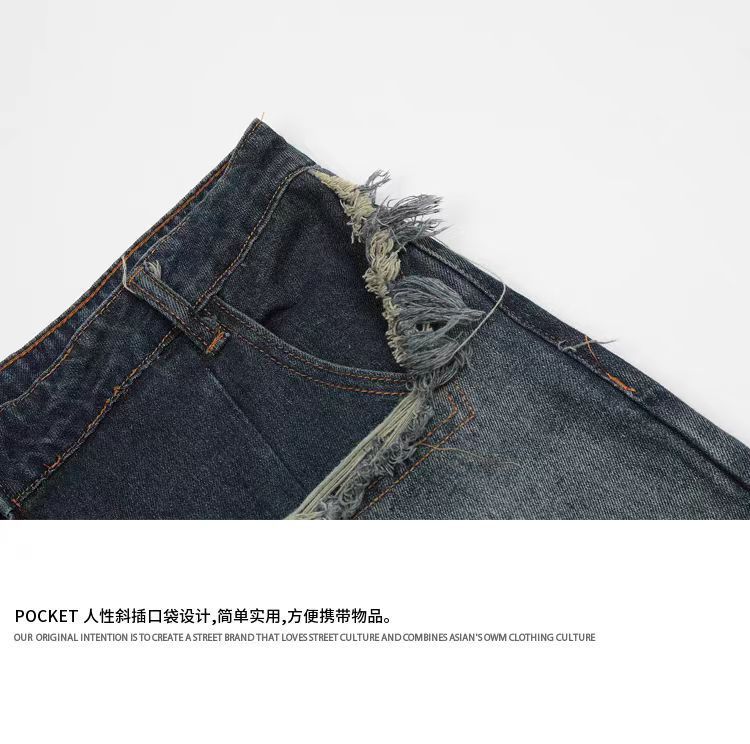 美式复古多口袋星星毛边牛仔裤男女款潮牌宽松水洗做旧阔腿裤子夏