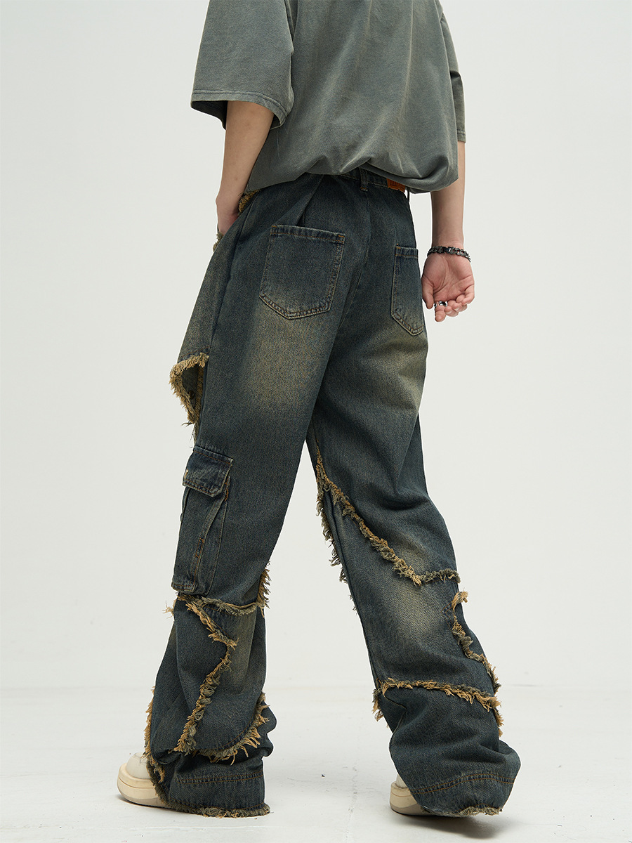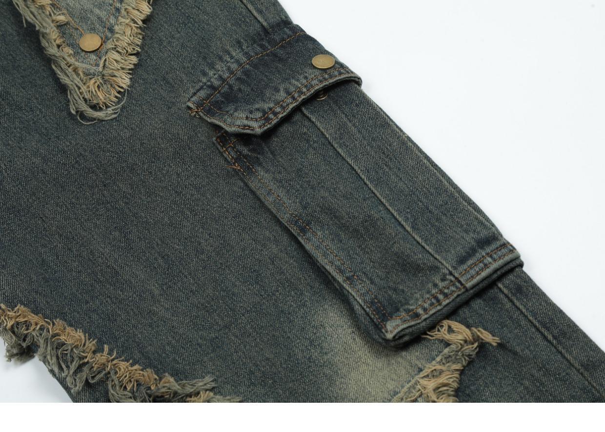 아메리칸 스타일 빈티지 멀티 포켓 스타 래플 청바지 남성과 여성의 패션 브랜드 느슨하게 씻은 오래된 넓은 다리 바지 여름스토어 가기