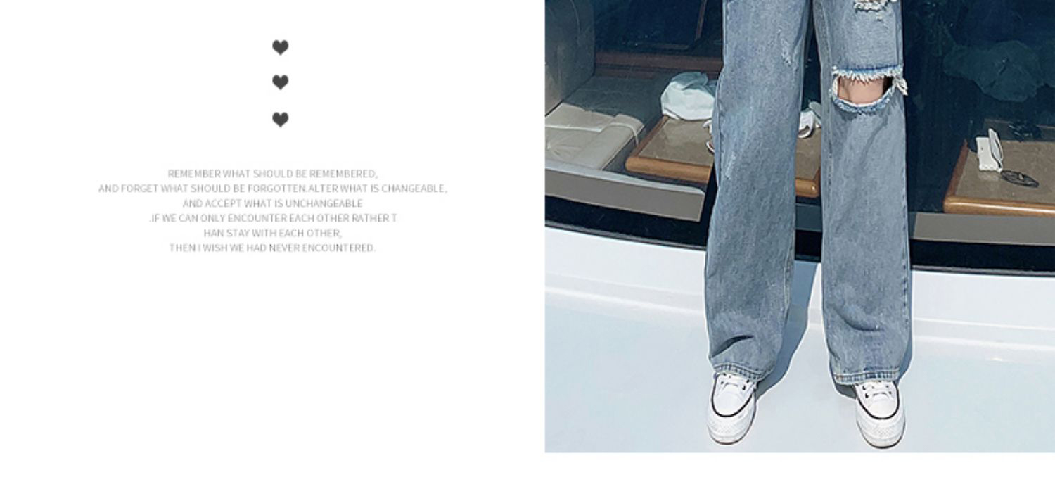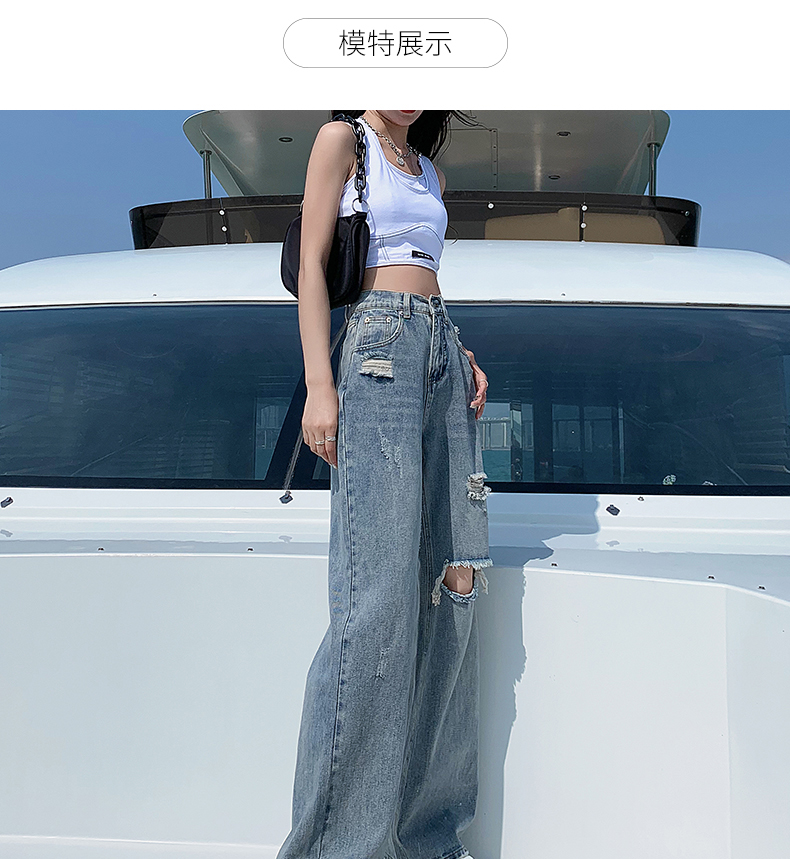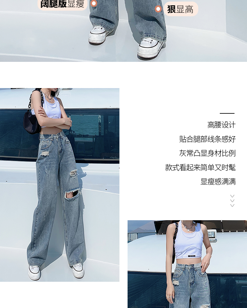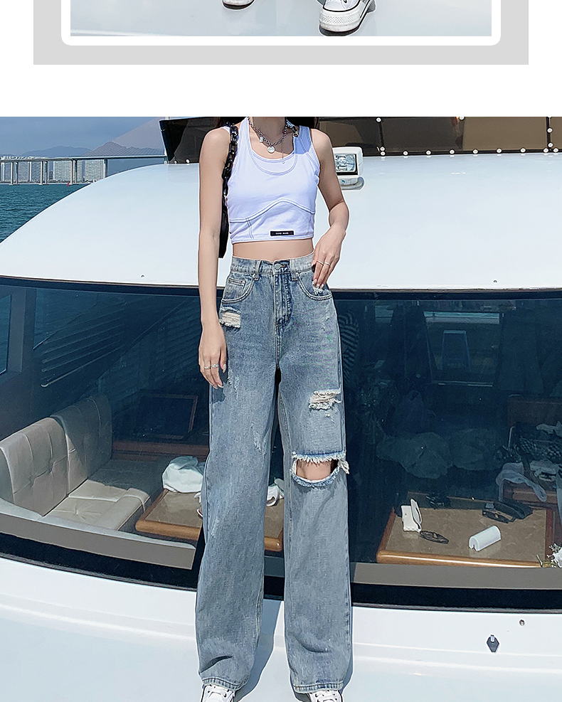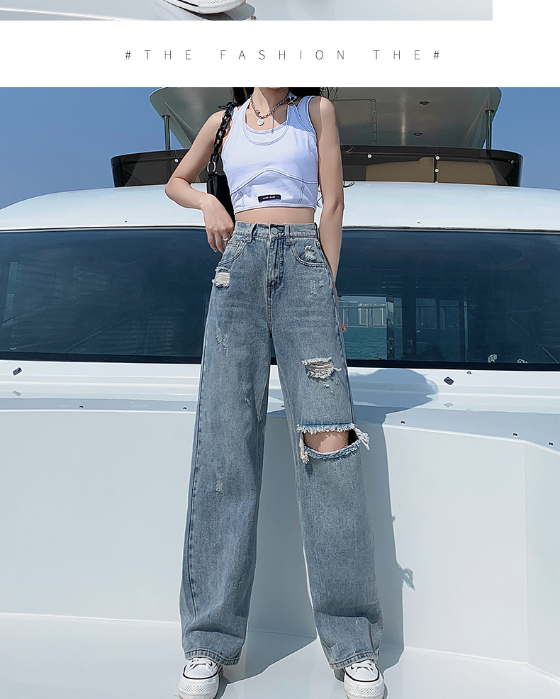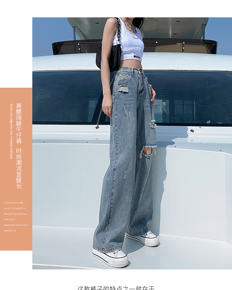 찢어진 청바지 여성의 여름 2024 봄과 가을 새로운 높은 허리 슬리밍 스트레이트 튜브 정에있는 작은 넓은 다리 바지 투약스토어 가기