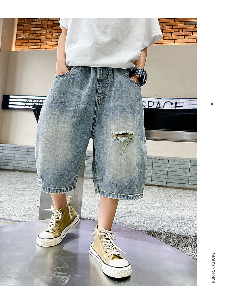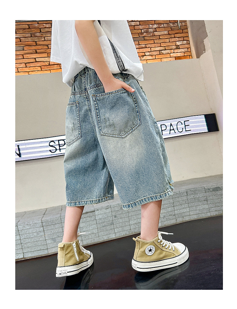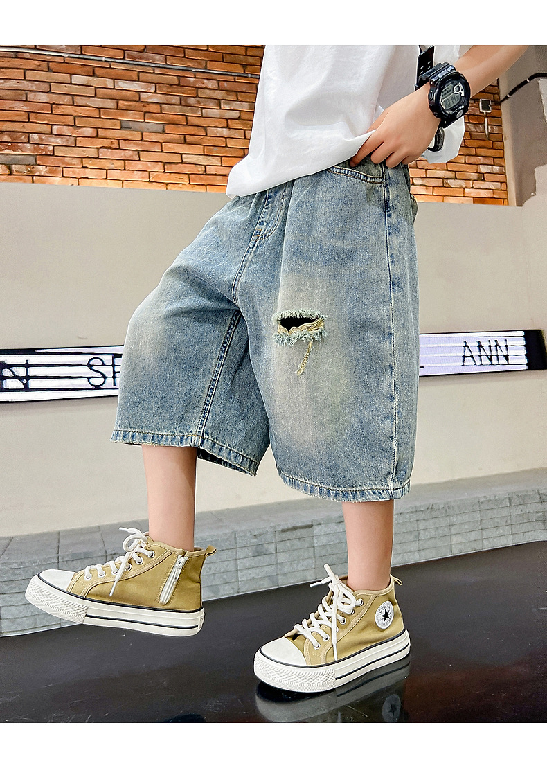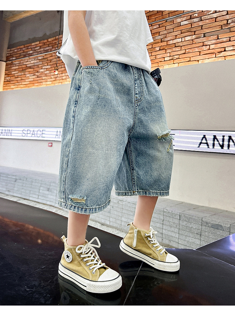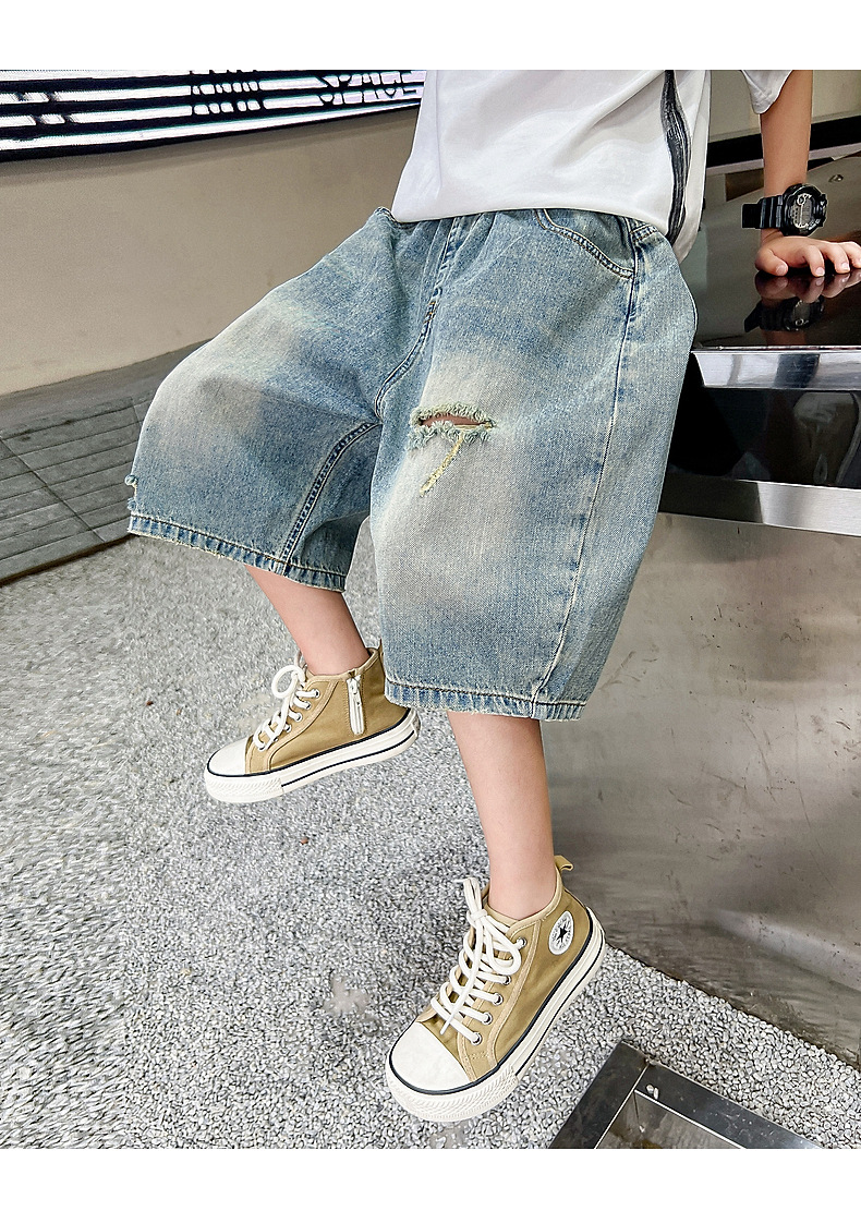 남아 트렌디 브랜드 데미지 데님 반바지 여름 2025년 신상 한국 스타일 아동용 멋스러운 중대형 아동 바지스토어 가기