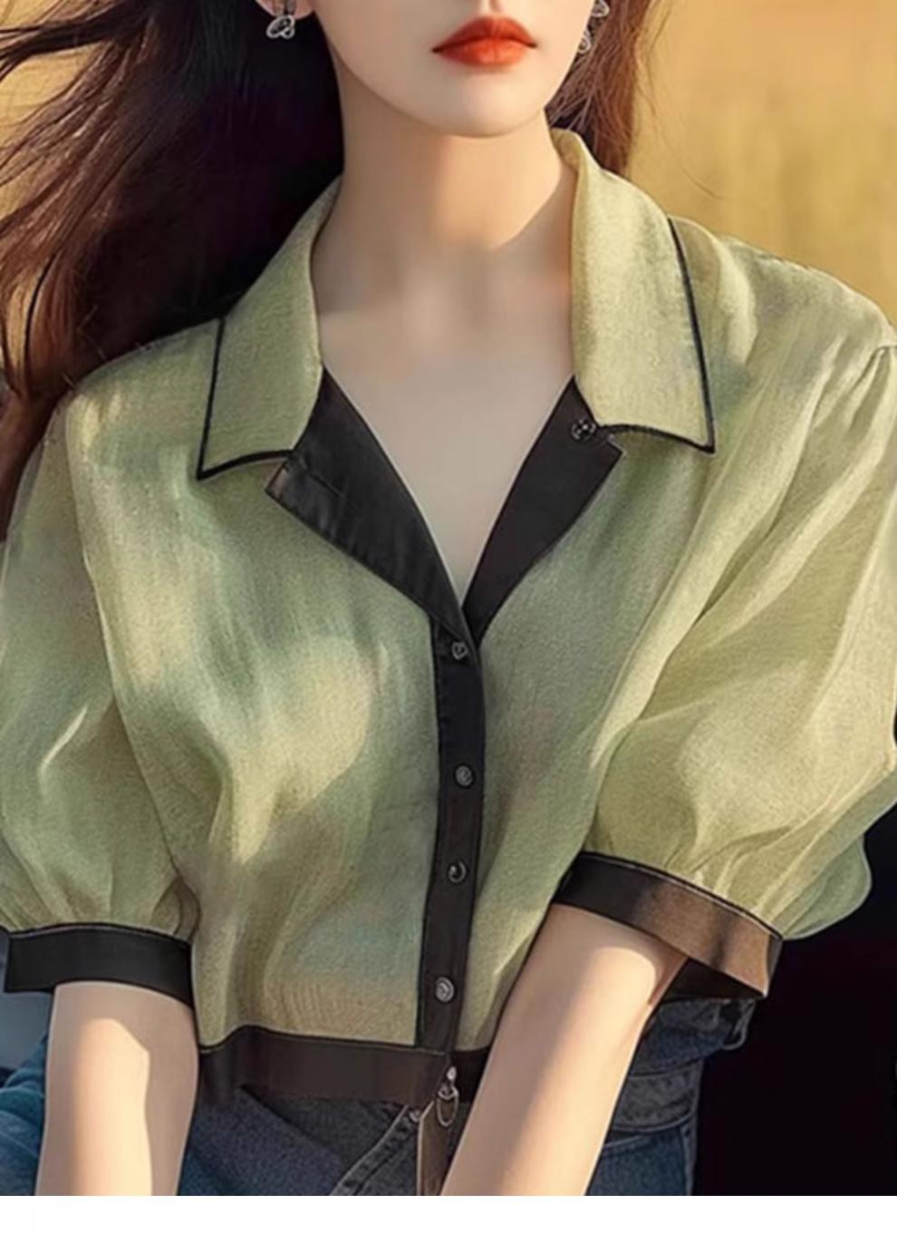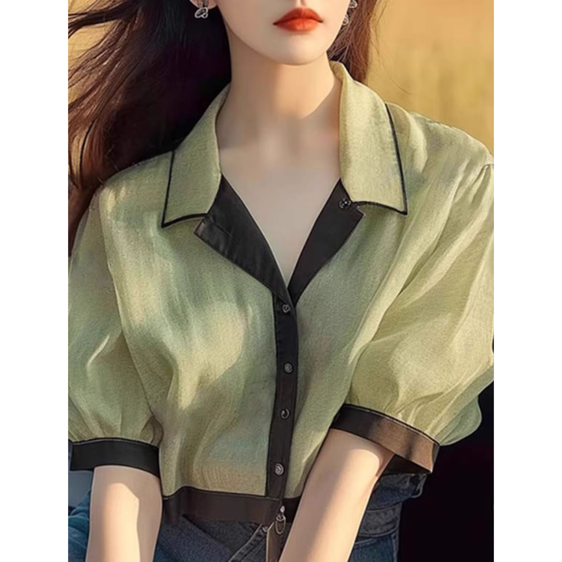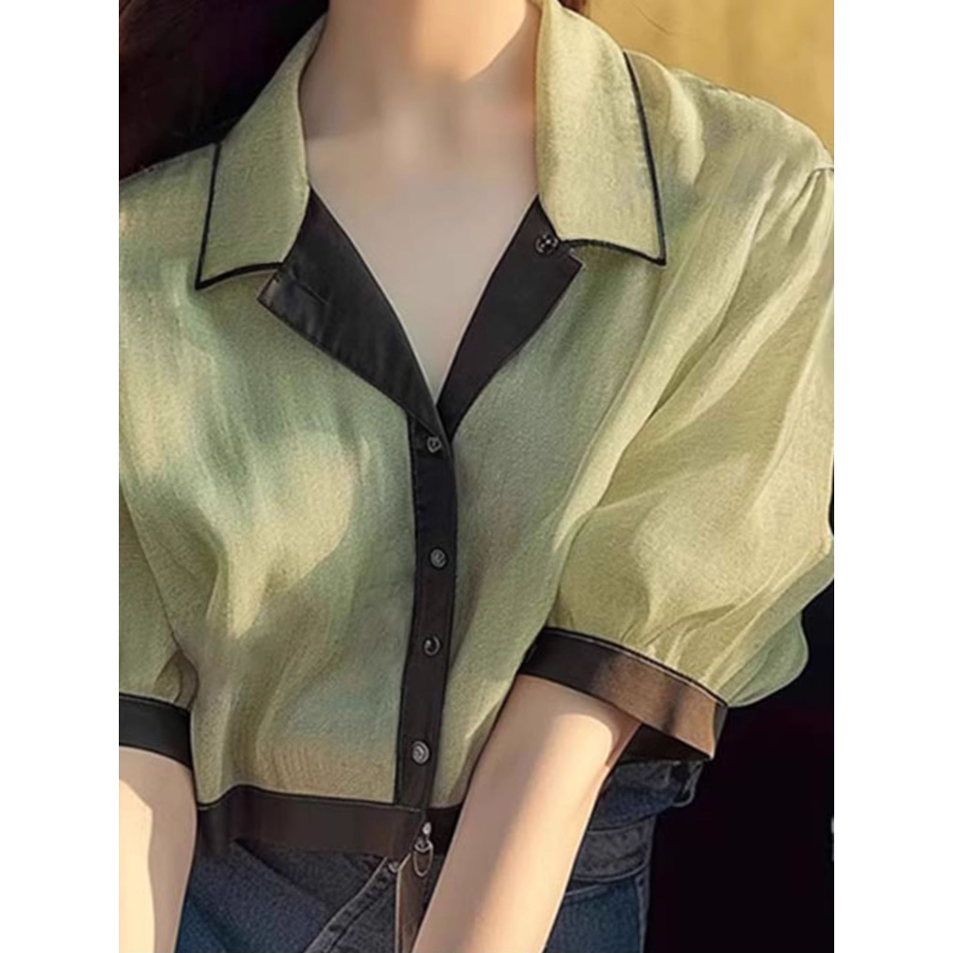 2024 Xia Xin 중국 스타일 녹색 반팔 쉬폰 셔츠 여성 Qihaomi No.6 가게 세련된 달콤하고 뜨거운 작은 탑