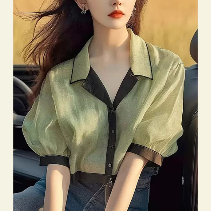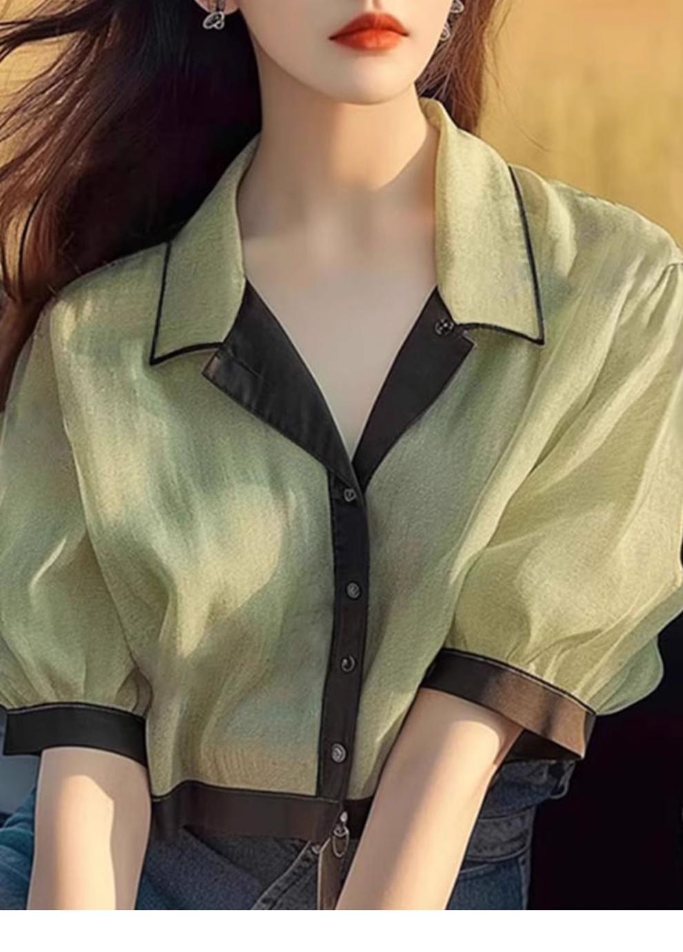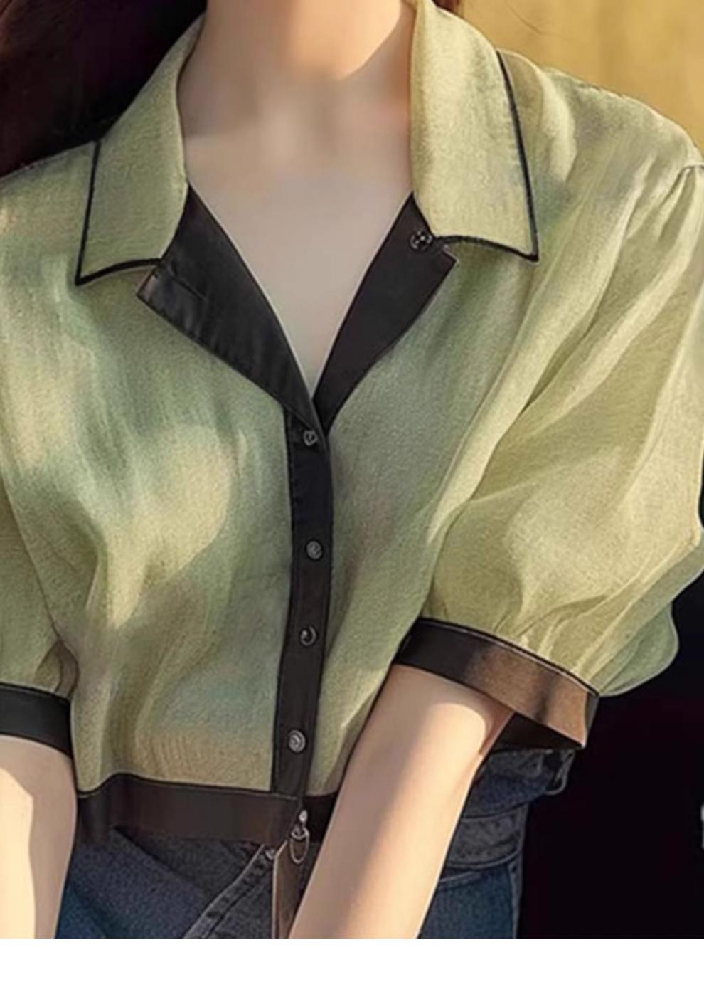 2024 Xia Xin 중국 스타일 녹색 반팔 쉬폰 셔츠 여성 Qihaomi No.6 가게 세련된 달콤하고 뜨거운 작은 탑