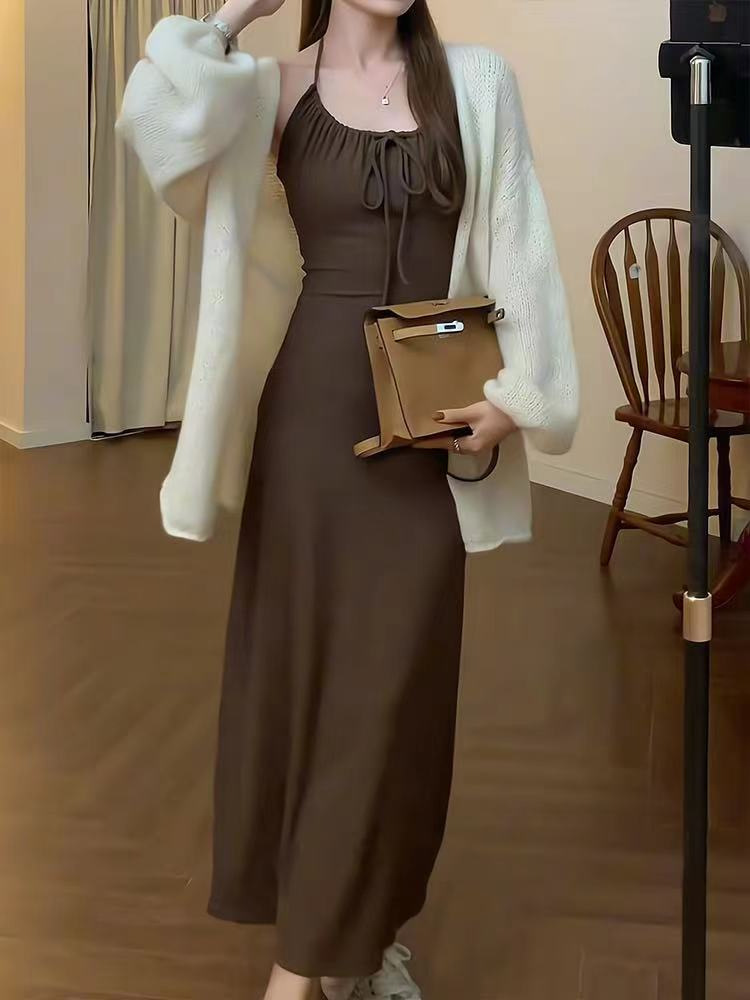 라이트 그레이 스트랩 넥 원피스 여름 섹시한 순수한 욕망 슬림 핏 스트랩 백리스 롱 원피스