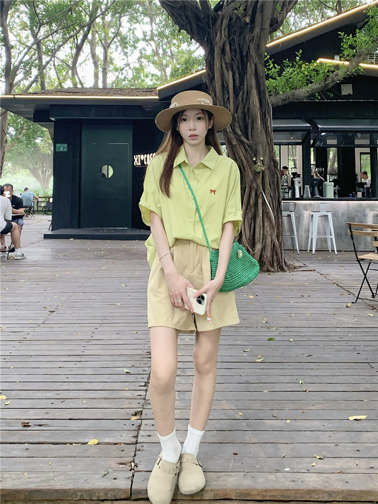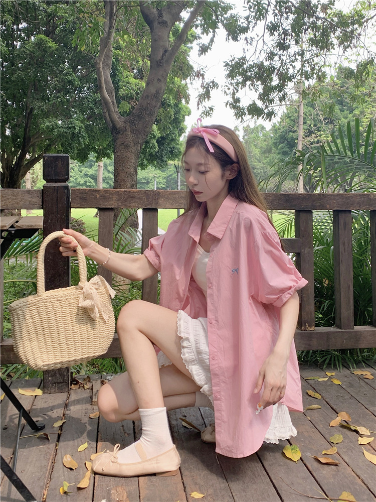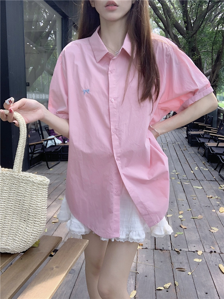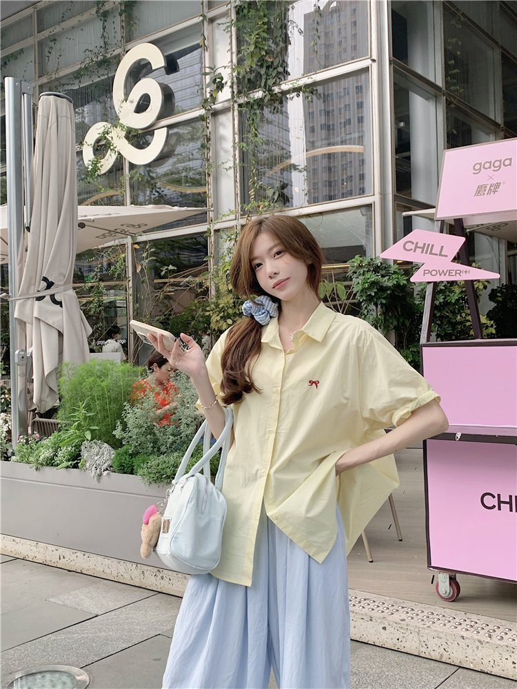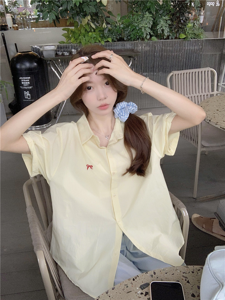 듀오 미스트 2024 디자인 폴로 칼라 반팔 셔츠 코트 여성 여름 활 자수 중간 길이 탑스토어 가기
