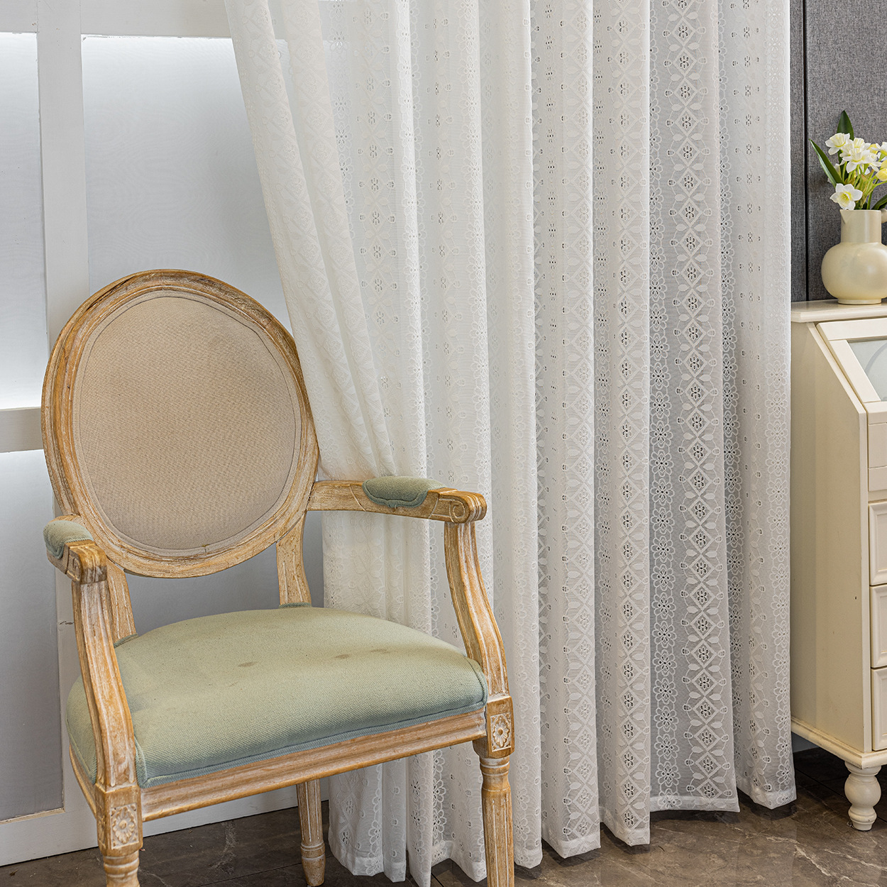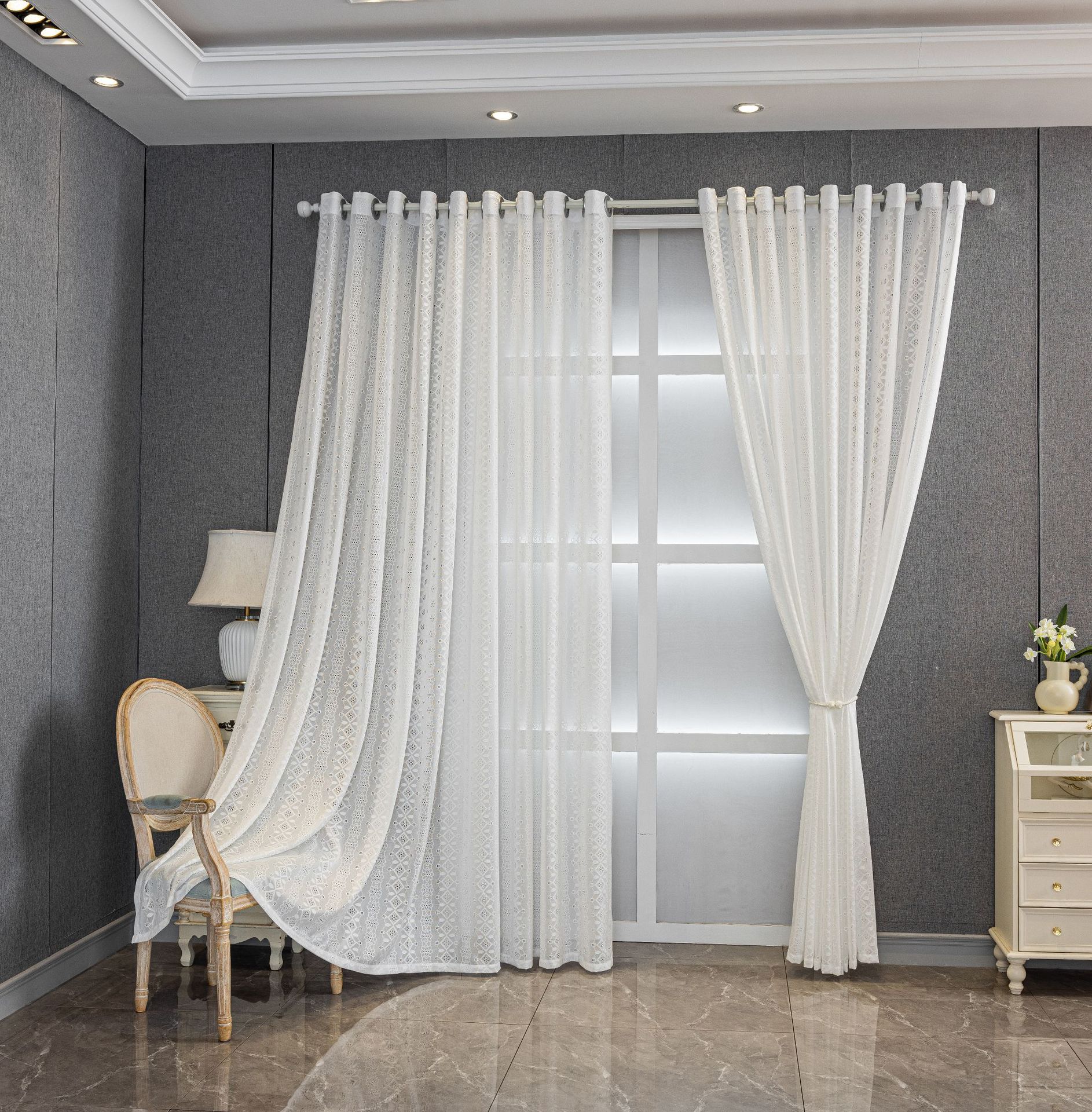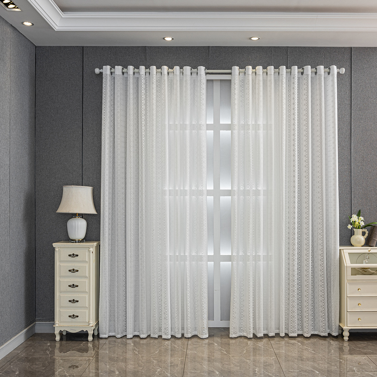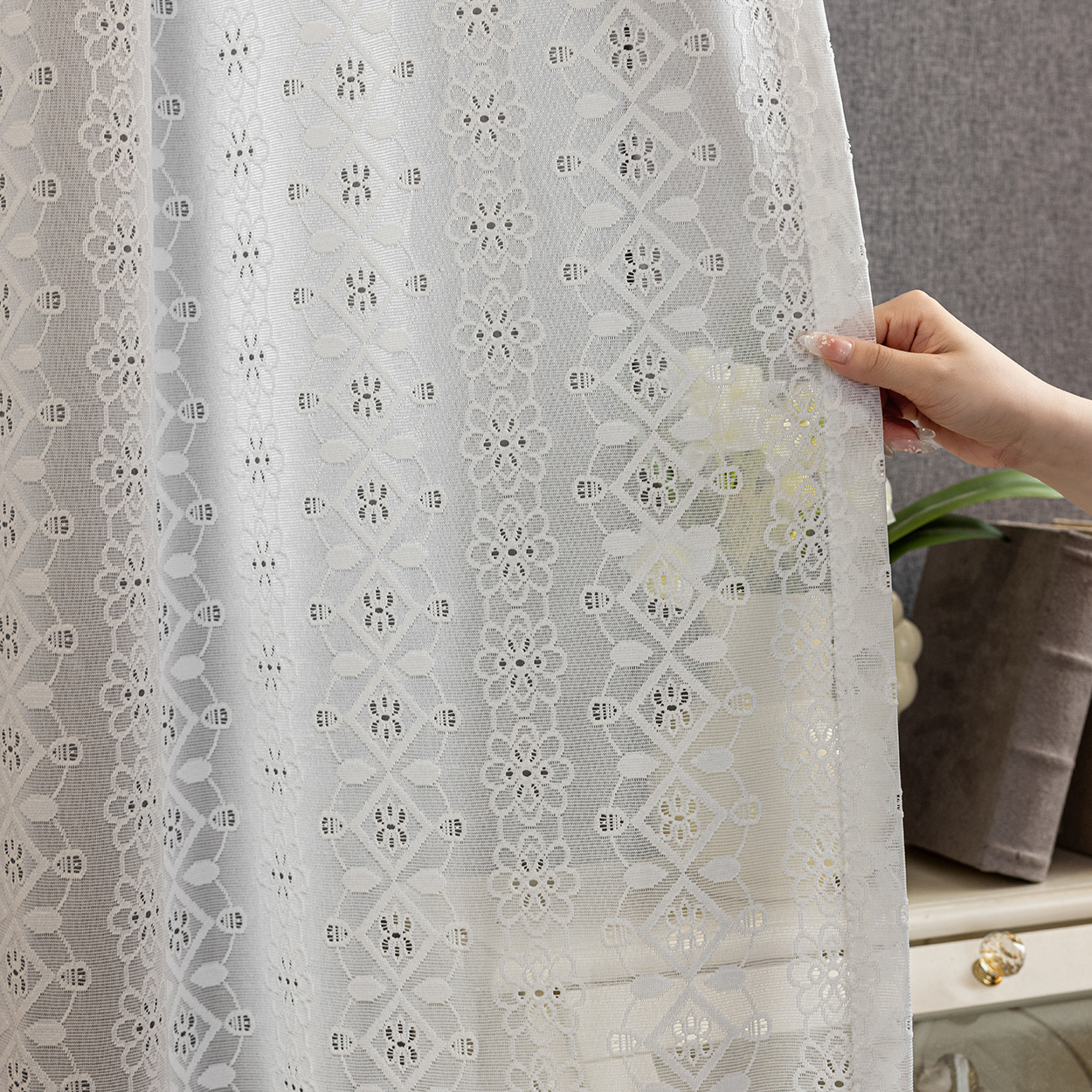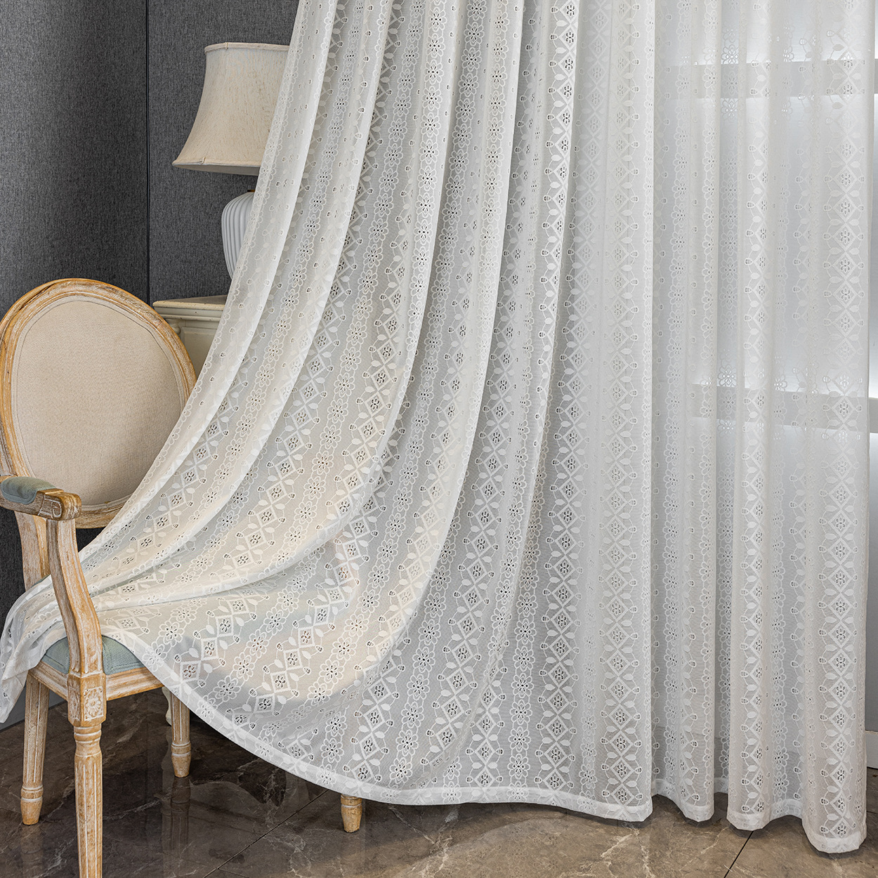 현대 기하학적 다이아몬드 화이트 레이스 자카드 거즈 커튼 라이트 럭셔리 패션 거실 침실 발코니 창 화면 국경 간 완제품스토어 가기