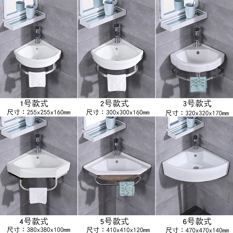 삼각형 분지 벽 코너 브래킷 세면기 작은 아파트 벽에 장착 된 대형 코너 세라믹 세면기 정스토어 가기