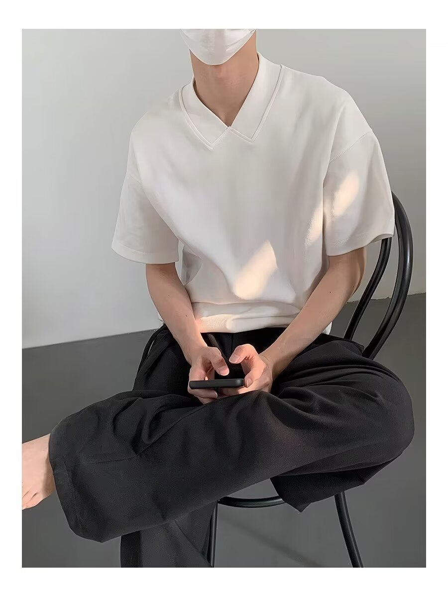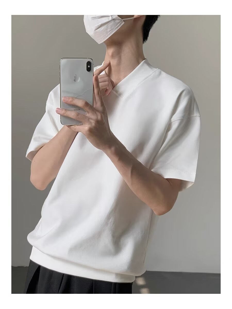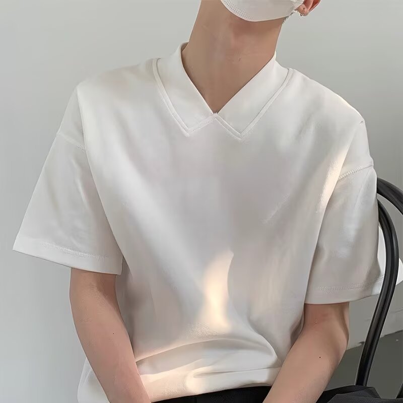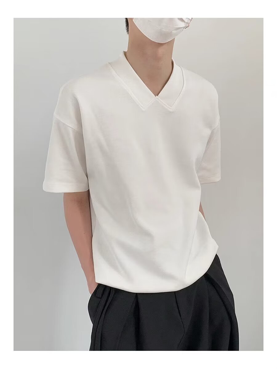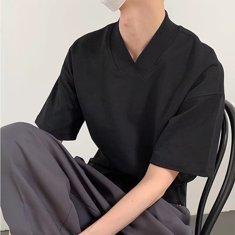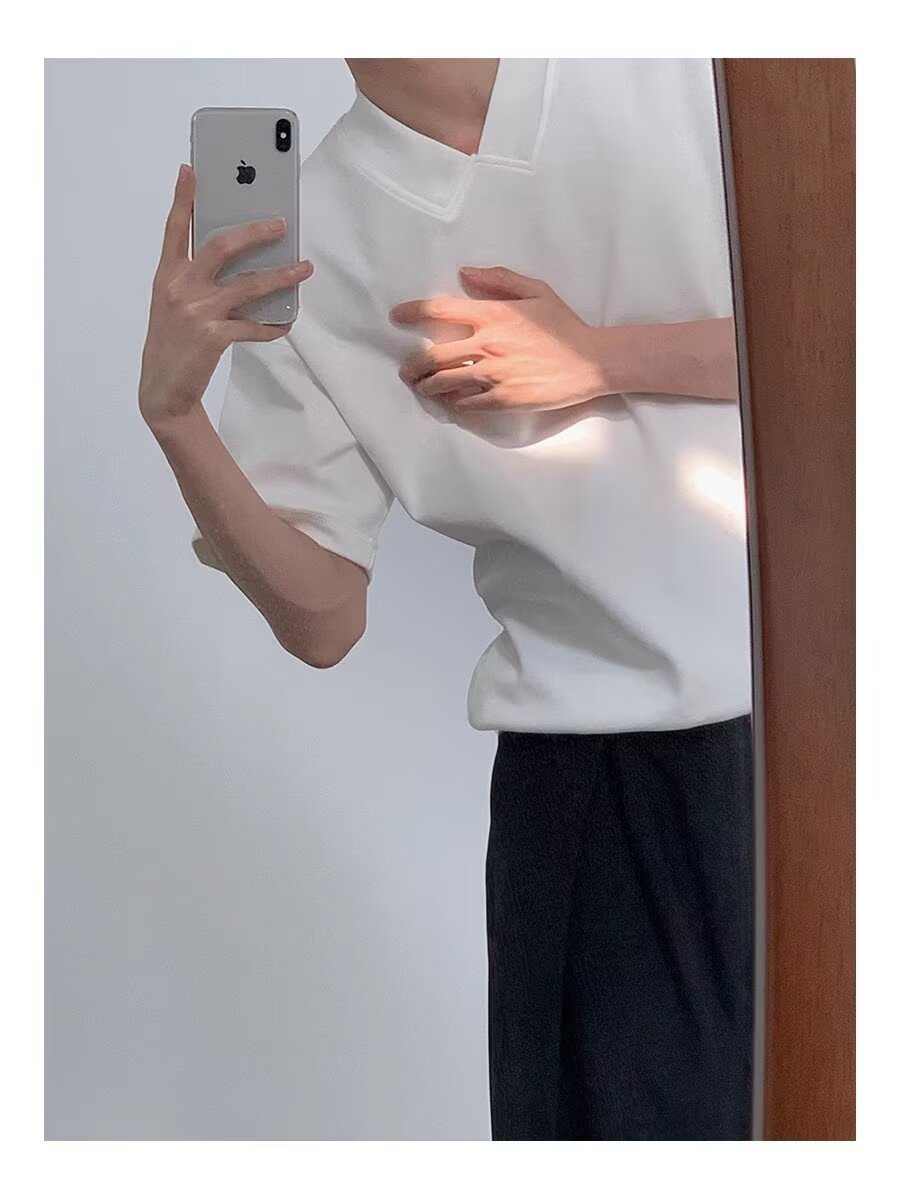 여름 얇은 반팔 올 매치 솔리드 컬러 한국 스타일 티셔츠 한국 뉴 남성 탑 V 넥 루즈 캐주얼 니트 셔츠