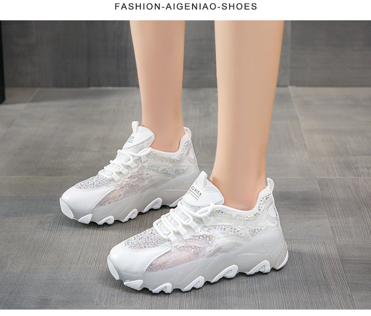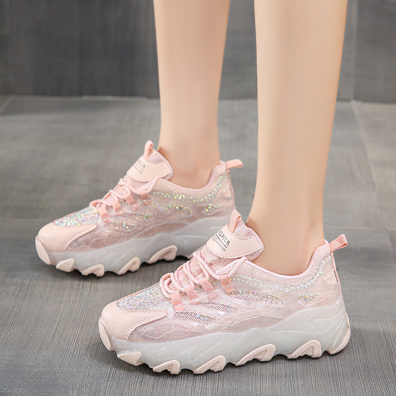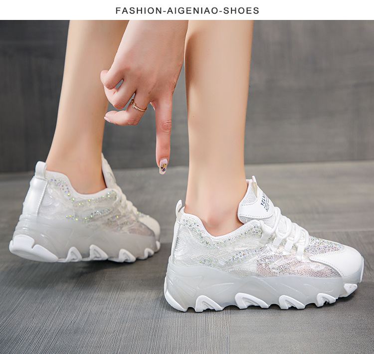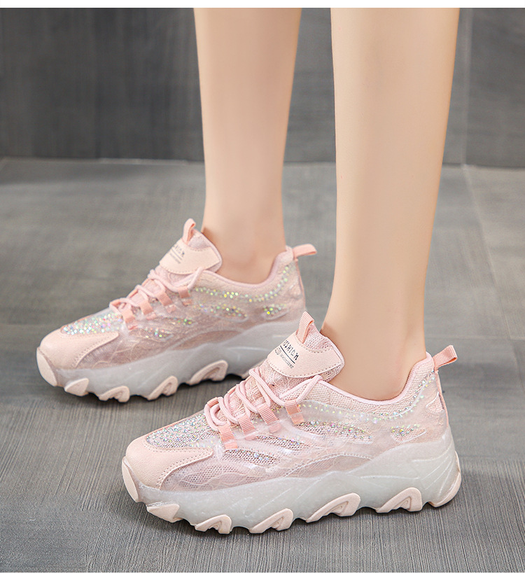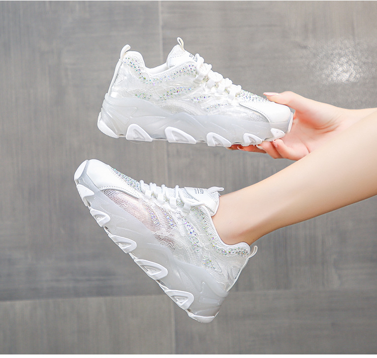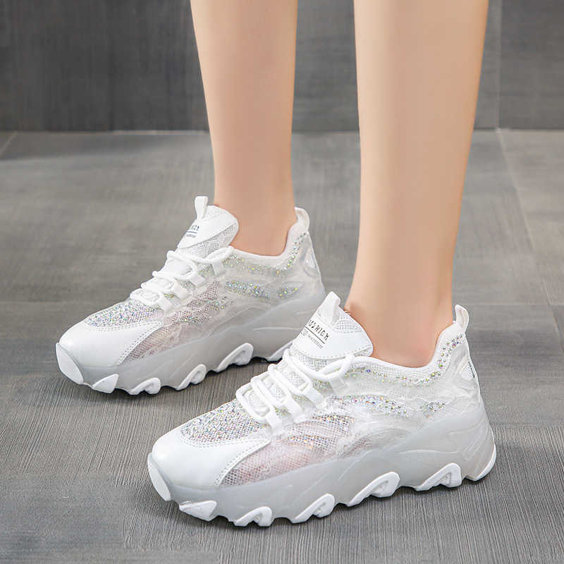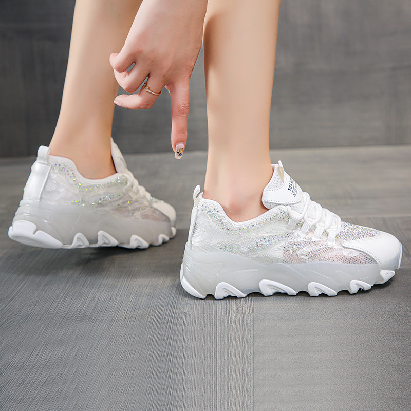 캐주얼 스포츠 메쉬 토레 신발 여성의 봄과 가을 새로운 2024 Rhinestone Jelly 하단 통기성 두꺼운 솔 증가 메쉬 신발