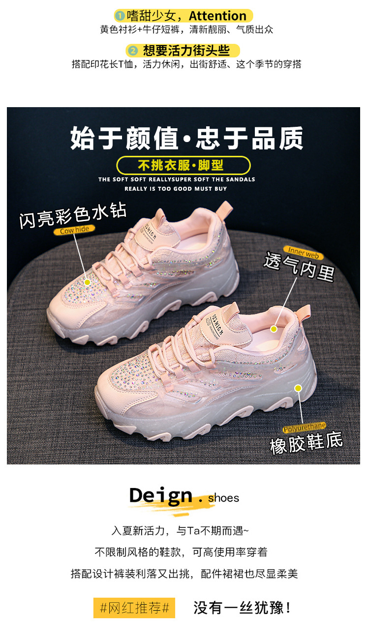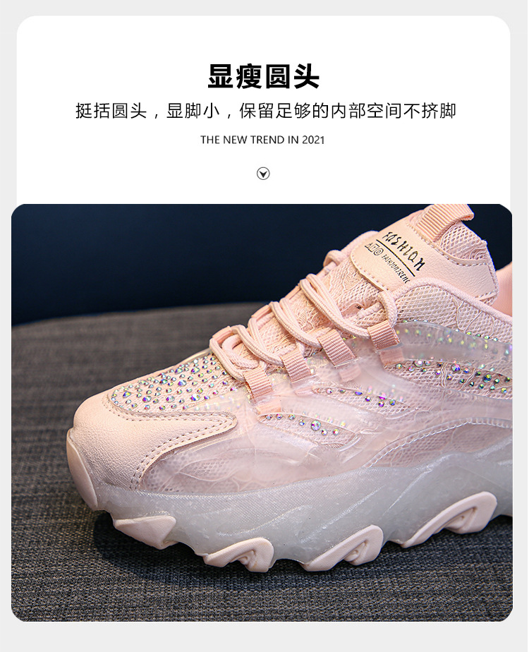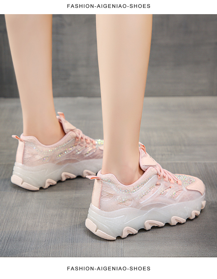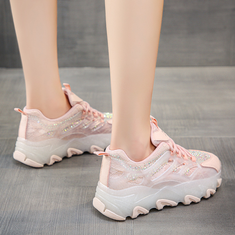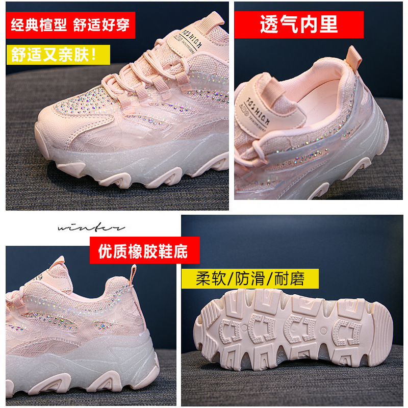 캐주얼 스포츠 메쉬 토레 신발 여성의 봄과 가을 새로운 2024 Rhinestone Jelly 하단 통기성 두꺼운 솔 증가 메쉬 신발스토어 가기