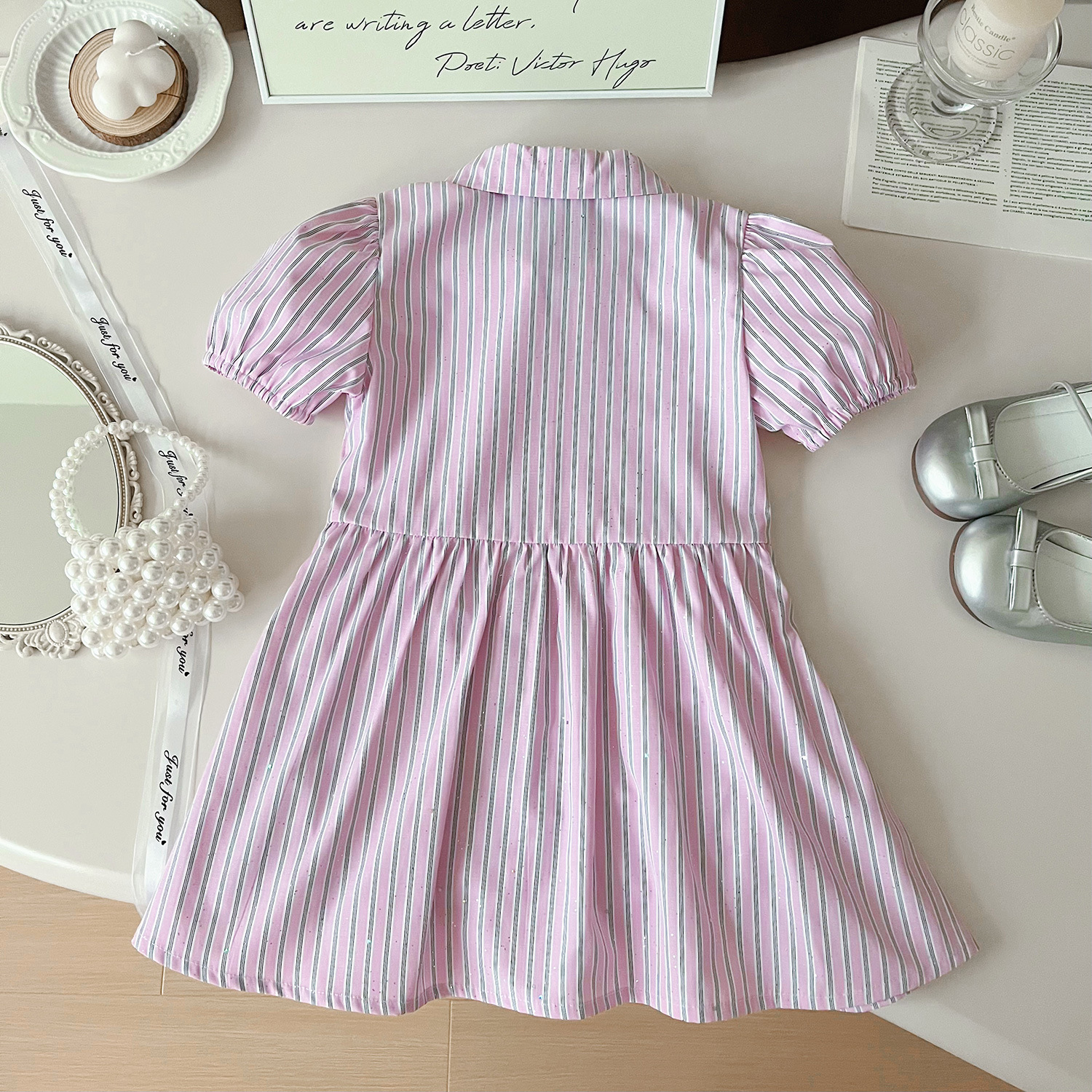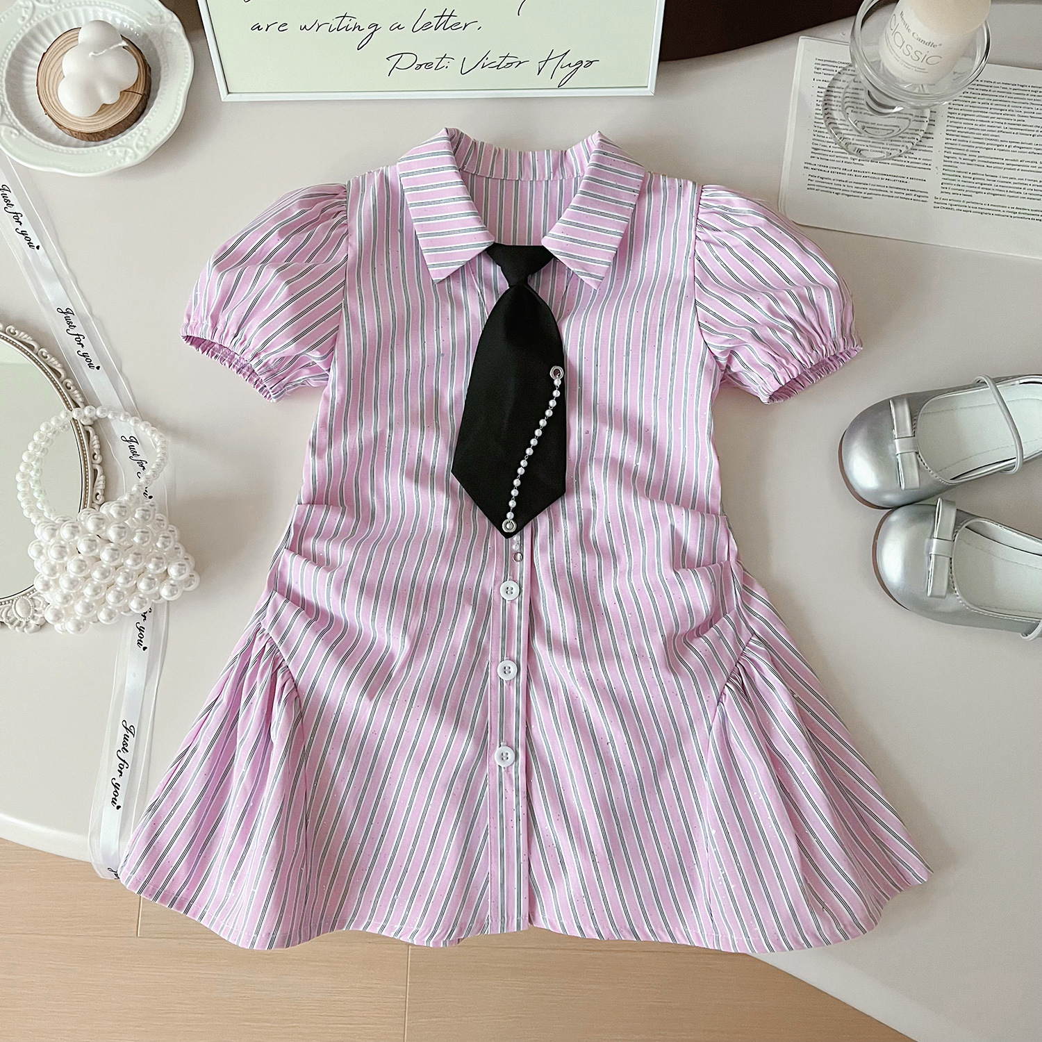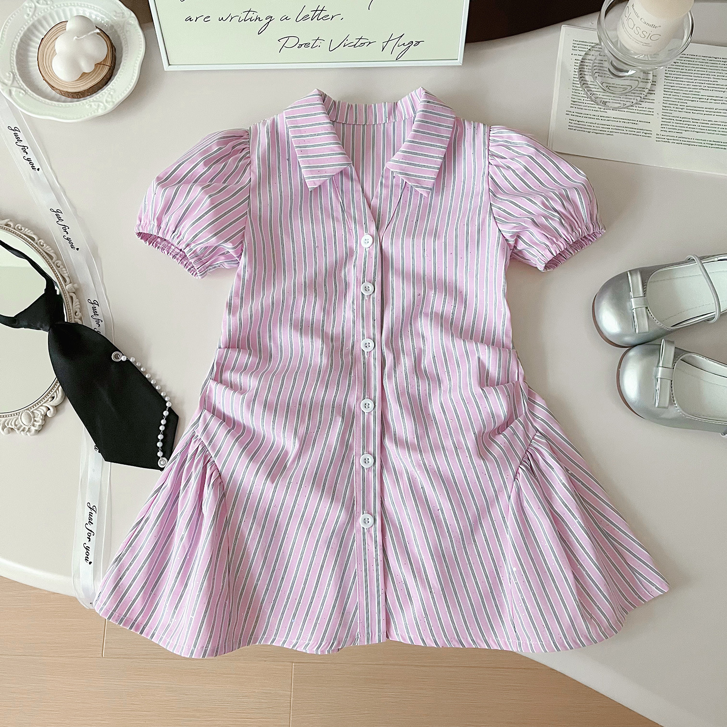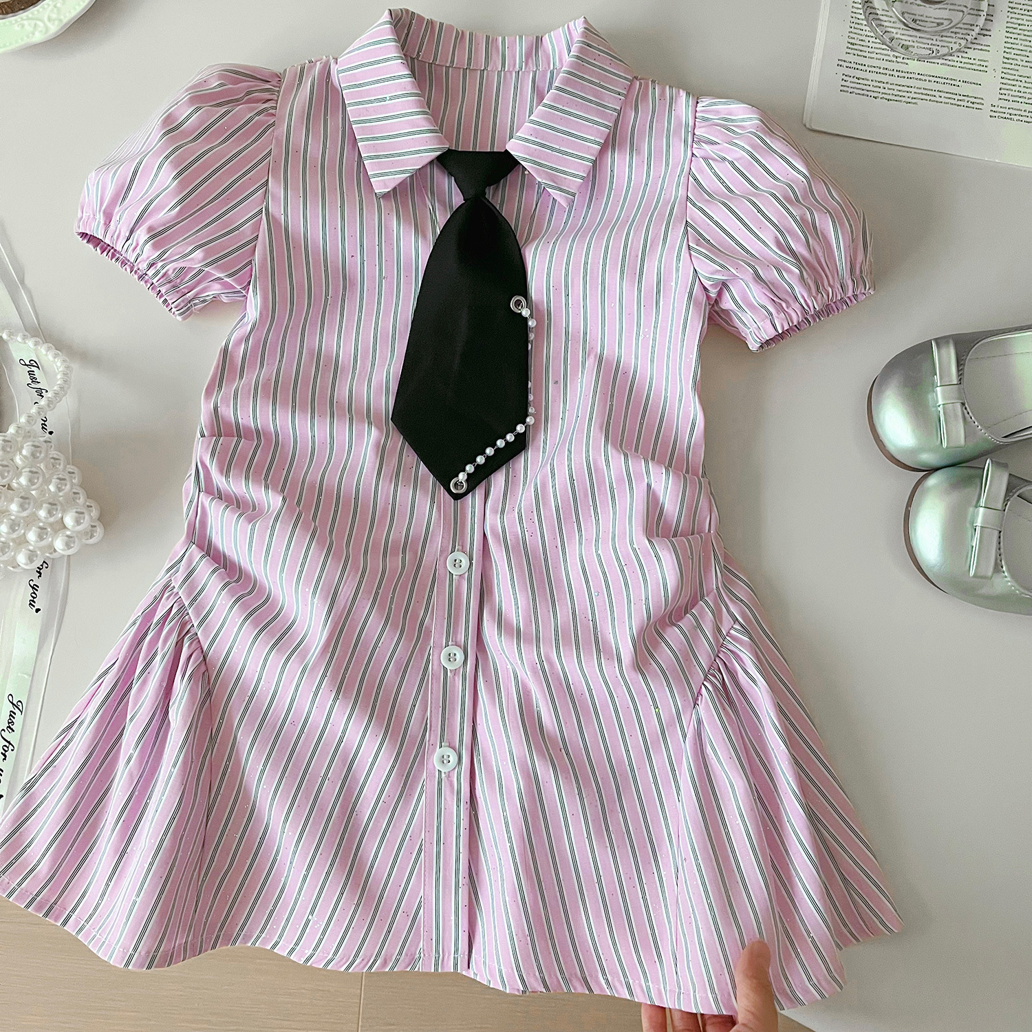 2024 여름 새로운 한국 스타일 소녀의 핑크 줄무늬 셔츠 칼라 짧은 소매 원피스 소녀의 슬림핏 셔츠 원피스스토어 가기