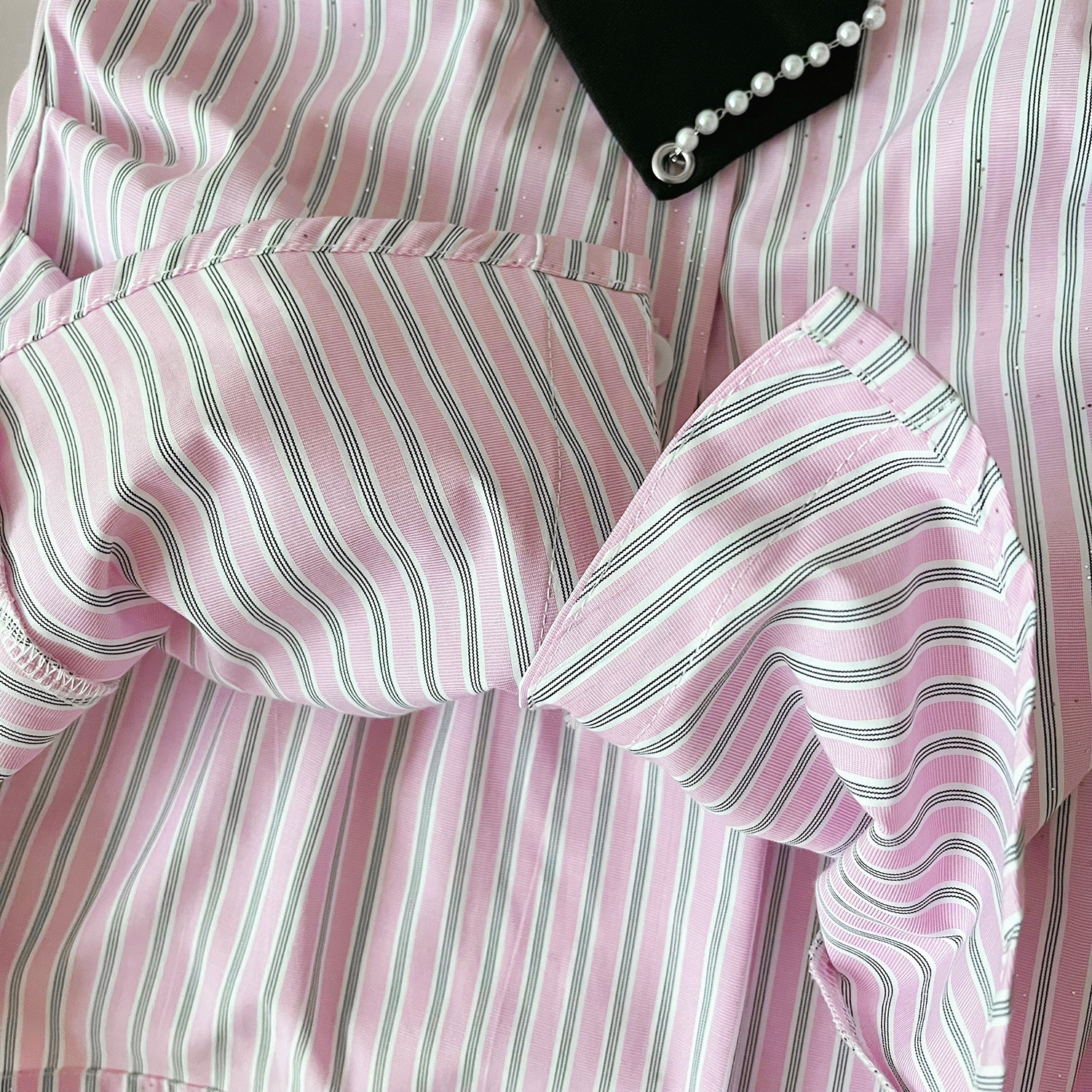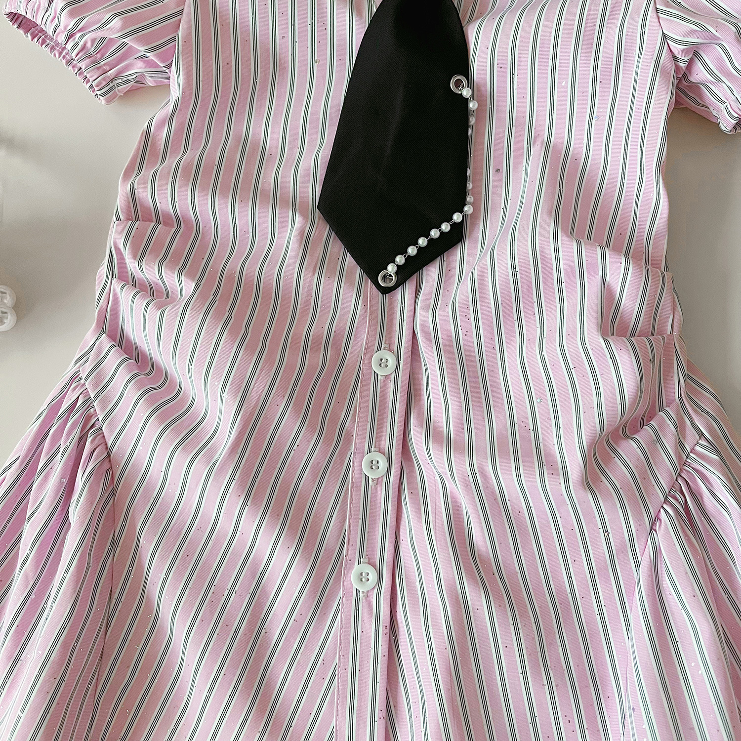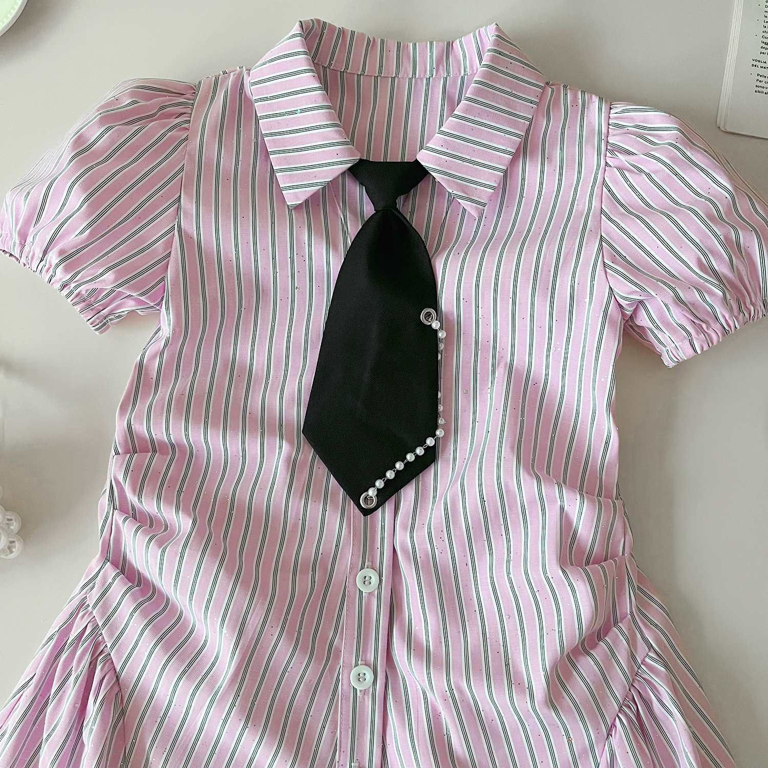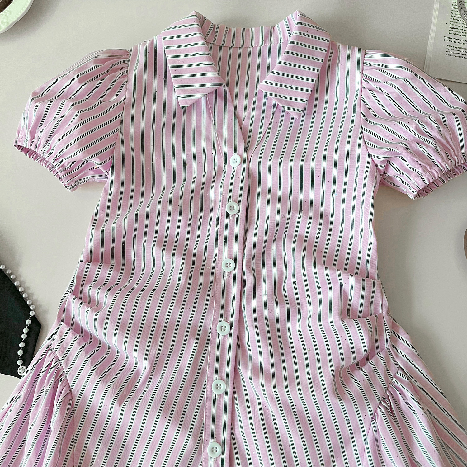 2024 여름 새로운 한국 스타일 소녀의 핑크 줄무늬 셔츠 칼라 짧은 소매 원피스 소녀의 슬림핏 셔츠 원피스스토어 가기