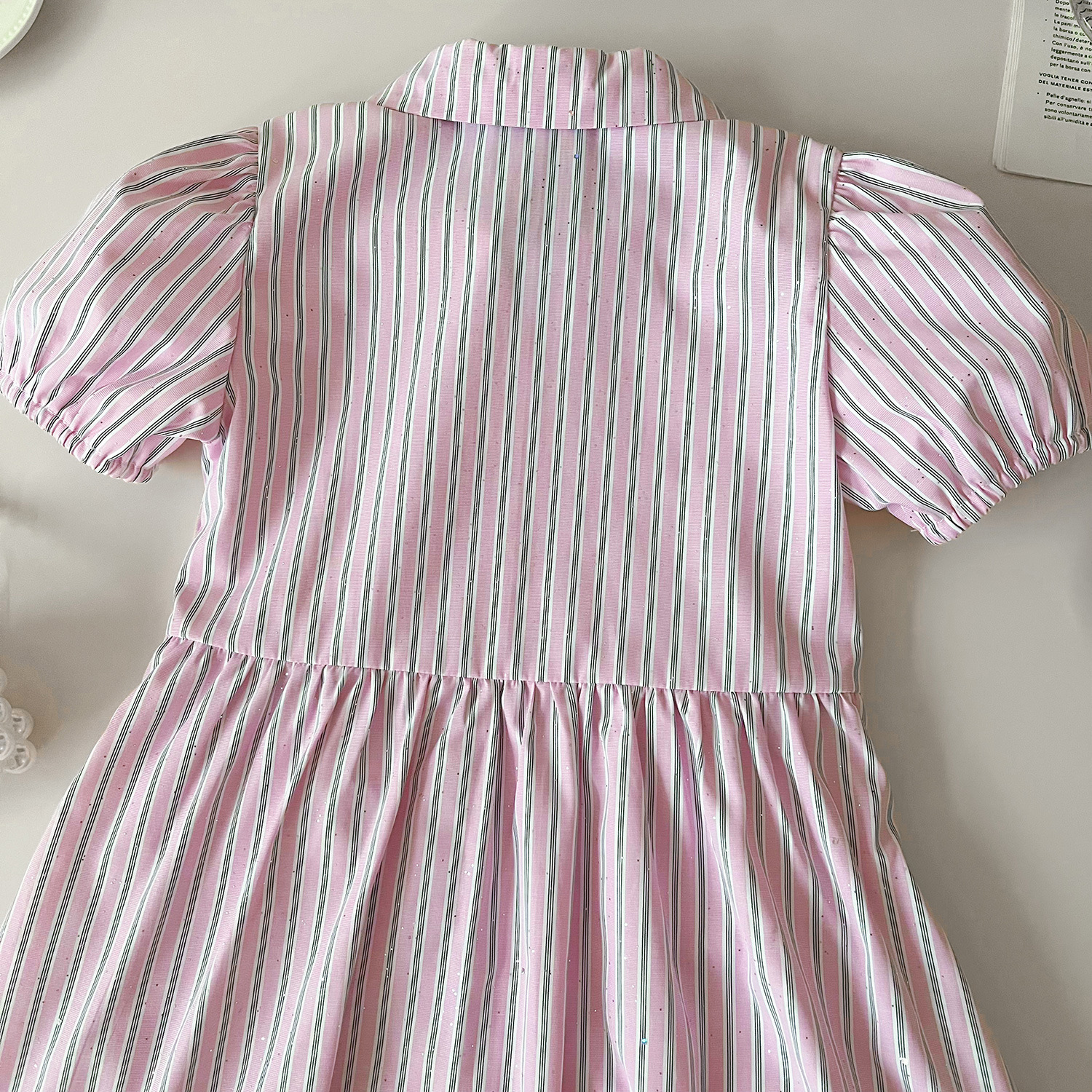 2024 여름 새로운 한국 스타일 소녀의 핑크 줄무늬 셔츠 칼라 짧은 소매 원피스 소녀의 슬림핏 셔츠 원피스