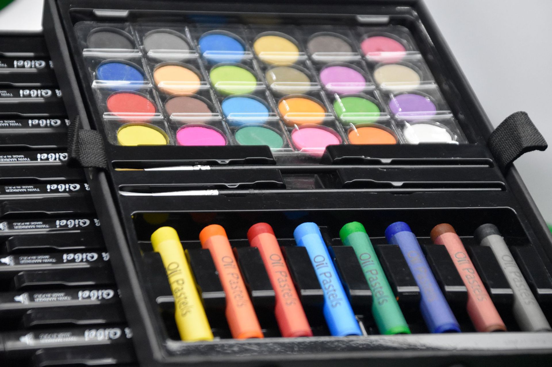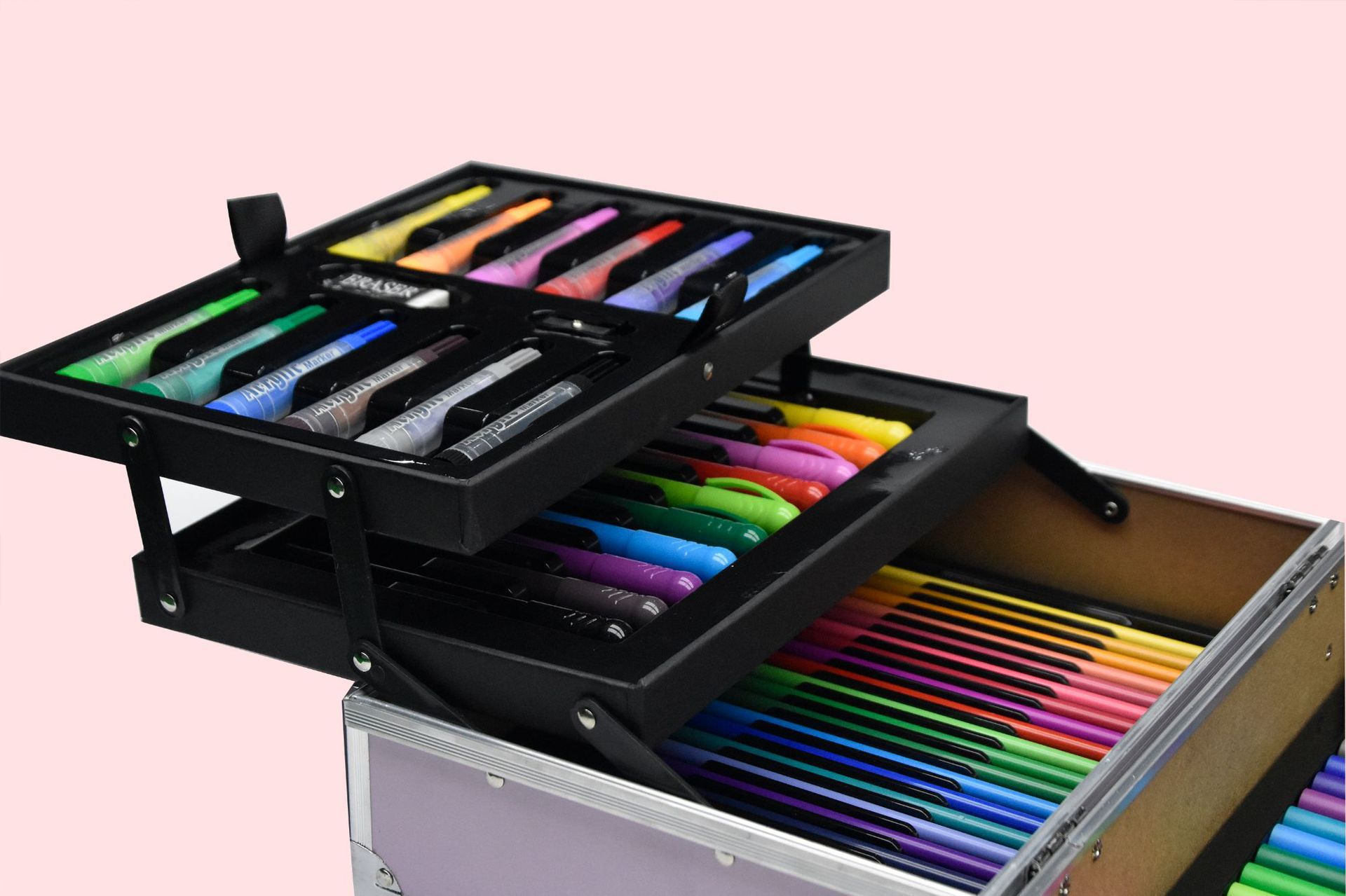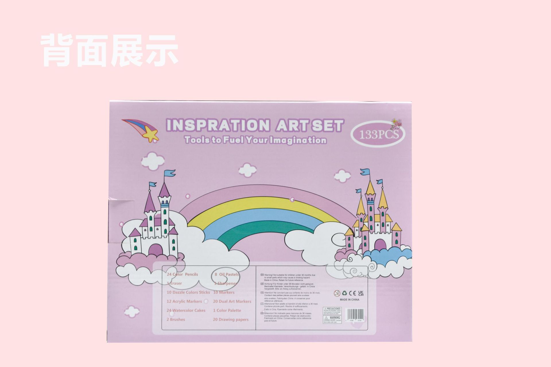 24色彩铅,8色油画棒,1块橡皮,1个卷笔刀,10色炫彩棒,10色马克笔,12色丙烯马克笔,20色双头勾线笔,24色粉饼,1个调色盘,2支描笔,20页绘画本