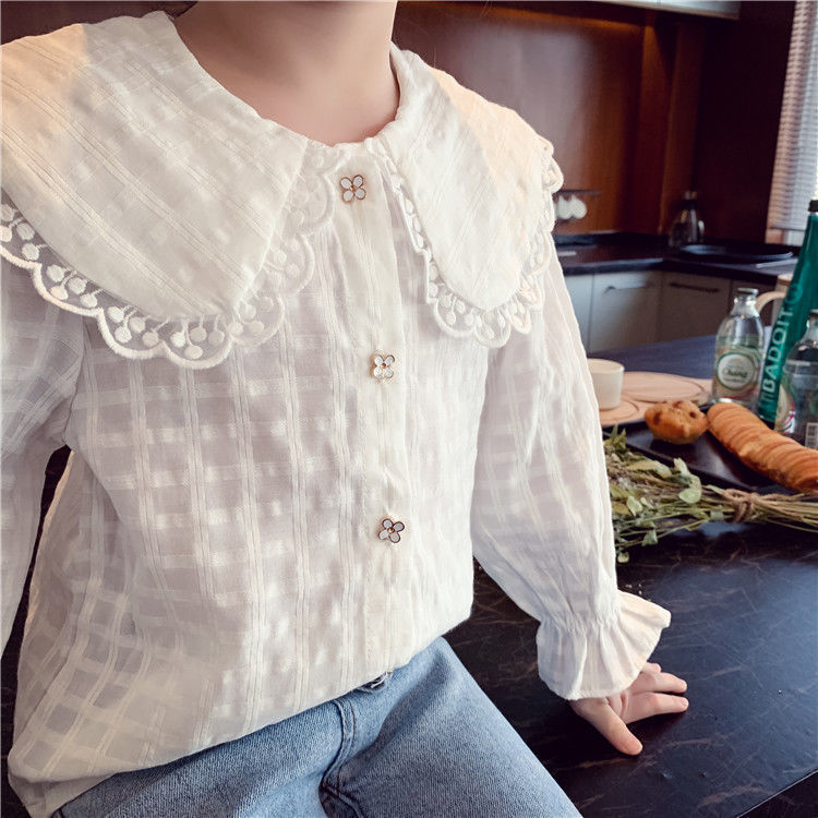 소녀 흰 셔츠 봄 2024 유행 서양식 어린이 봄과 가을 긴 소매 순수한 면베이스 셔츠 단색 트렌디