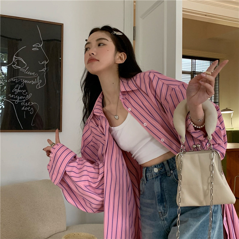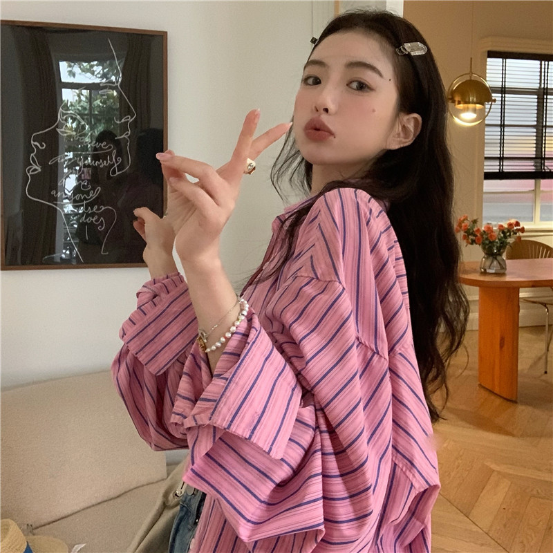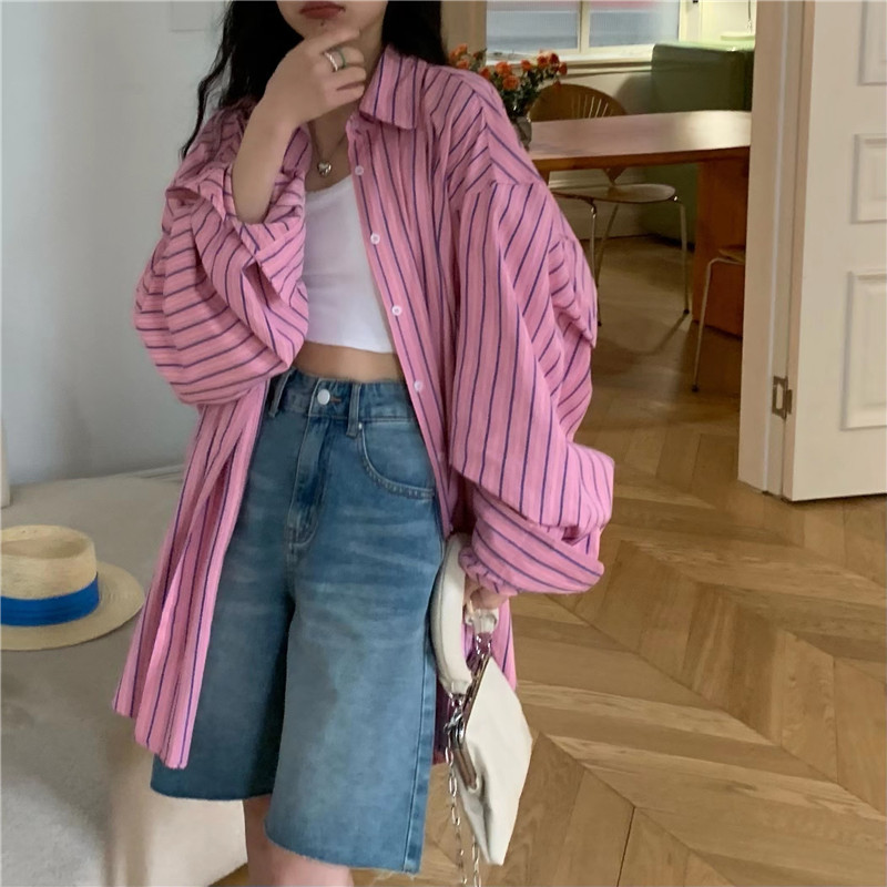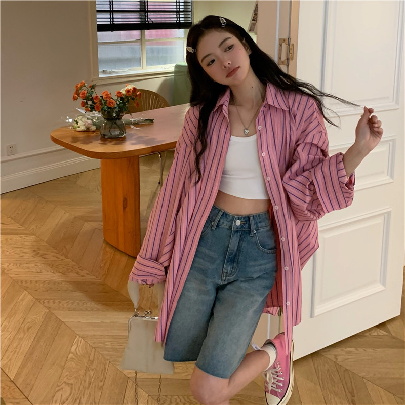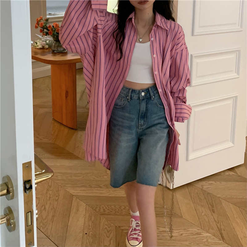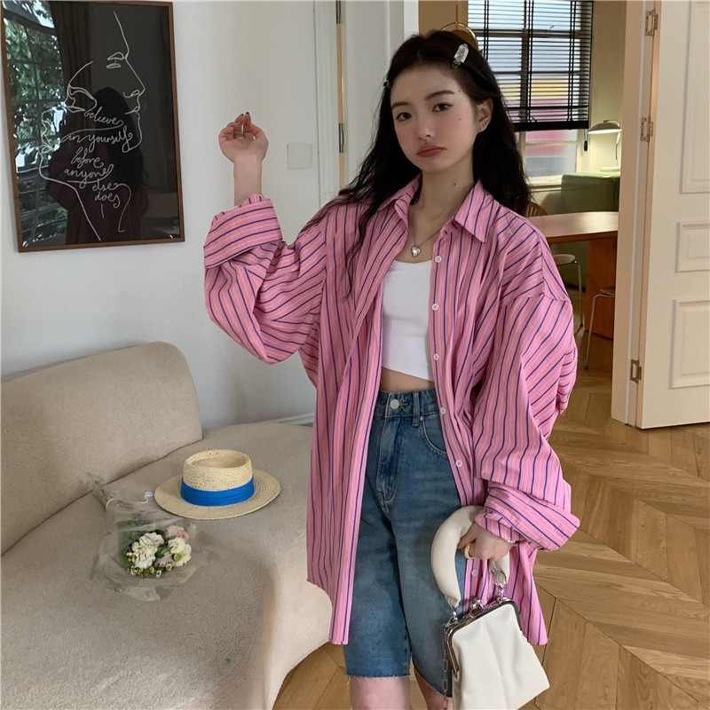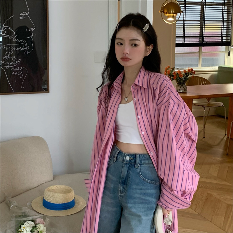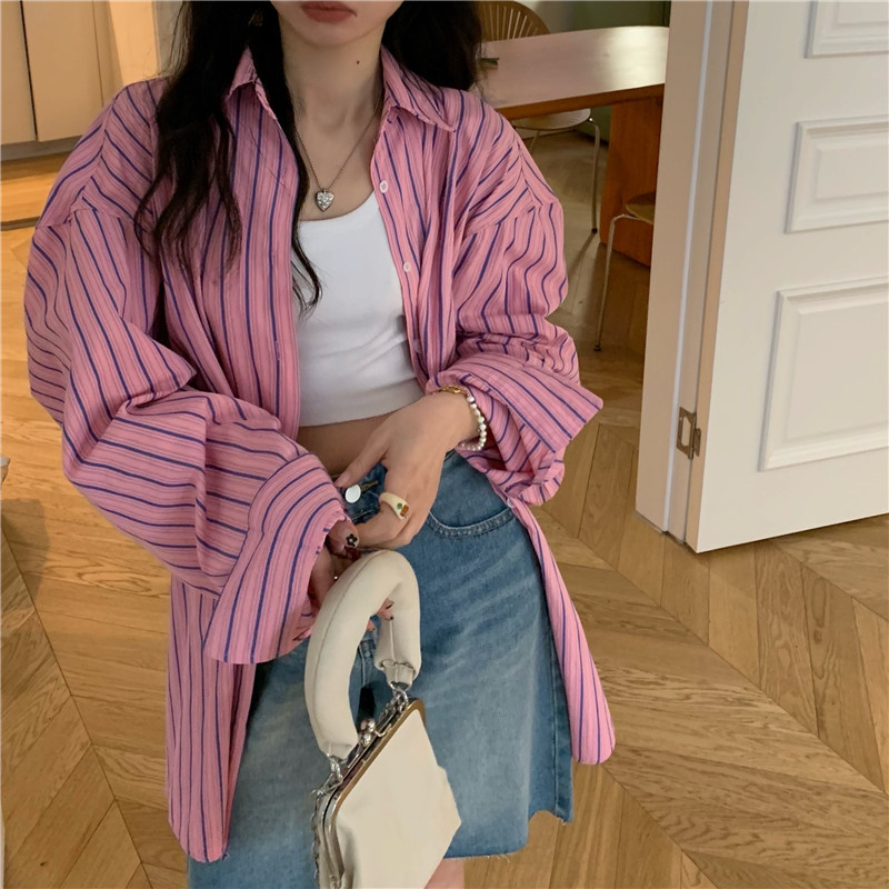 2024 여름 새로운 대비 줄무늬 셔츠 긴 느슨한 얇은 자외선 차단제 카디건 탑스토어 가기