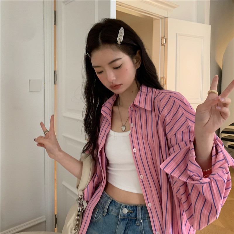 2024 여름 새로운 대비 줄무늬 셔츠 긴 느슨한 얇은 자외선 차단제 카디건 탑