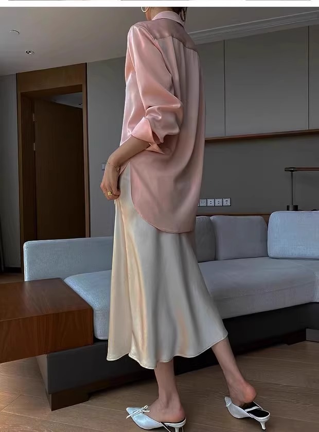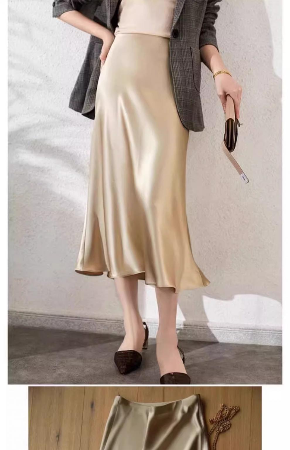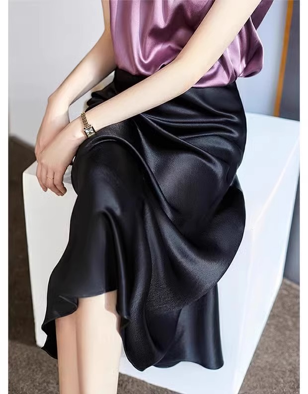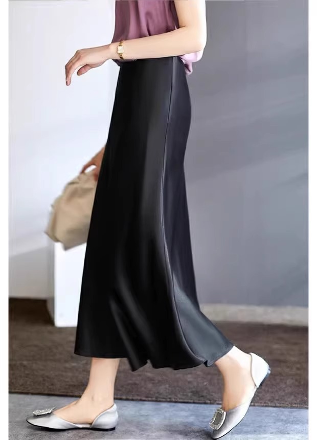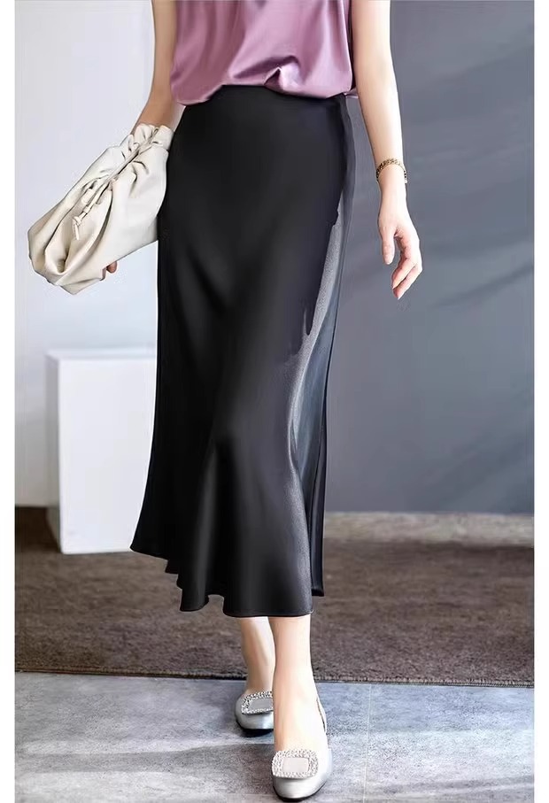 높은 허리 얇은 실키 중간 길이 치마 여자 2024 년 여름 새로운 Acetic Acid Satin Hip A- line Fishtail Skirt