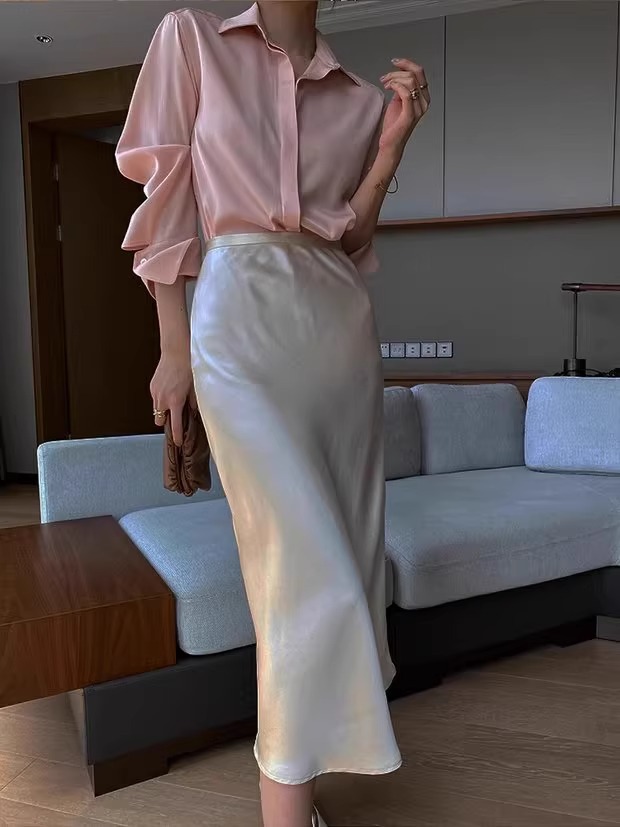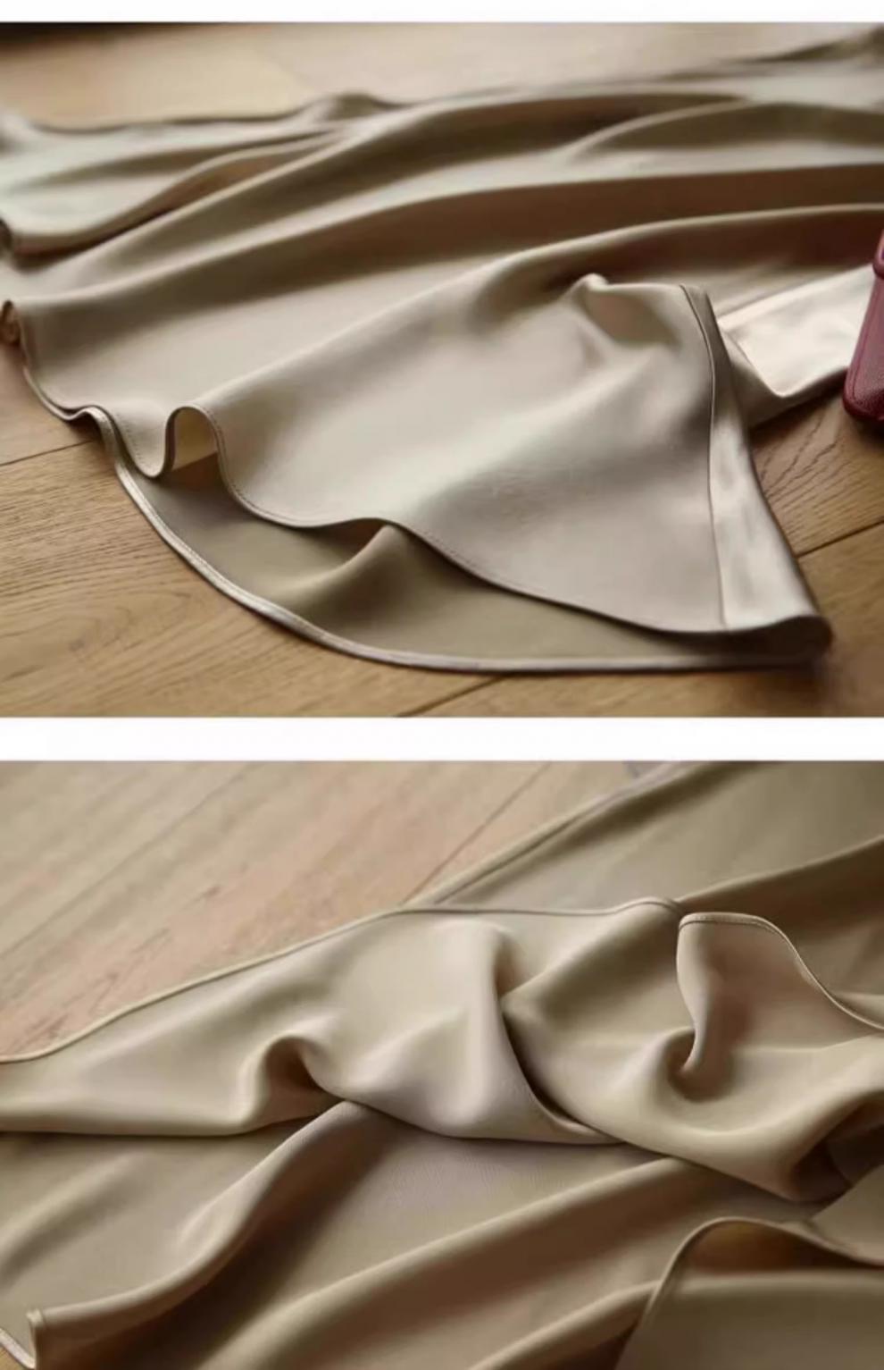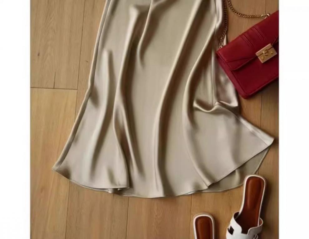 높은 허리 얇은 실키 중간 길이 치마 여자 2024 년 여름 새로운 Acetic Acid Satin Hip A- line Fishtail Skirt스토어 가기