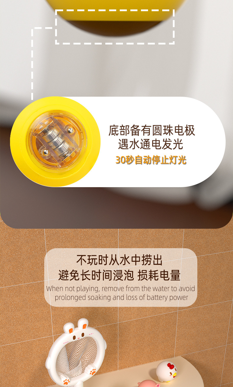 发光球入水后会持续发光一分钟左右,灯灭后需拿出来,重新入水才会继续发光,使用完后一定要取出来擦干,不能长时间浸泡在水里,电池是消耗品,长时间浸泡水里会持续耗电,电力耗完将不再发光