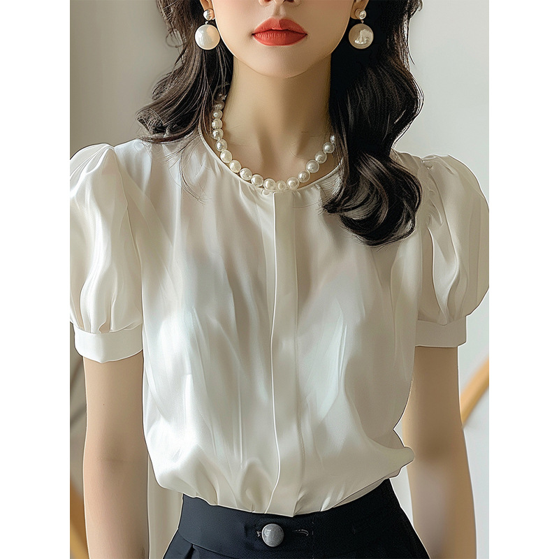 패션 하이 엔드 센스 아름다운 얇은 둥근 목 화이트 어깨 반팔 티셔츠 여성 여름 새로운 우아한 서양 스타일 작은 셔츠