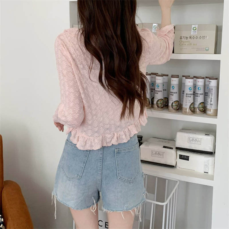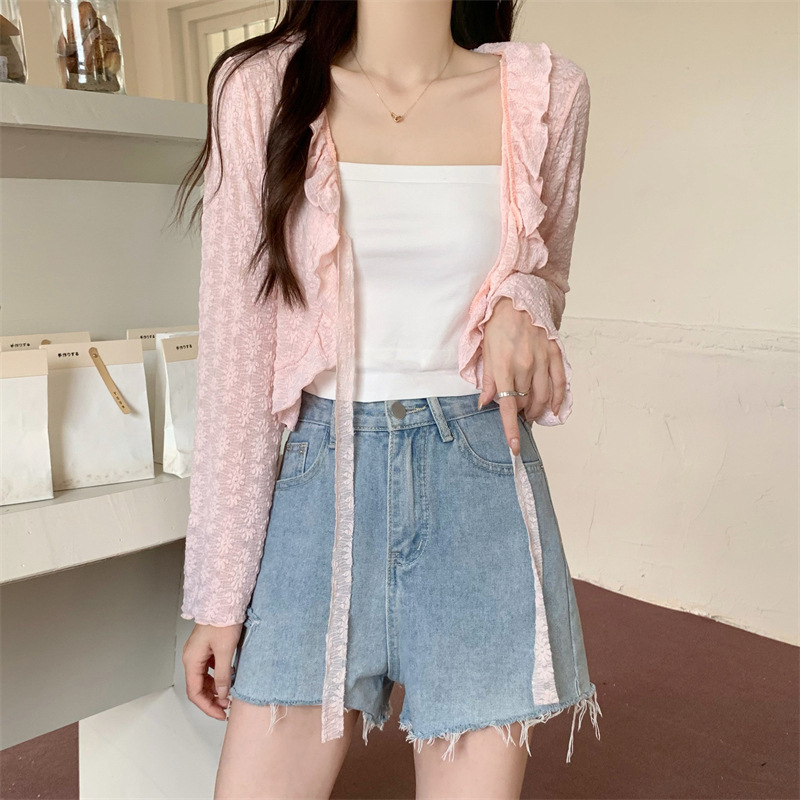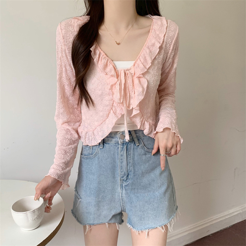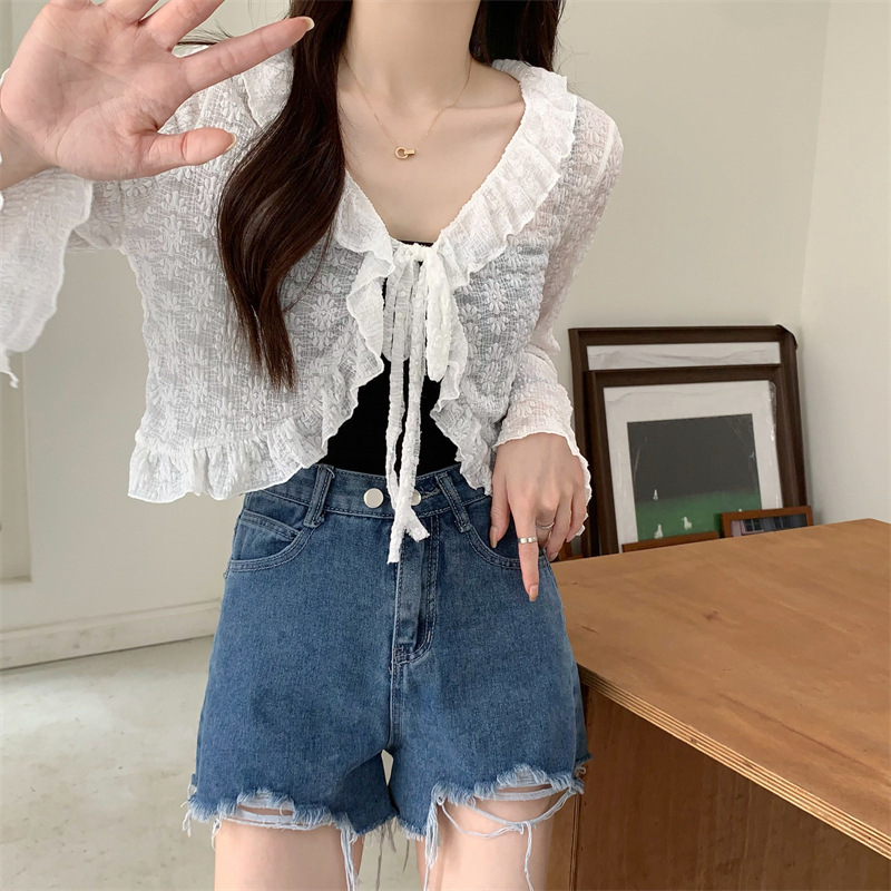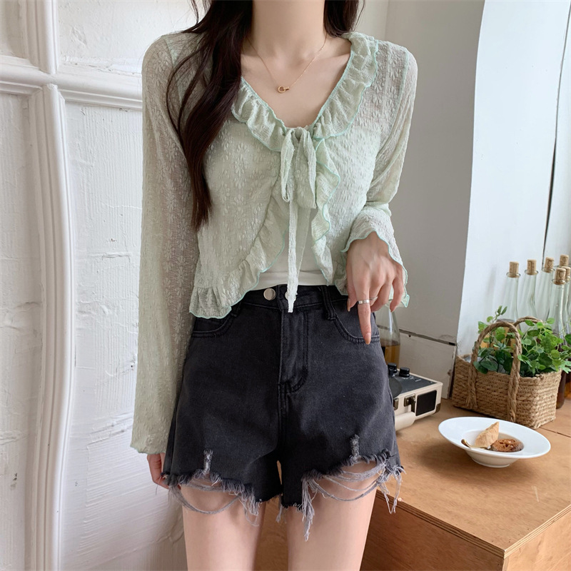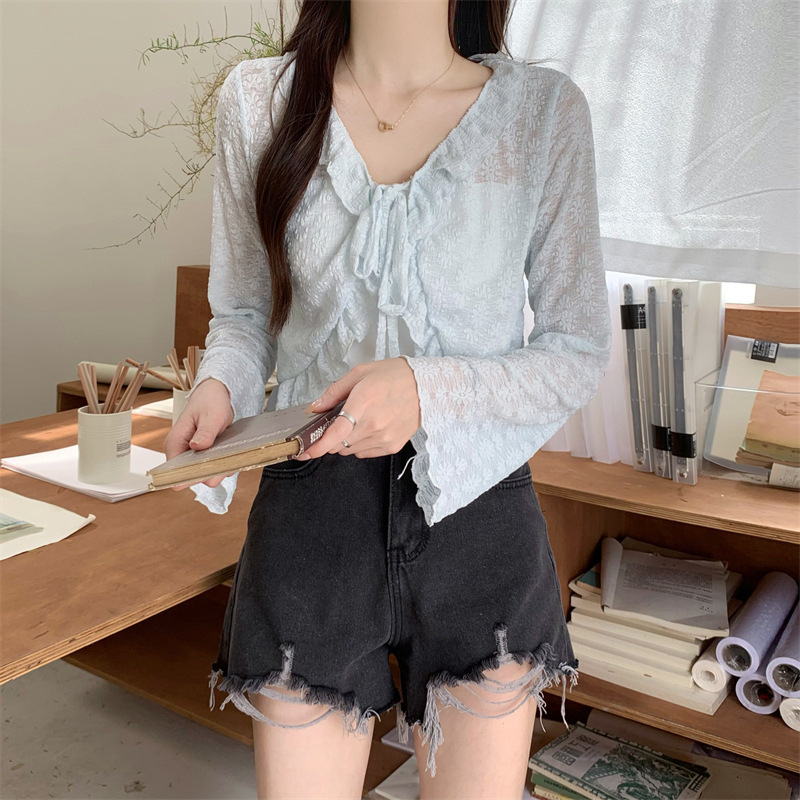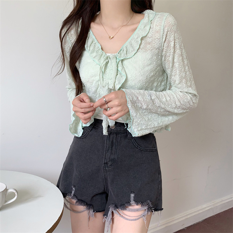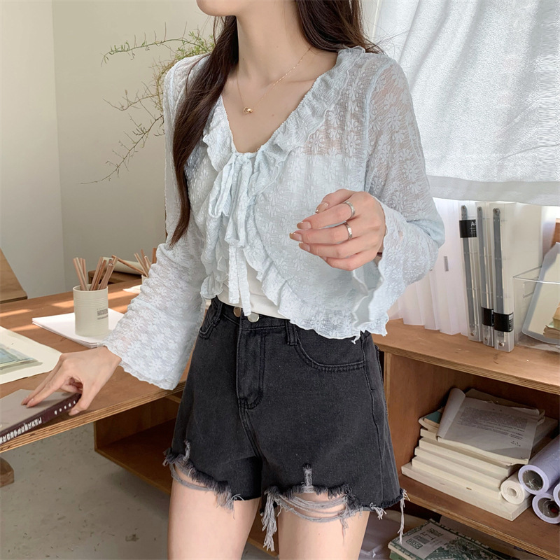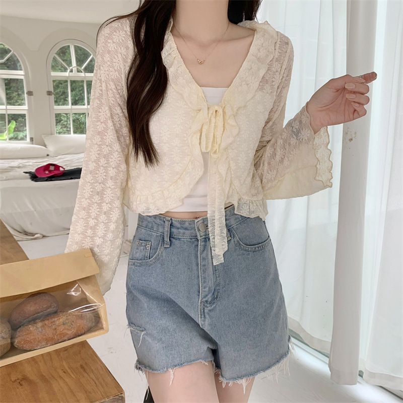 카디건 긴팔 쉬폰 셔츠 재킷 아름다운 세련된 탑 디자인 센스 얇은 레이스 업 선스크린 레이스 여성용 여름