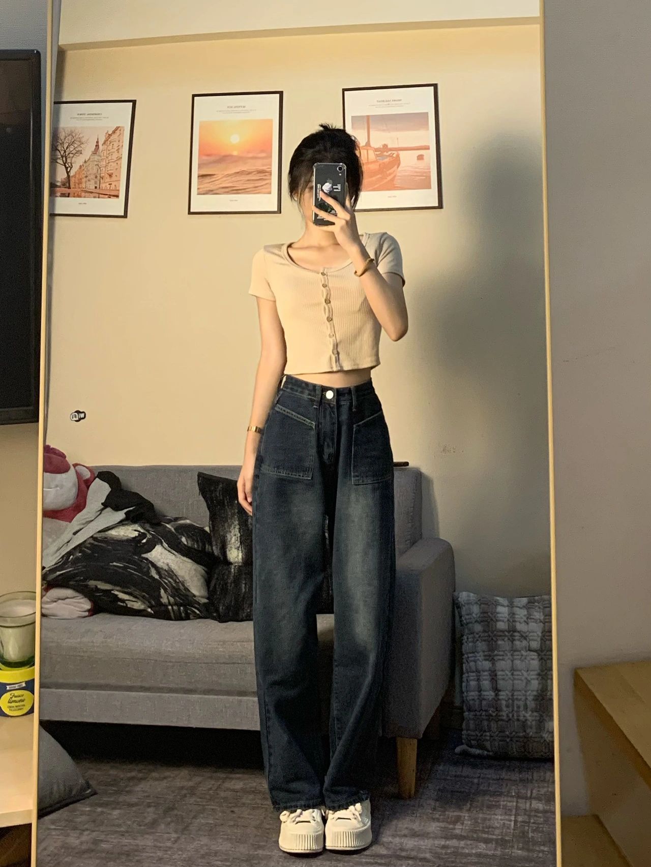 봄과 여름 높은 허리 레트로 바이브 와이드 레그 청바지 여성용 슬리밍 디자인 센스 아메리칸 스타일 하이 스트리트 인 좁은 에디션 Zhizheng