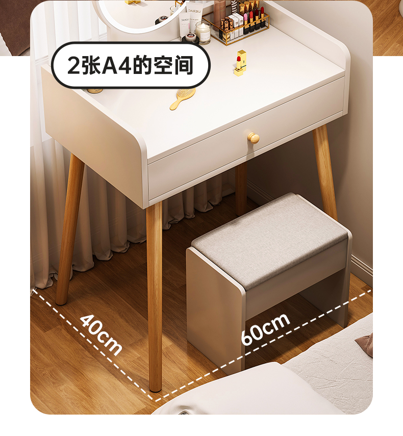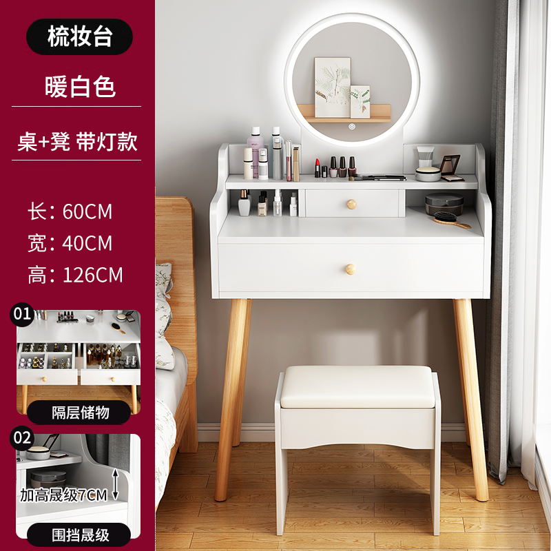 • 【서랍 1개 + 수납장 1개 + LED 조명 + 소프트 쿠션 스툴】 따뜻한 흰색 60cm⚑