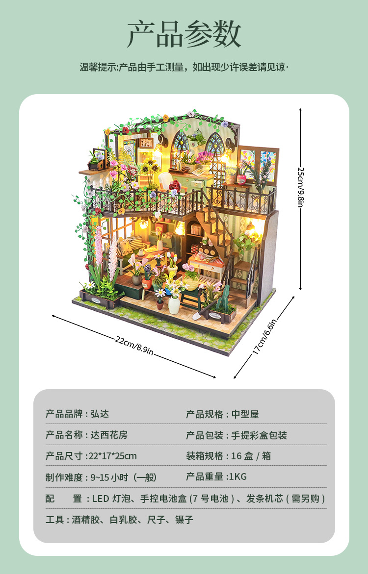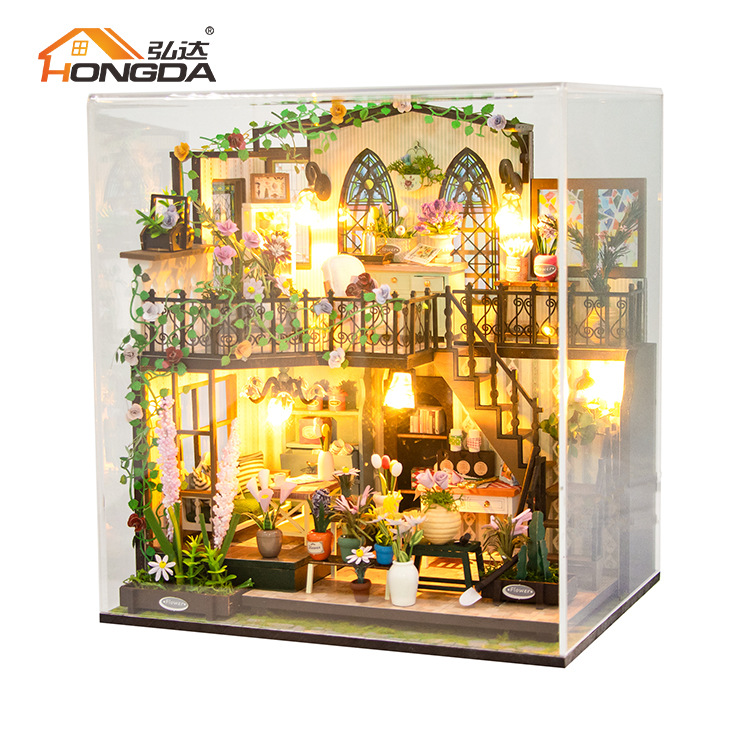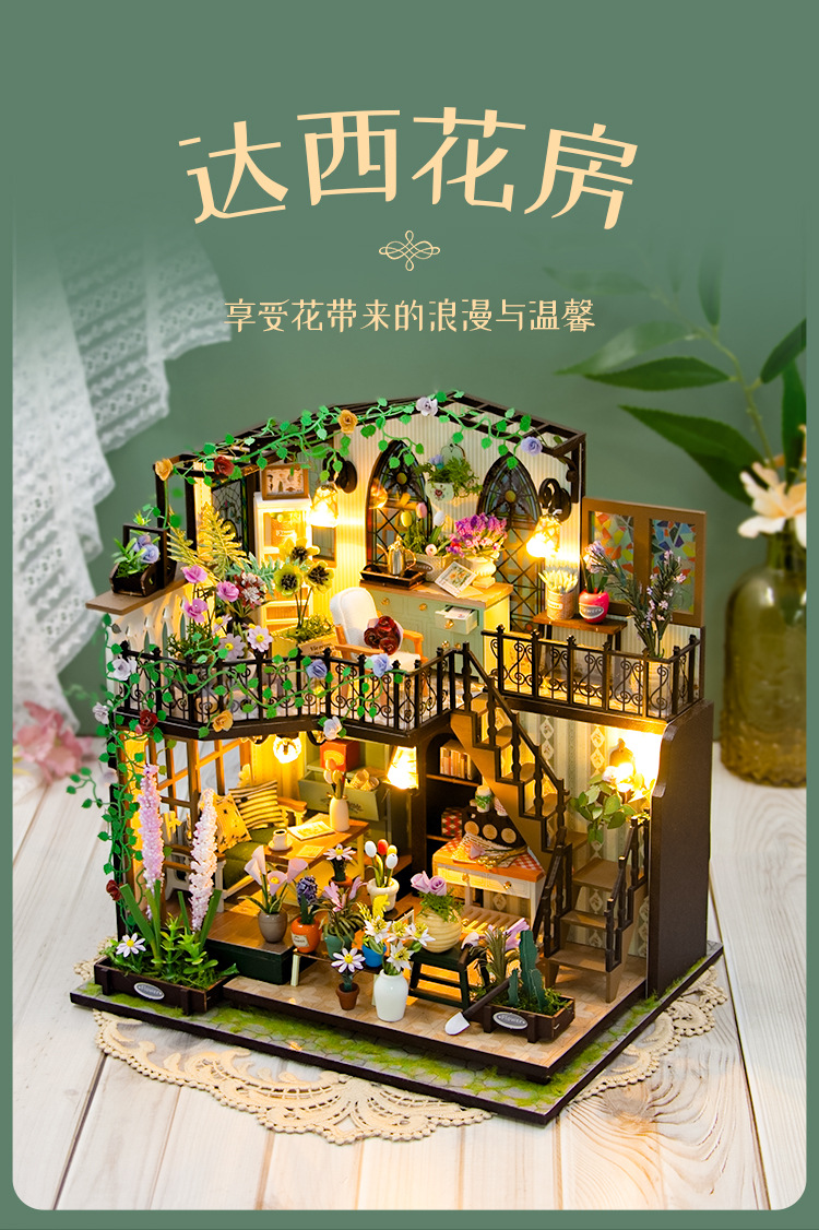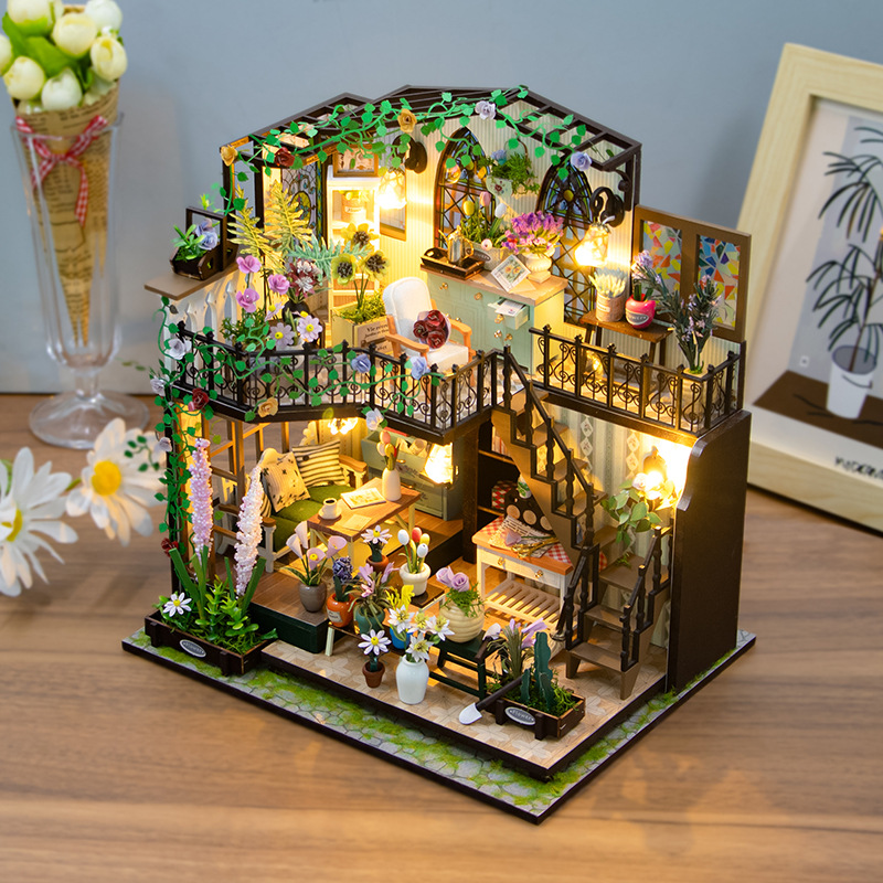 더블 데크 빌라 가든 하우스 미니 3D 빌딩 DIY 수제 나무 인형 집 조립 꽃 집 모델 영어