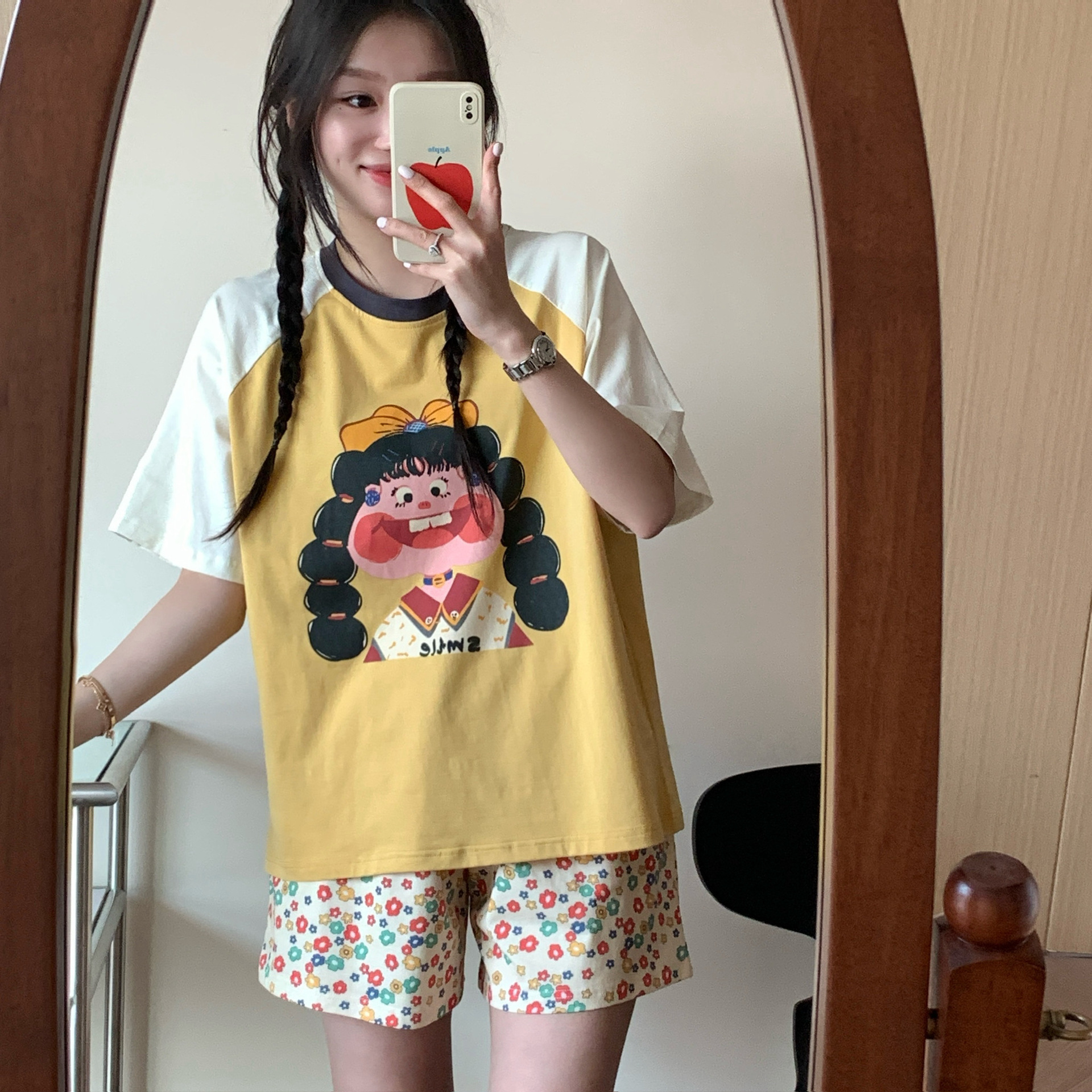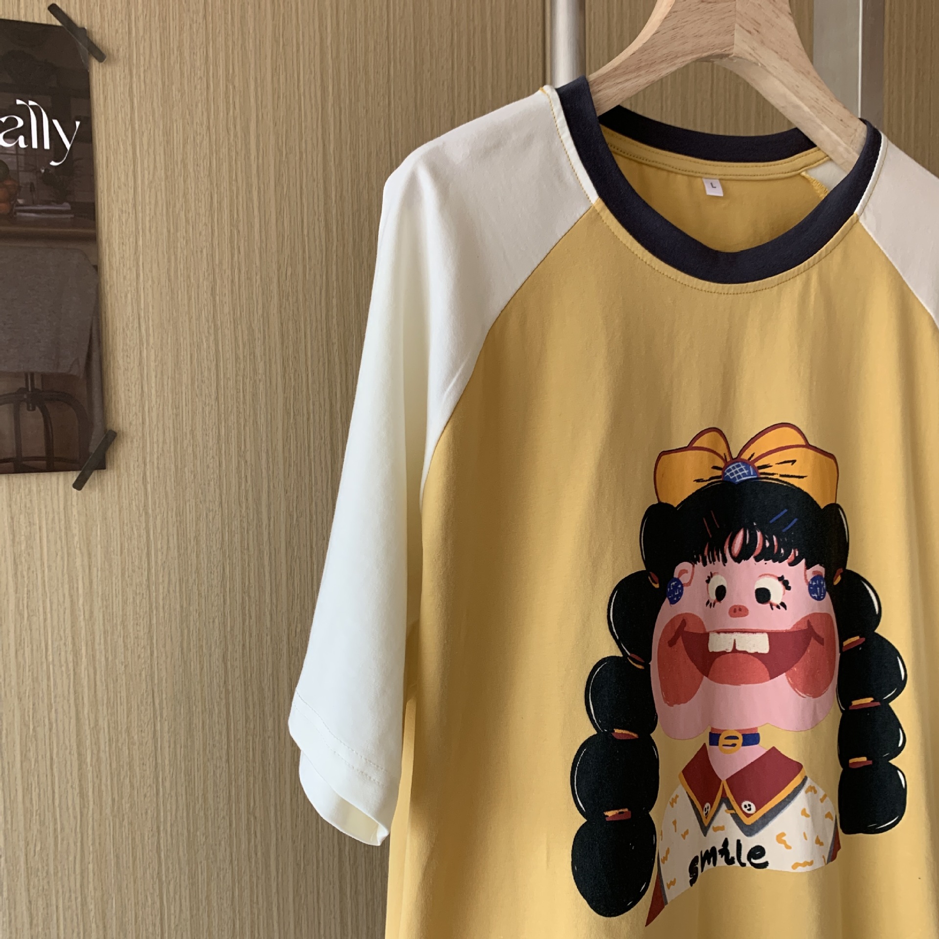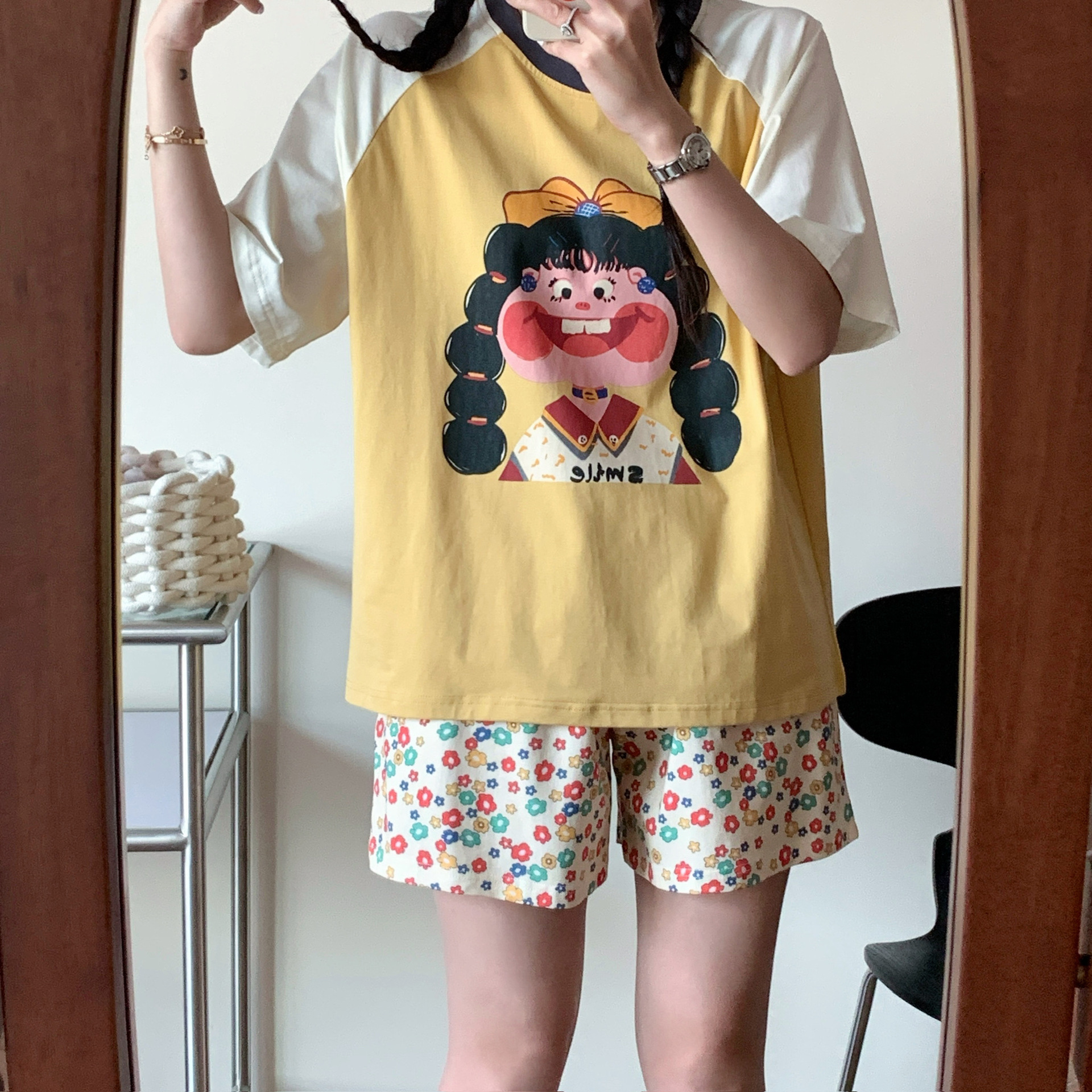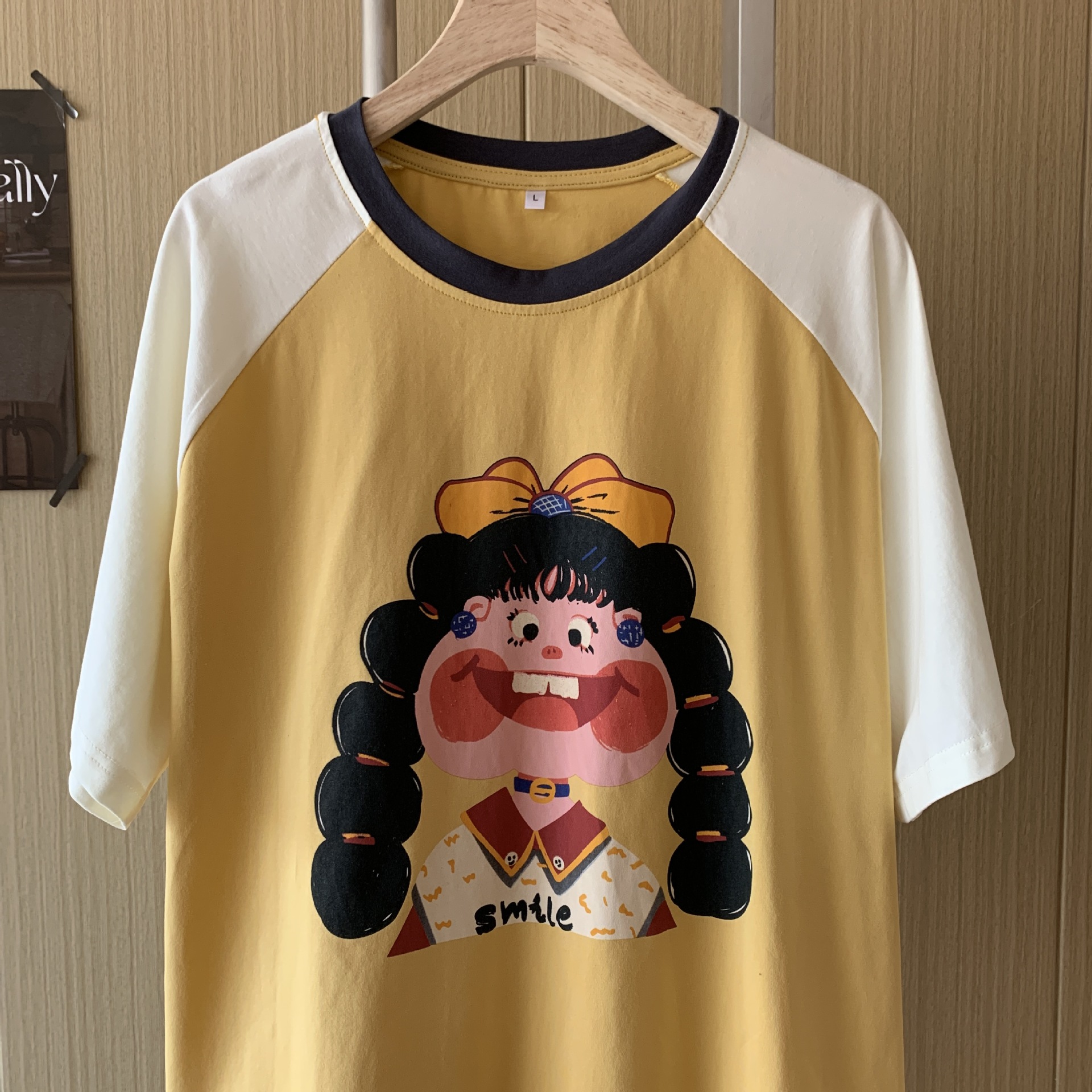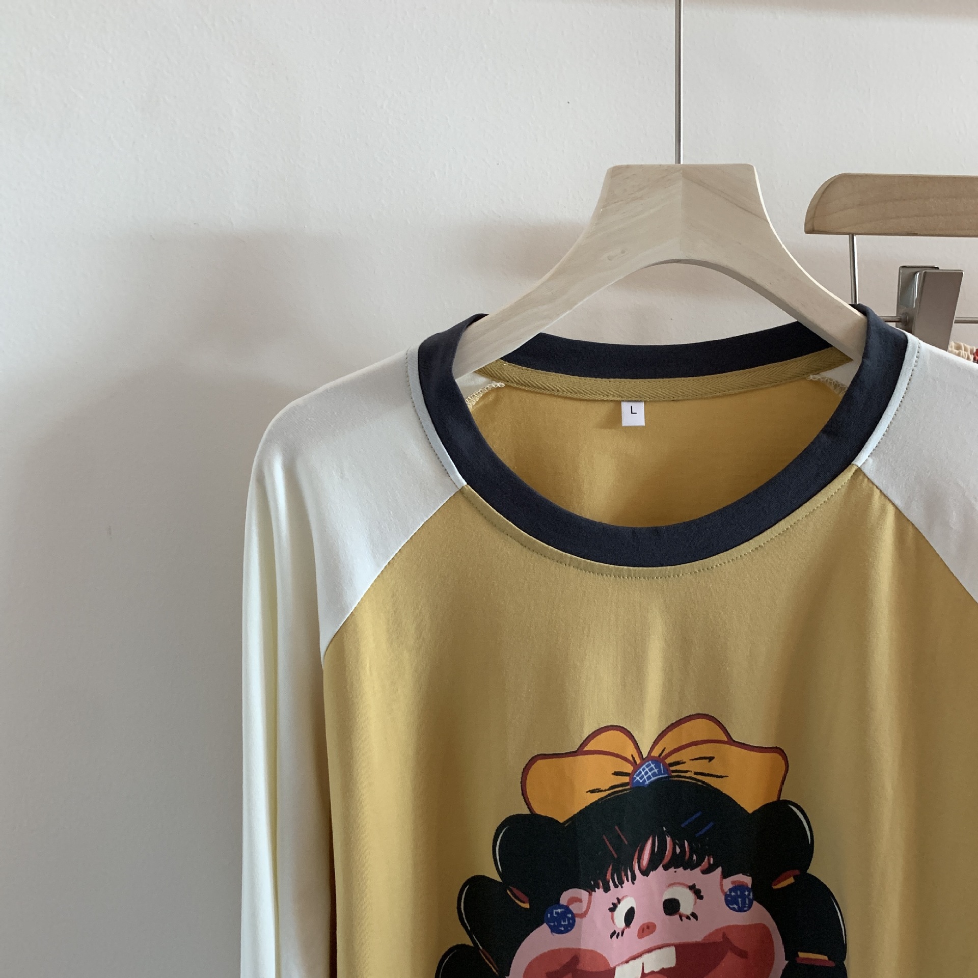 봄과 가을 새로운 Colorblock Raglan 슬리브 만화 머리띠 소녀 큰 이빨 소녀 면 통기성 의상 세트 홈 옷스토어 가기
